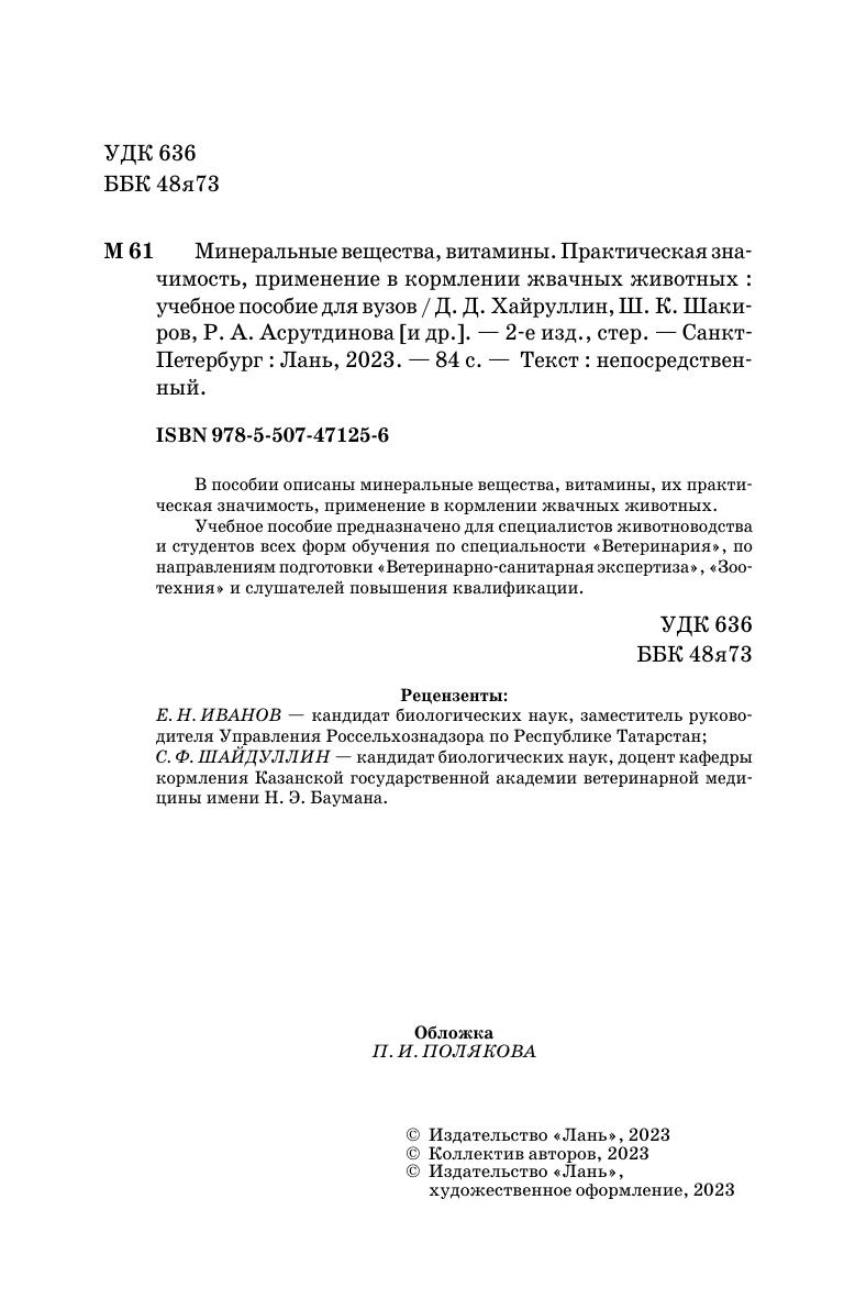В пособии описаны минеральные вещества, витамины, их практическая значимость, применение в кормлении жвачных животных. Учебное пособие предназначено для специалистов животноводства и студентов всех форм обучения по специальности «Ветеринария», по направлениям подготовки «Ветеринарно-санитарная экспертиза», «Зоотехния» и слушателей повышения квалификации.