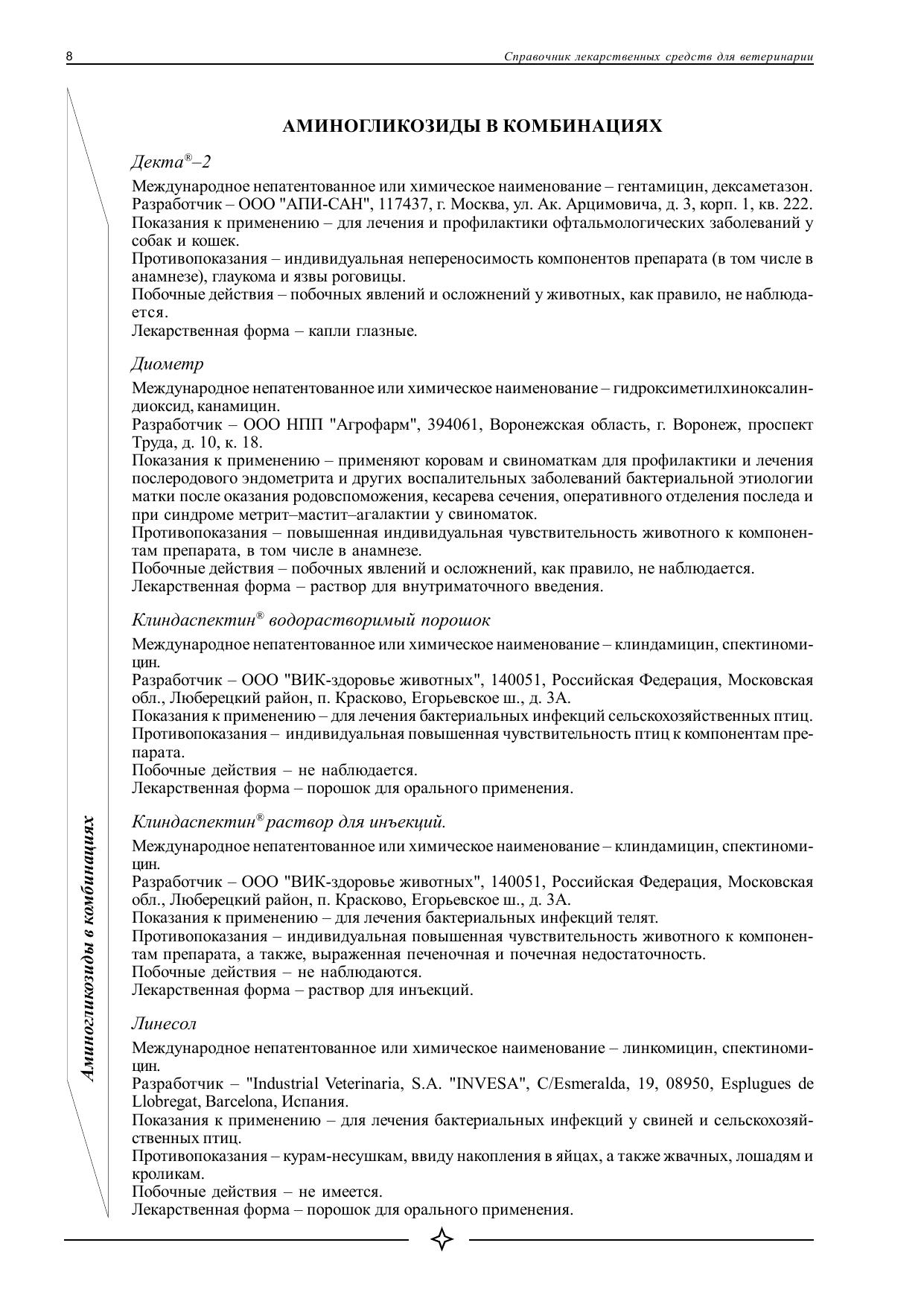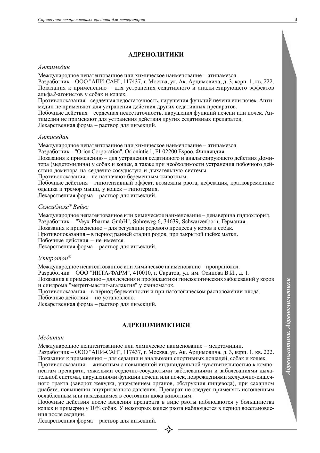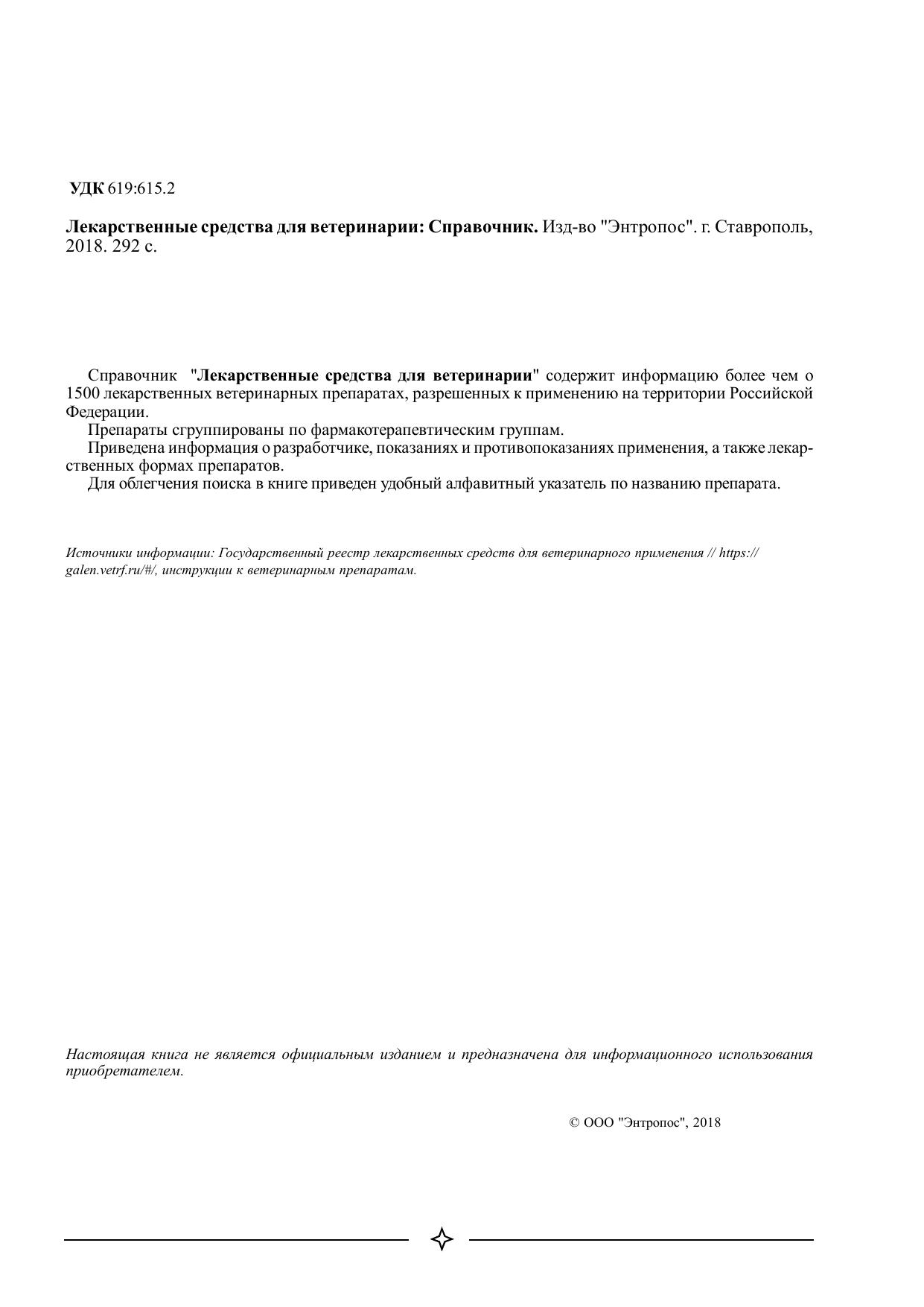 Справочник "Лекарственные средства для ветеринарии" содержит информацию более чем о 1500 лекарственных ветеринарных препаратах, разрешенных к применению на территории Российской Федерации. Препараты сгруппированы по фармакотерапевтическим группам. Приведена информация о разработчике, показаниях и противопоказаниях применения, а также лекарственных формах препаратов.