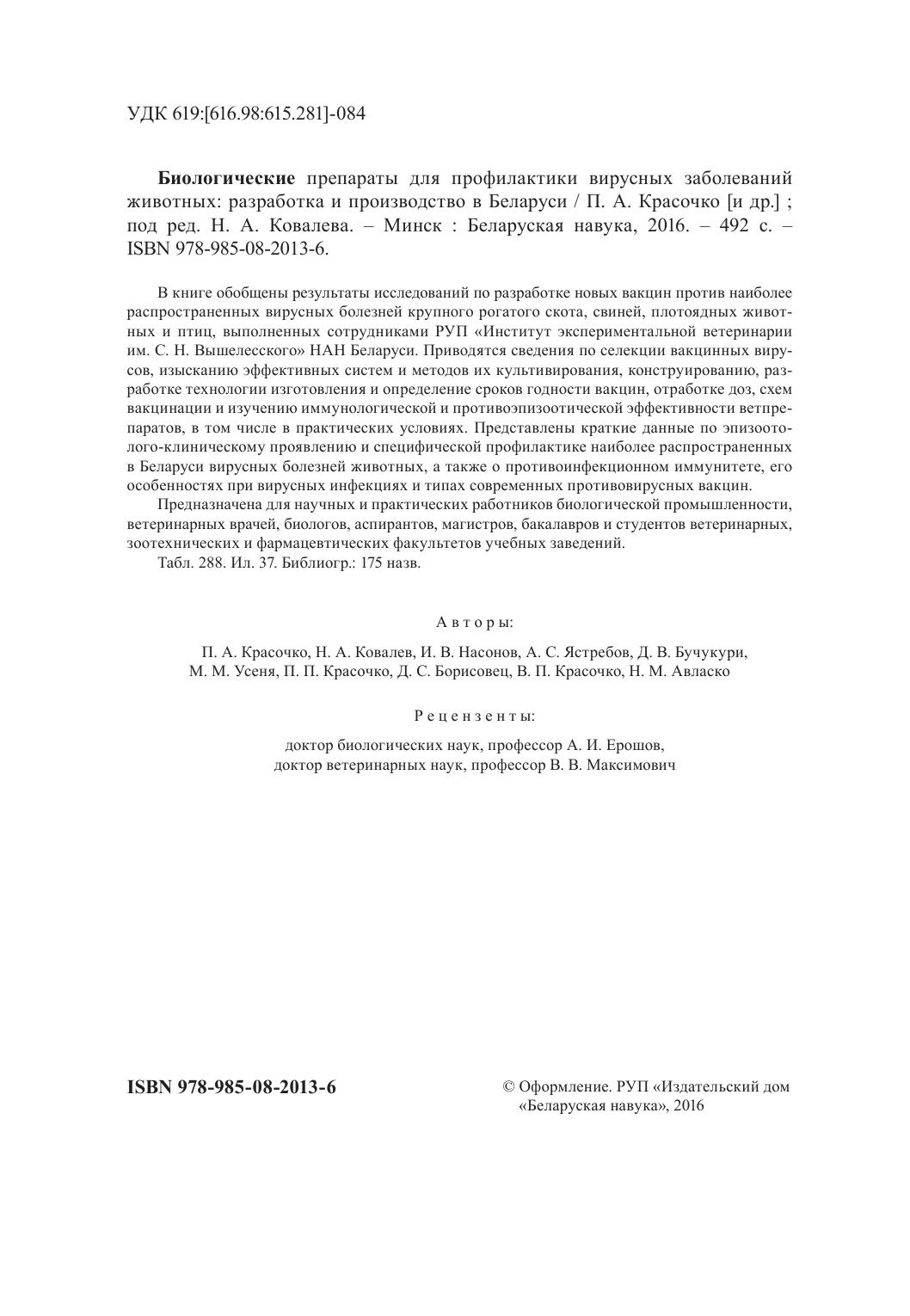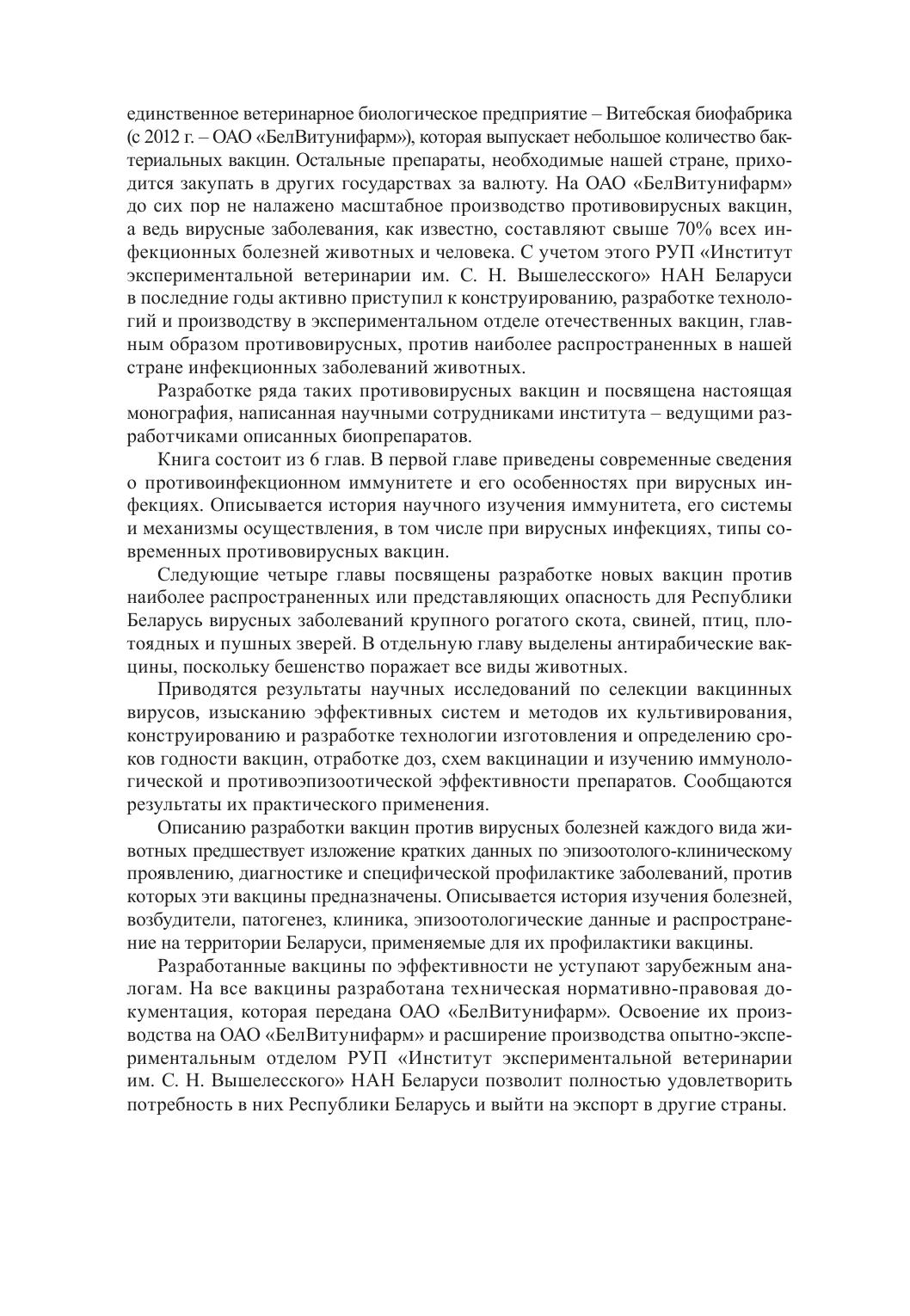 В книге обобщены результаты исследований по разработке новых вакцин против наиболее распространенных вирусных болезней крупного рогатого скота, свиней, плотоядных животных и птиц, выполненных сотрудниками РУП «Институт экспериментальной ветеринарии им. С. Н. Вышелесского» НАН Беларуси. Приводятся сведения по селекции вакцинных вирусов, изысканию эффективных систем и методов их культивирования, конструированию, разработке технологии изготовления и определение сроков годности вакцин, отработке доз, схем вакцинации и изучению иммунологической и противоэпизоотической эффективности ветпрепаратов, в том числе в практических условиях. Представлены краткие данные по эпизоотолого-клиническому проявлению и специфической профилактике наиболее распространенных в Беларуси вирусных болезней животных, а также о противоинфекционном иммунитете, его особенностях при вирусных инфекциях и типах современных противовирусных вакцин. Предназначена для научных и практических работников биологической промышленности, ветеринарных врачей, биологов, аспирантов, магистров, бакалавров и студентов ветеринарных, зоотехнических и фармацевтических факультетов учебных заведений.