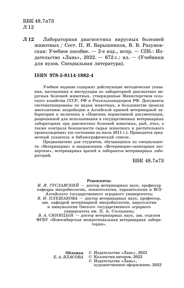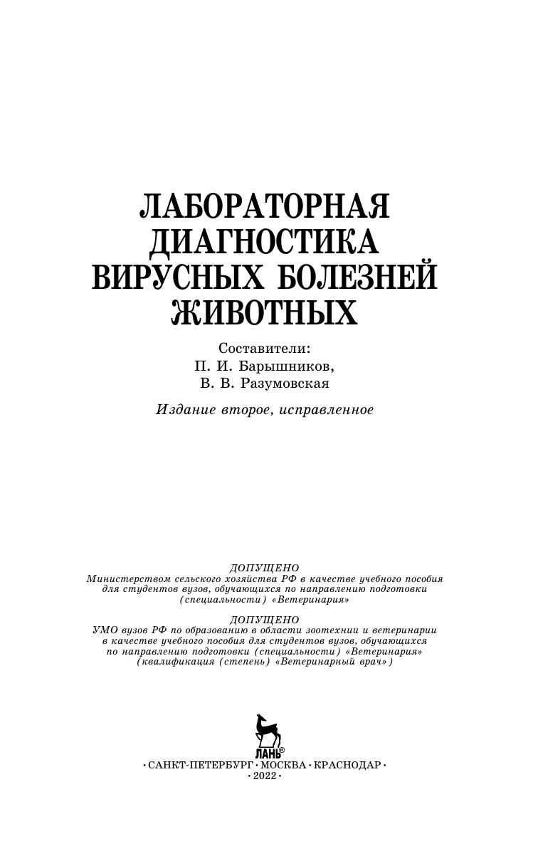 Учебное издание содержит действующие методические указания, наставления и инструкции по лабораторной диагностике вирусных болезней животных, утвержденные Министерством сельского хозяйства СССР, РФ и Россельхознадзором РФ. Документы систематизированы по видам животных, в большинстве прошли многолетнюю аппробацию в Алтайской краевой ветеринарной лаборатории и включены в «Перечень нормативной документации, разрешенной для использования в государственных ветеринарных лабораториях при диагностике болезней животных, рыб, пчел, а также контроля безопасности сырья животного и растительного происхождения» (по состоянию на июль 2011 г.). Приводятся предметный указатель и библиографический список. Предназначено для студентов, обучающихся по специальности «Ветеринария» и направлению «Ветеринарно-санитарная экспертиза», ветеринарных врачей и лаборантов ветеринарных лабораторий.