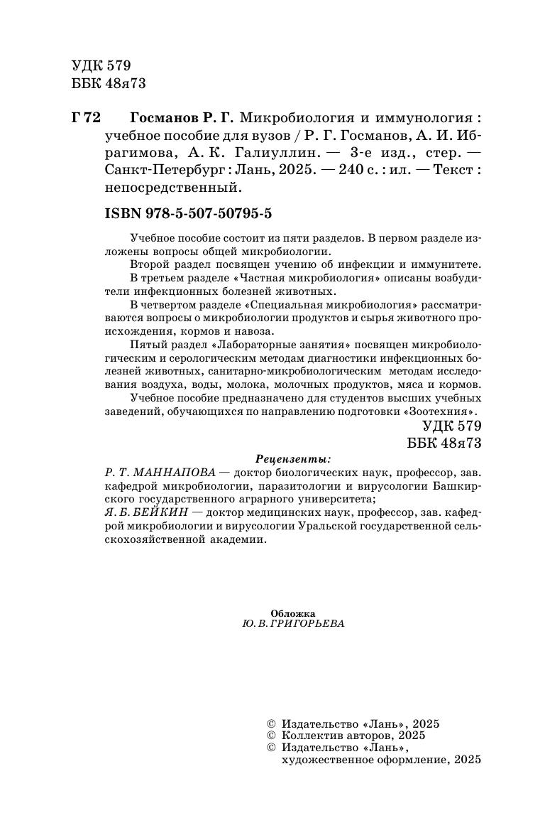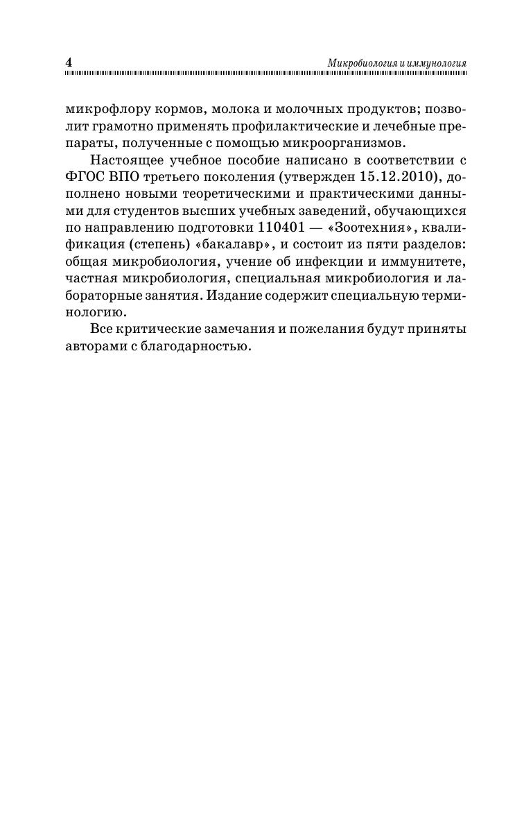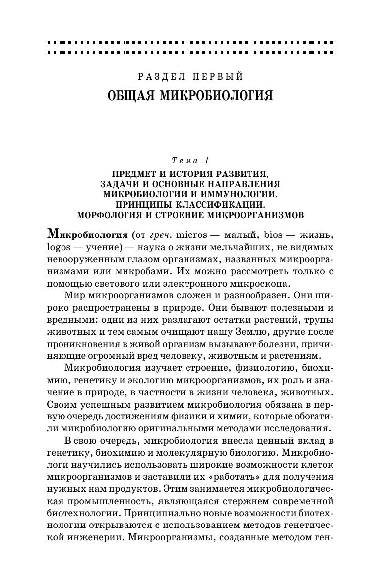 Учебное пособие состоит из пяти разделов. В первом разделе изложены вопросы общей микробиологии: описаны морфология, строение, физиология, экология, наследственность и изменчивость микроорганизмов, а также превращения микроорганизмами соединений азота и углерода, формы взаимоотношений в мире микробов, антибиотики, влияние факторов внешней среды на микроорганизмы. Второй раздел посвящен учению об инфекции и иммунитете. В третьем разделе описаны возбудители инфекционных болезней животных. В четвертом разделе рассматриваются вопросы о микробиологии продуктов и сырья животного происхождения, кормов и навоза. Пятый раздел - лабораторные занятия - посвящен микробиологическим и серологическим методам диагностики инфекционных болезней животных, санитарномикробиологическим методам исследования воздуха, воды, молока, молочных продуктов, мяса и кормов.