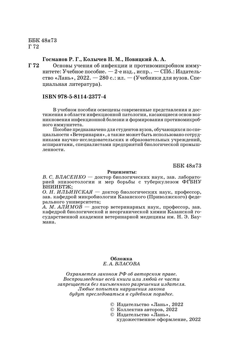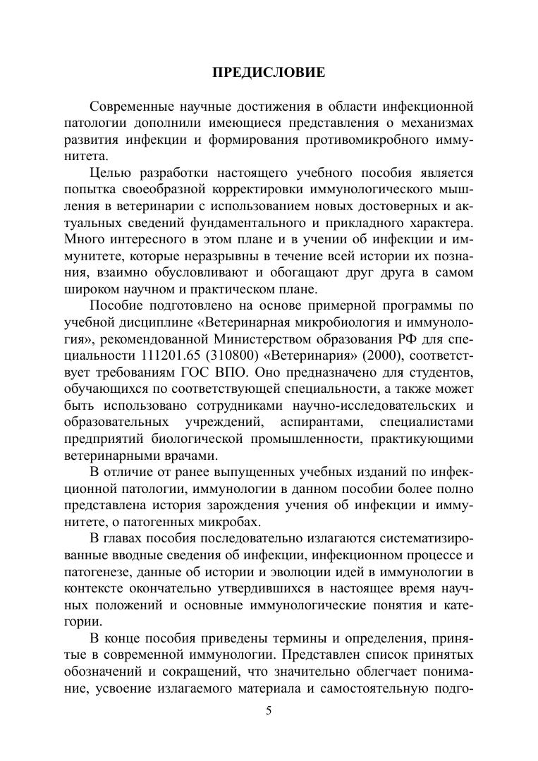 В учебном пособии освещены современные представления и достижения в области инфекционной патологии, касающиеся основ возникновения инфекционной болезни и формирования противомикробного иммунитета. Пособие предназначено для студентов, обучающихся по специальности «Ветеринария», а также может быть использовано сотрудниками научно-исследовательских и образовательных учреждений, аспирантами, специалистами предприятий биологической промышленности.