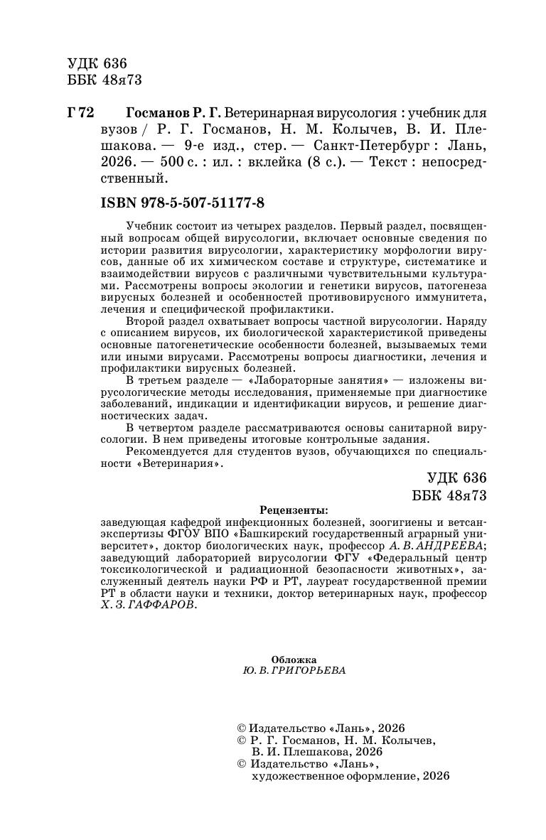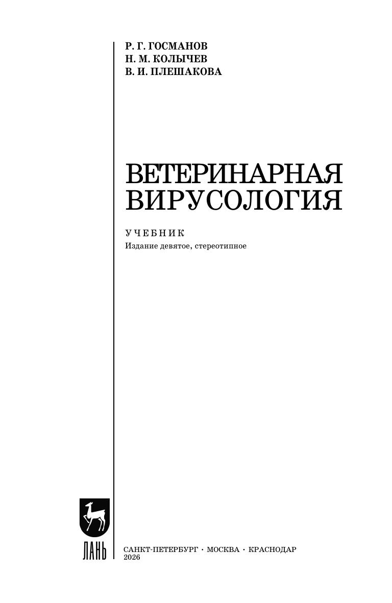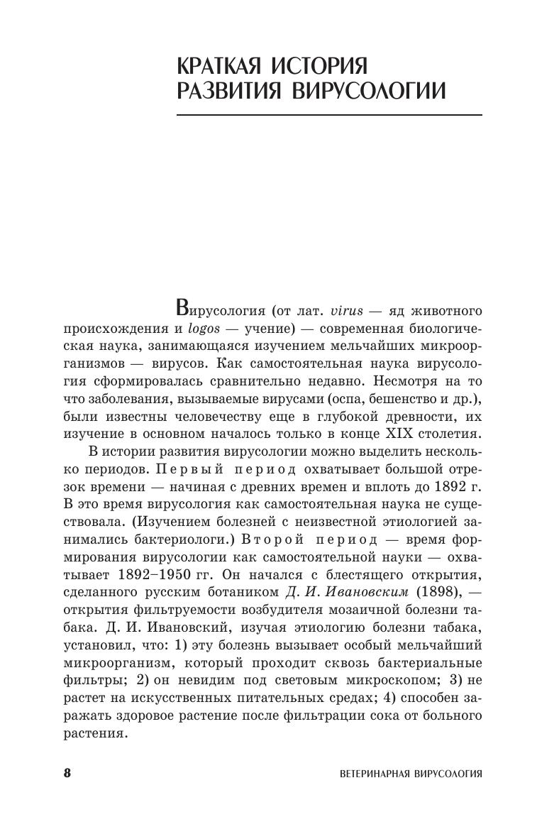 Допущено Министерством сельского хозяйства Российской Федерации в качестве учебника для студентов высших учебных заведений, обучающихся по специальности "Ветеринария". Учебник состоит из четырех разделов. Первый раздел, посвященный вопросам общей вирусологии, включает основные сведения по истории развития вирусологии, характеристику морфологии вирусов, данные об их химическом составе и структуре, систематике и взаимодействии вирусов с различными чувствительными культурами. Рассмотрены вопросы экологии и генетики вирусов, патогенеза вирусных болезней и особенностей противовирусного иммунитета, лечения и специфической профилактики. Второй раздел охватывает вопросы частной вирусологии. Наряду с описанием вирусов, их биологической характеристикой приведены основные патогенетические особенности болезней, вызываемых теми или иными вирусами. Рассмотрены вопросы диагностики, лечения и профилактики вирусных болезней. По сравнению со вторым изданием (2006) включено дополнительно описание 20 вирусов, вызывающих болезни молодняка и других животных. В третьем разделе - "Лабораторные занятия" - изложены вирусологические методы исследования, применяемые при диагностике заболеваний, индикации и идентификации вирусов, и решение диагностических задач. В четвертом разделе, введенном в состав учебника впервые, рассматриваются основы санитарной вирусологии. В нем приведены итоговые контрольные задания.Рекомендуется для студентов вузов, обучающихся по специальности "Ветеринария".