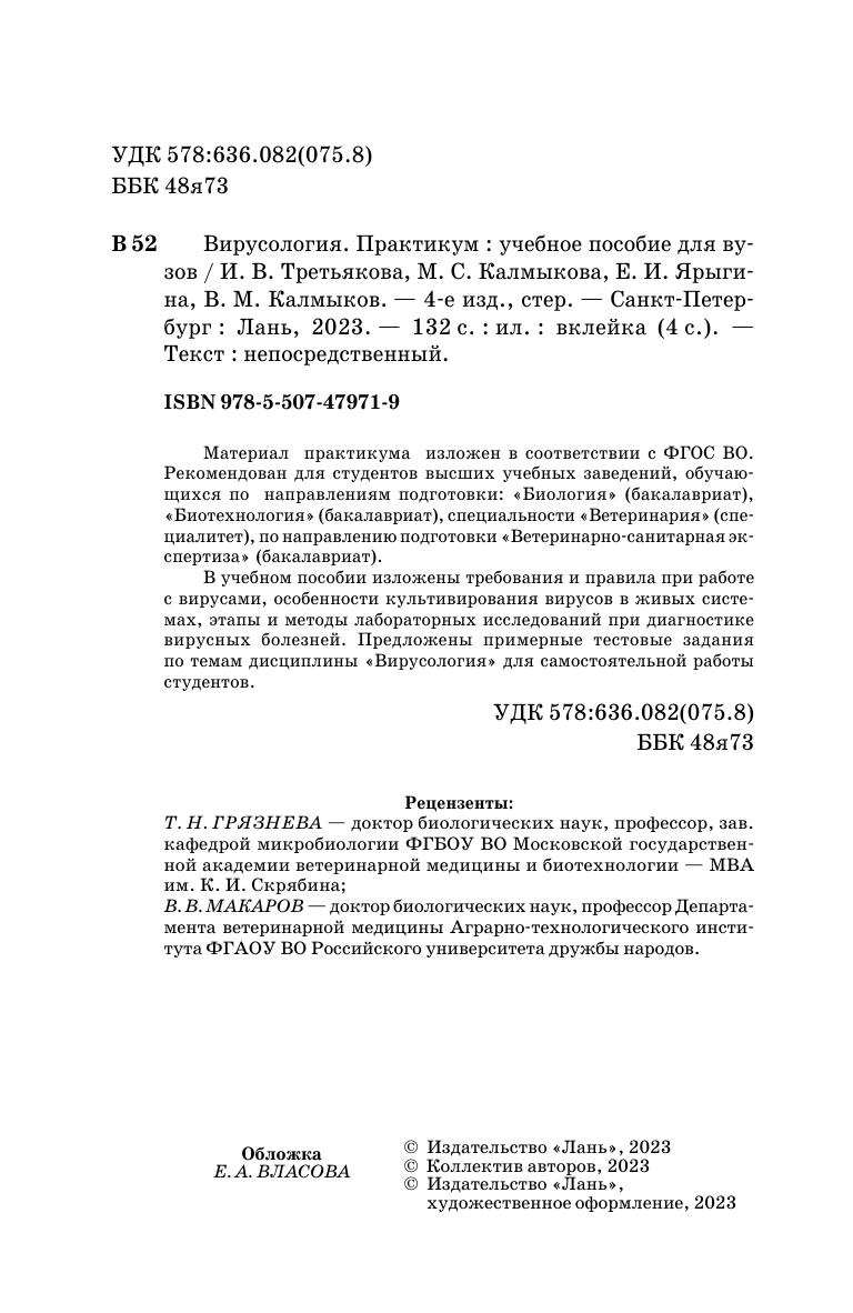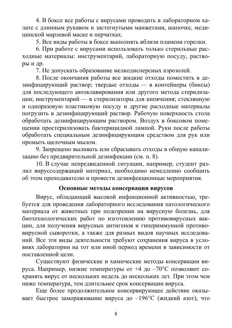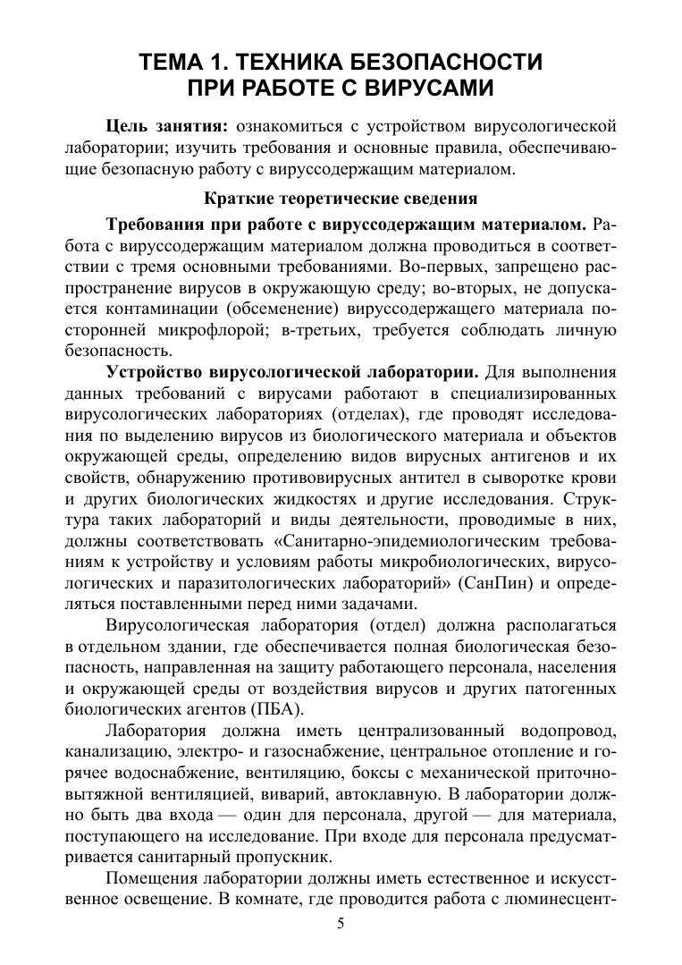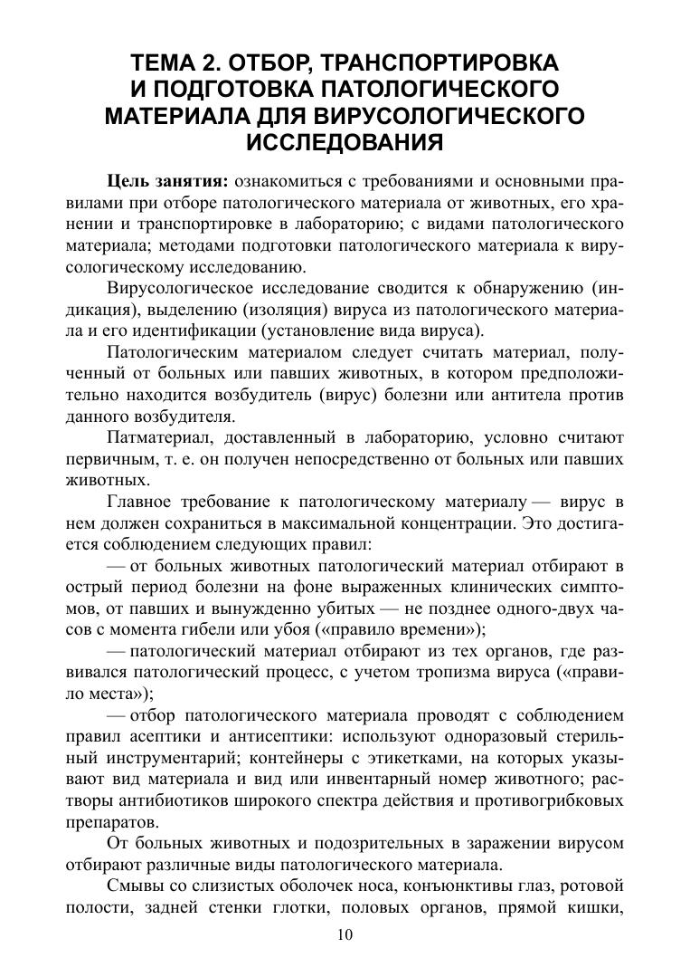 Материал практикума изложен в соответствии с ФГОС ВО. Рекомендован для студентов высших учебных заведений, обучающихся по направлениям подготовки: «Биология» (бакалавриат), «Биотехнология» (бакалавриат), специальности «Ветеринария» (специалитет), по направлению подготовки: «Ветеринарно-санитарная экспертиза» (бакалавриат). В учебном пособии изложены требования и правила при работе с вирусами, особенности культивирования вирусов в живых системах, этапы и методы лабораторных исследований при диагностике вирусных болезней. Предложены примерные тестовые задания по темам дисциплины «Вирусология» для самостоятельной работы студентов.