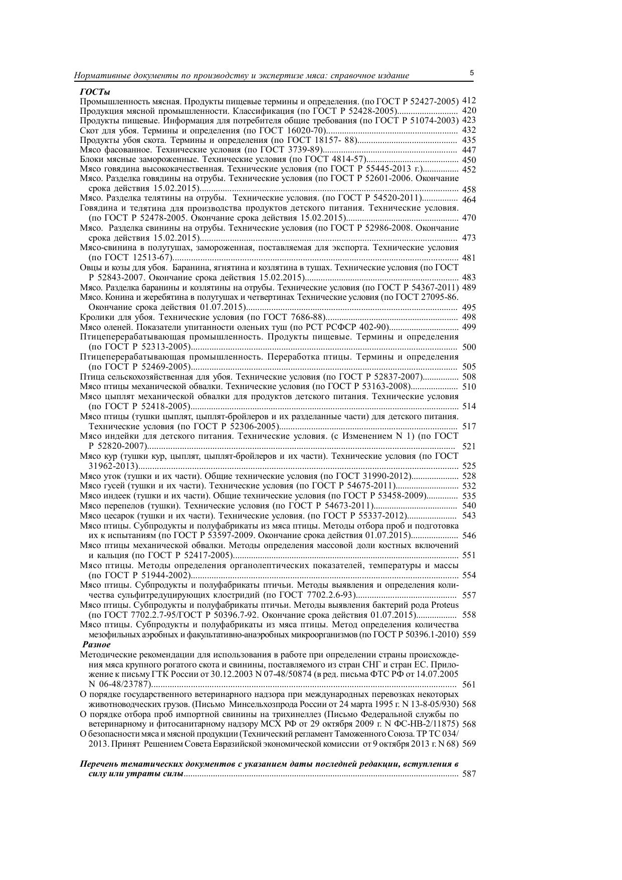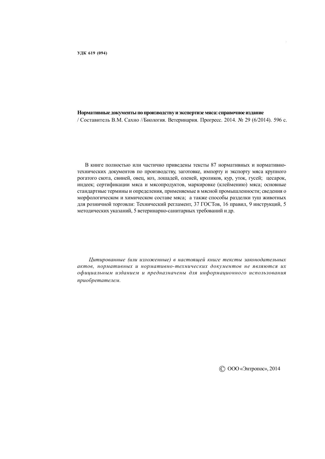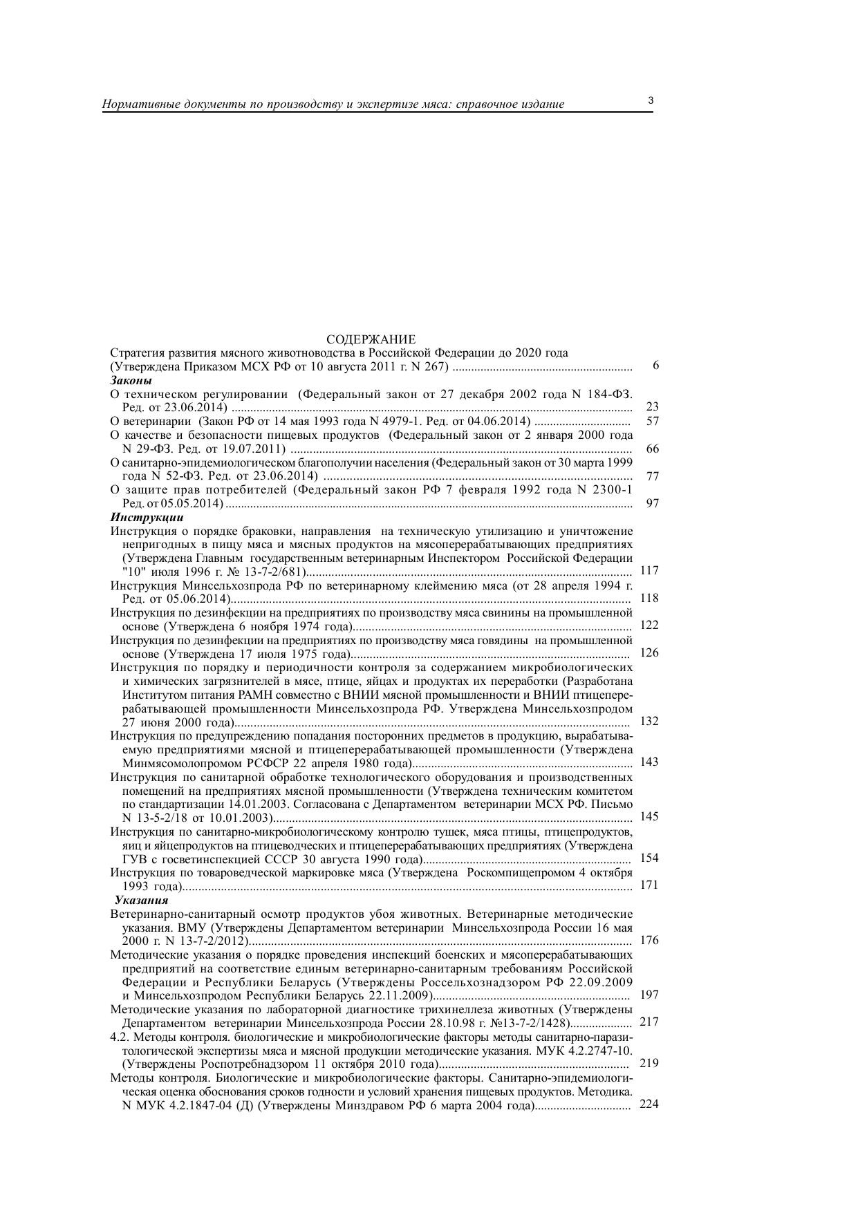 В книге полностью или частично приведены тексты 87 нормативных и нормативно-технических документов по производству, заготовке, импорту и экспорту мяса крупного рогатого скота, свиней, овец, коз, лошадей, оленей, кроликов, кур, уток, гусей; цесарок, индеек; сертификации мяса и мясопродуктов, маркировке (клеймению) мяса; основные стандартные термины и определения, применяемые в мясной промышленности; сведения о морфологическом и химическом составе мяса; а также способы разделки туш животных для розничной торговли: Технический регламент, 37 ГОСТов, 16 правил, 9 инструкций, 5 методических указаний, 5 ветеринарно-санитарных требований и др.