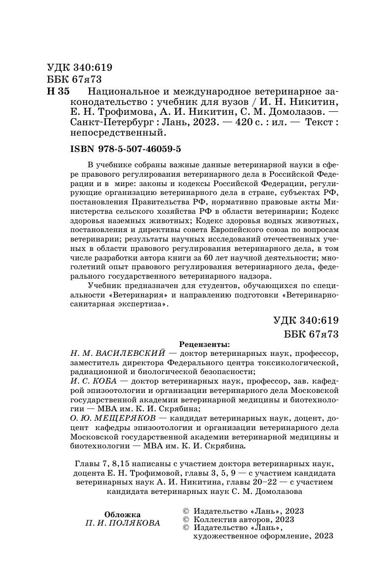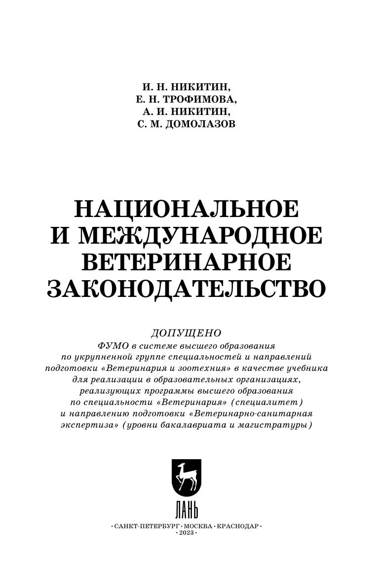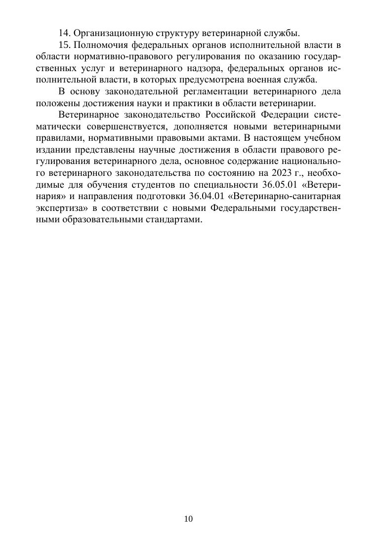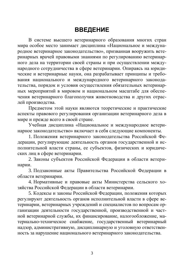 В учебнике собраны важные данные ветеринарной науки в сфере правового регулирования ветеринарного дела в Российской Федерации и в мире: законы и кодексы Российской Федерации, регулирующие организацию ветеринарного дела в стране, субъектах РФ, постановления Правительства РФ, нормативно правовые акты Министерства сельского хозяйства РФ в области ветеринарии, Кодекс здоровья наземных животных, Кодекс здоровья водных животных, постановления и директивы совета Европейского союза по вопросам ветеринарии, результаты научных исследований отечественных ученых в области правового регулирования ветеринарного дела, в том числе разработки автора книги за 60 лет научной деятельности, многолетний опыт правового регулирования ветеринарного дела, федерального государственного ветеринарного надзора. Учебник предназначен для студентов, обучающихся по специальности «Ветеринария» и направлению подготовки «Ветеринарно-санитарная экспертиза».