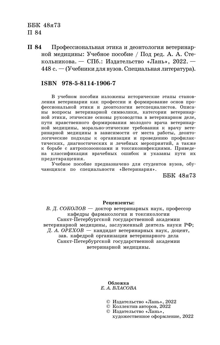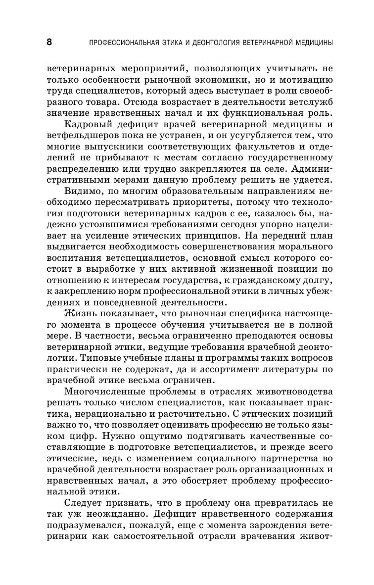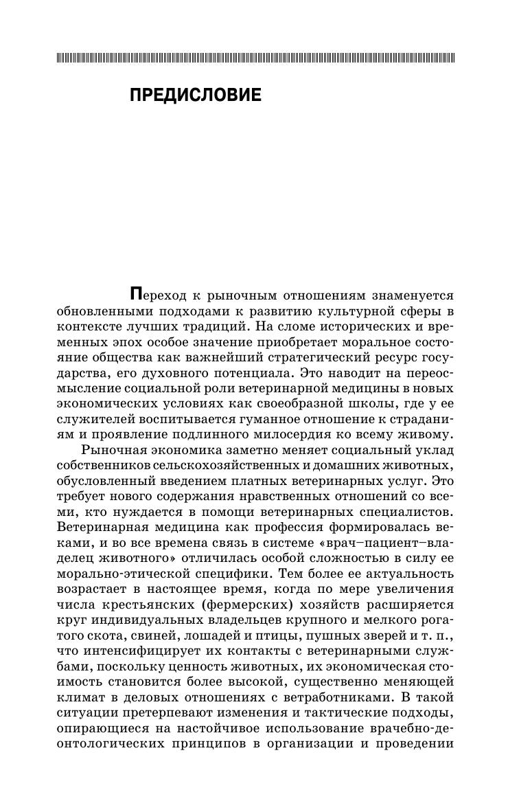 В учебном пособии изложены исторические этапы становления ветеринарии как профессии и формирование основ профессиональной этики и деонтологии ветспециалистов. Описаны вопросы ветеринарной символики, категории ветеринарной этики, этические основы руководства в ветеринарном деле, пути нравственного формирования молодого врача ветеринарной медицины, морально-этические требования к врачу ветеринарной медицины в зависимости от места работы, деонтологические подходы к организации и проведению профилактических, диагностических и лечебных мероприятий, а также к борьбе с антропозоонозами и токсикоинфекциями. Приведена классификация врачебных ошибок и указаны пути их предотвращения.