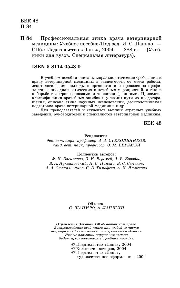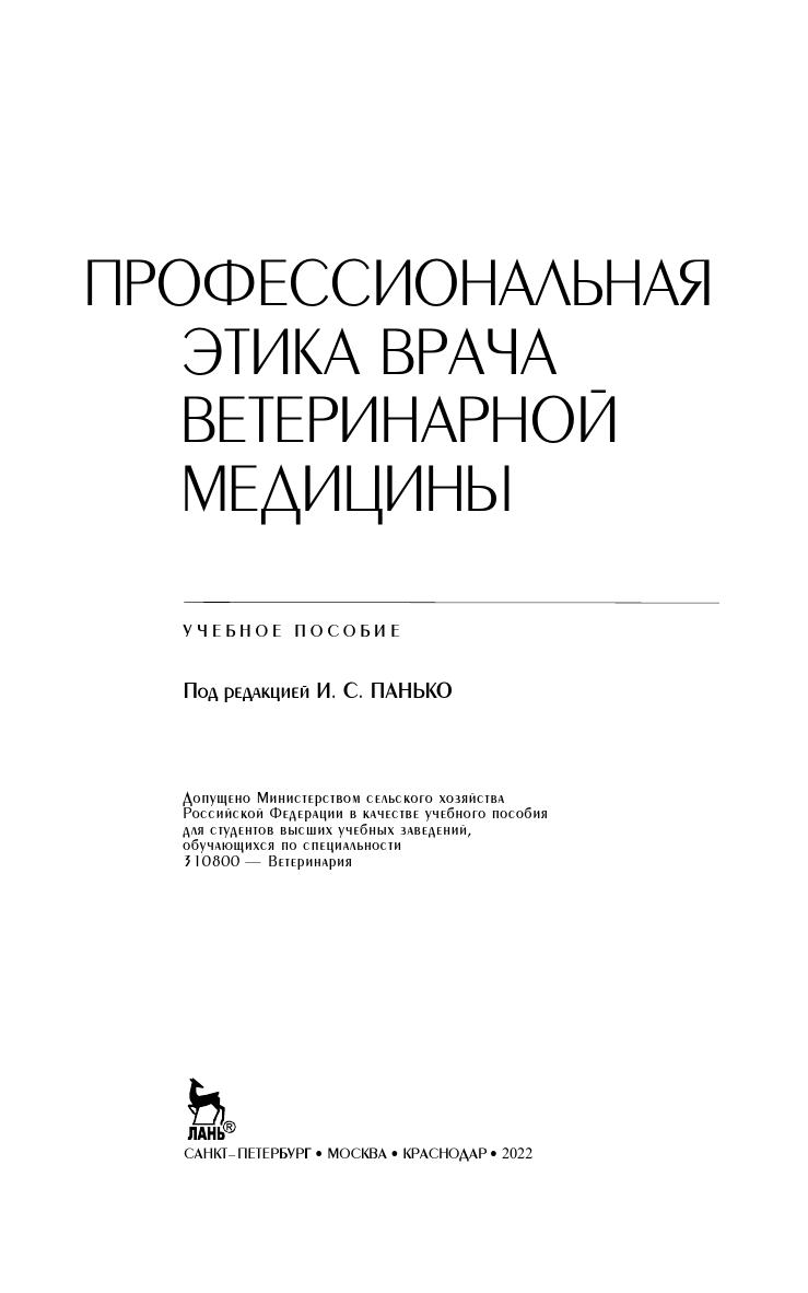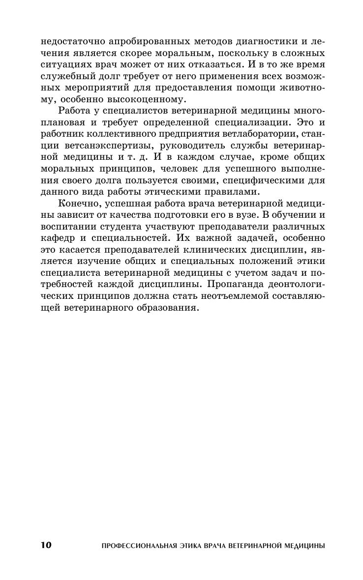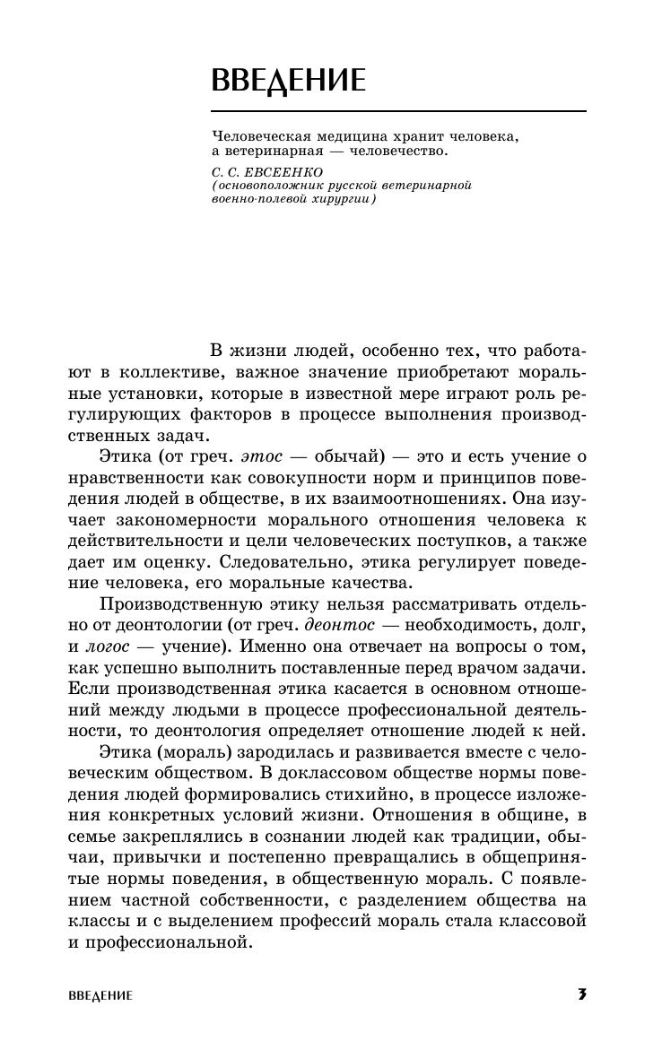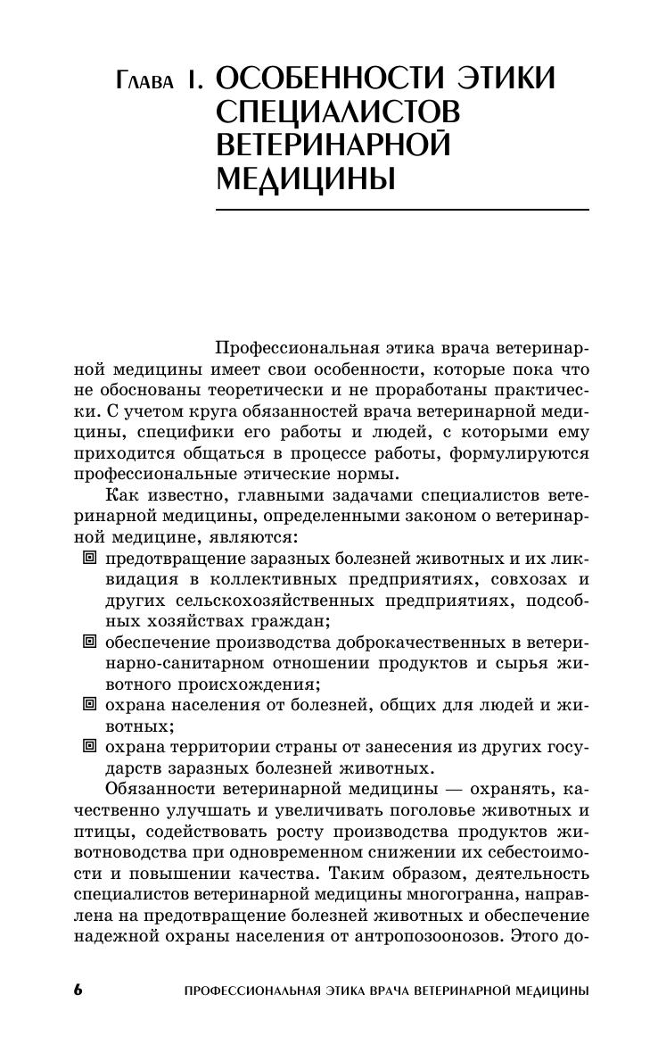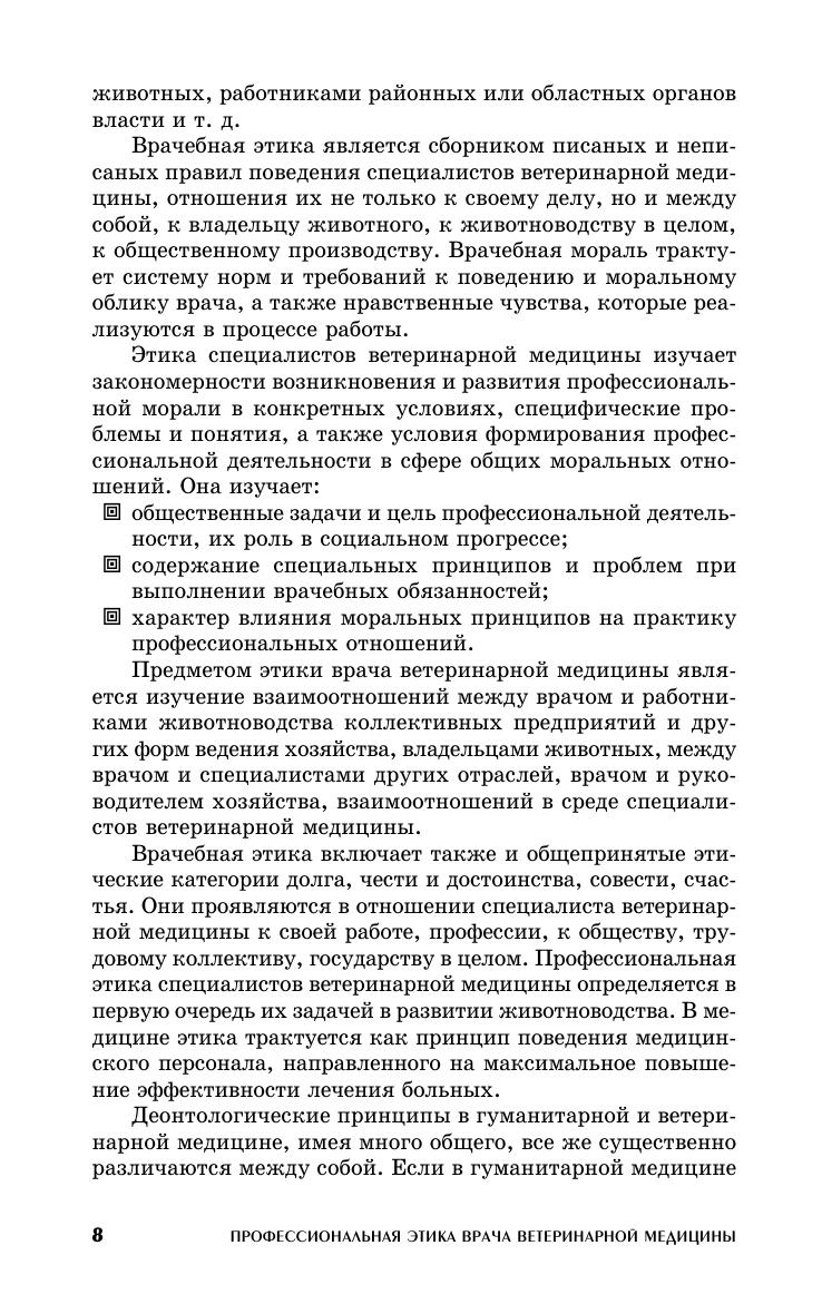 Описаны морально-этические требования к врачу ветеринарной медицины в зависимости от места работы, деонтологические подходы к организации и проведению профилактических, диагностических и лечебных мероприятий, а также к борьбе с антропозоонозами и токсикоинфекциями. Приведена классификация врачебных ошибок и указаны пути их предотвращения, описана этика научных исследований, деонтологическая подготовка врача ветеринарной медицины и др. Для преподавателей и студентов высших аграрных учебных заведений, руководителей и специалистов ветеринарной медицины.