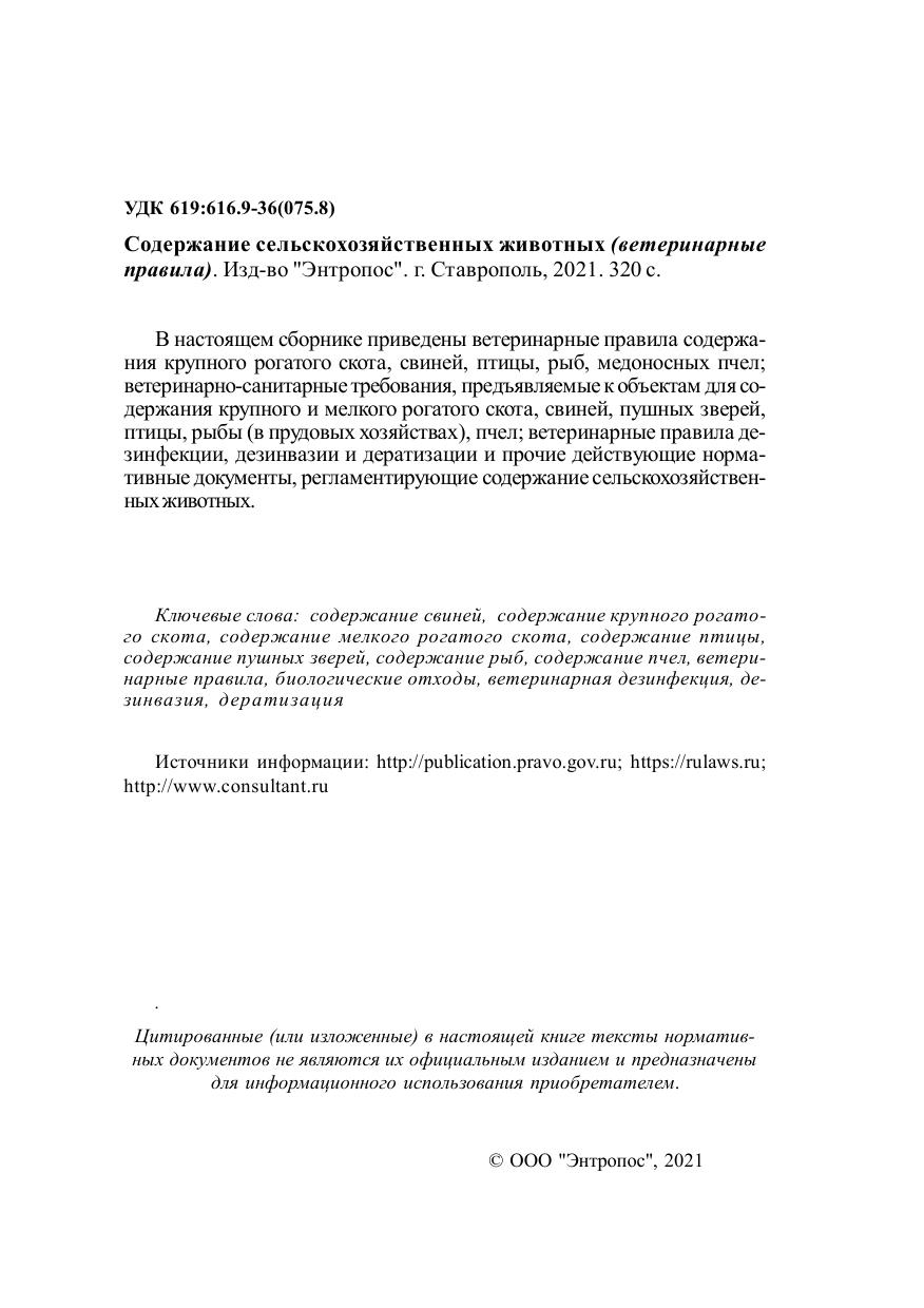 В настоящем сборнике приведены ветеринарные правила содержания крупного рогатого скота, свиней, птицы, рыб, медоносных пчел; ветеринарно-санитарные требования, предъявляемые к объектам для содержания крупного и мелкого рогатого скота, свиней, пушных зверей, птицы, рыбы (в прудовых хозяйствах), пчел; ветеринарные правила дезинфекции, дезинвазии и дератизации и прочие действующие нормативные документы, регламентирующие содержание сельскохозяйственных животных.