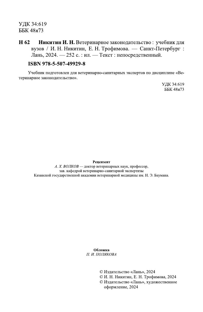 Учебник подготовлен для ветеринарно-санитарных экспертов по дисциплине «Ветеринарное законодательство».