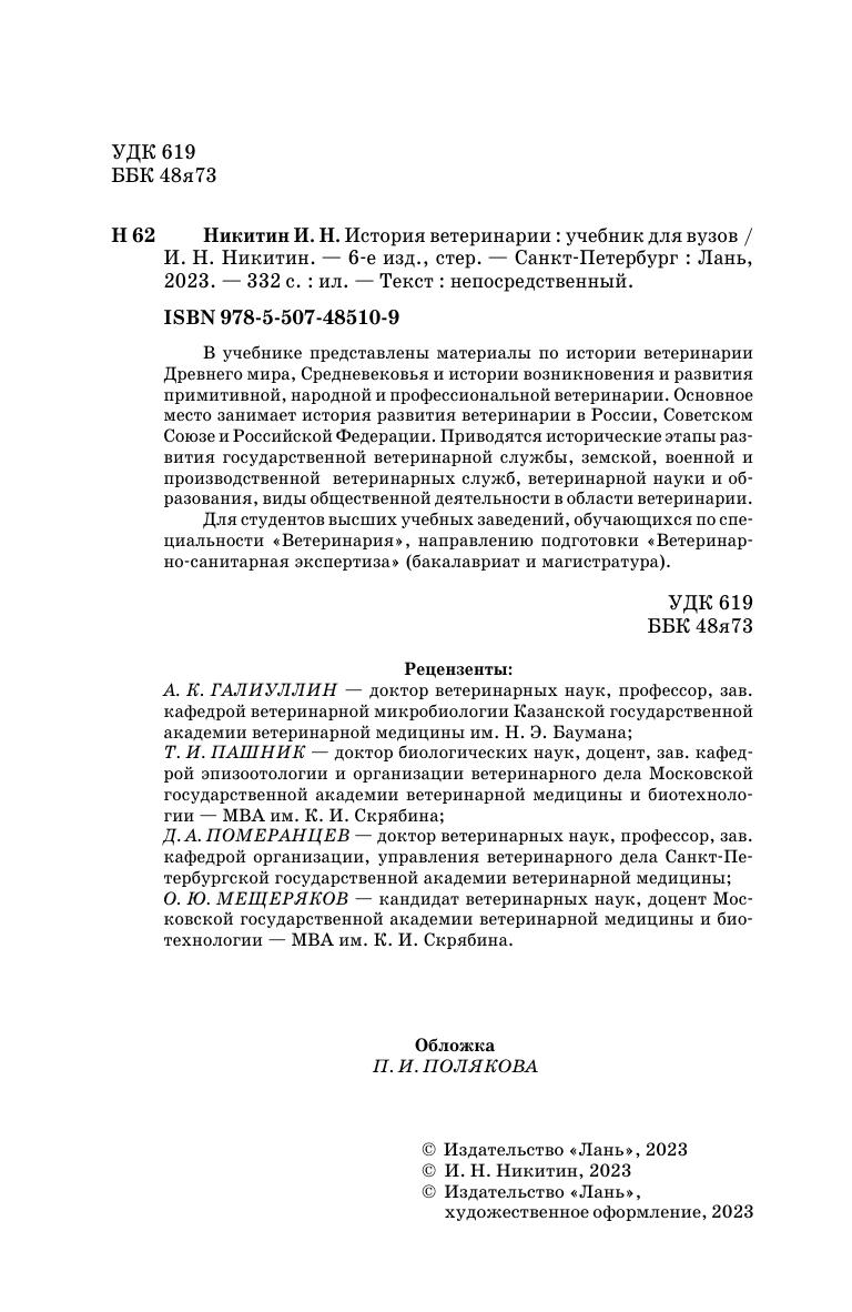 В учебнике представлены материалы по истории ветеринарии Древнего мира, Средневековья, по истории возникновения и развития примитивной, народной и профессиональной ветеринарии. Основное место занимает история развития ветеринарии в России, Советском Союзе, Российской Федерации. Приводятся исторические этапы развития государственной ветеринарной службы, земской, военной, производственной ветеринарной службы, ветеринарной науки и образования, виды общественной деятельности в области ветеринарии.Для студентов высших учебных заведений, обучающихся по специальности «Ветеринария», направлению подготовки «Ветеринарно-санитарная экспертиза» (бакалавриат и магистратура).