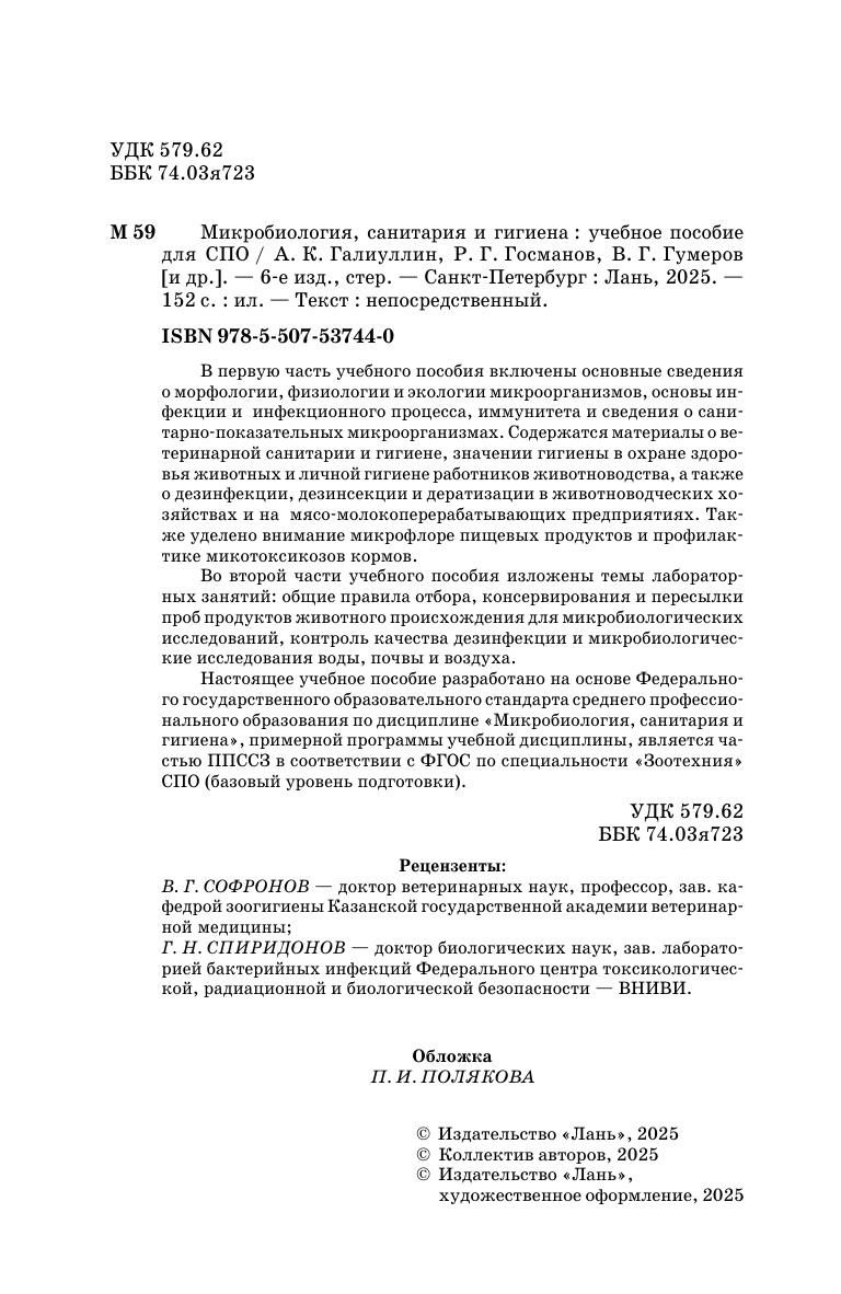 В первой части учебного пособия изложены основные сведения о морфологии, физиологии и экологии микроорганизмов, основы инфекции и инфекционного процесса, иммунитета и о санитарно-показательных микроорганизмах. Содержатся материалы о ветеринарной санитарии и гигиене, значение гигиены в охране здоровья животных и личная гигиена работников животноводства, а также о дезинфекции, дезинсекции и дератизации в животноводческих хозяйствах и на мясо- молокоперерабатывающих предприятиях. Также уделено внимание микрофлоре пищевых продуктов и профилактике микотоксикозов кормов.Во второй части учебного пособия изложены темы лабораторных занятий: общие правила отбора, консервирования и пересылки проб продуктов животного происхождения для микробиологических исследований, контроль качества дезинфекции и микробиологические исследования воды, почвы и воздуха.Настоящее учебное пособие разработано на основе Федерального государственного образовательного стандарта среднего профессионального образования по дисциплине «Микробиология, санитария и гигиена», примерной программы учебной дисциплины, является частью ППССЗ в соответствии с ФОГС по специальности «Зоотехния» СПО (базовый уровень подготовки).