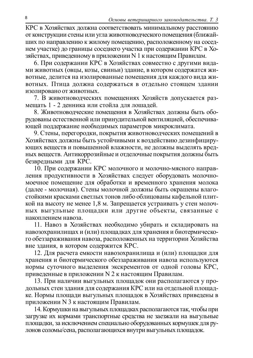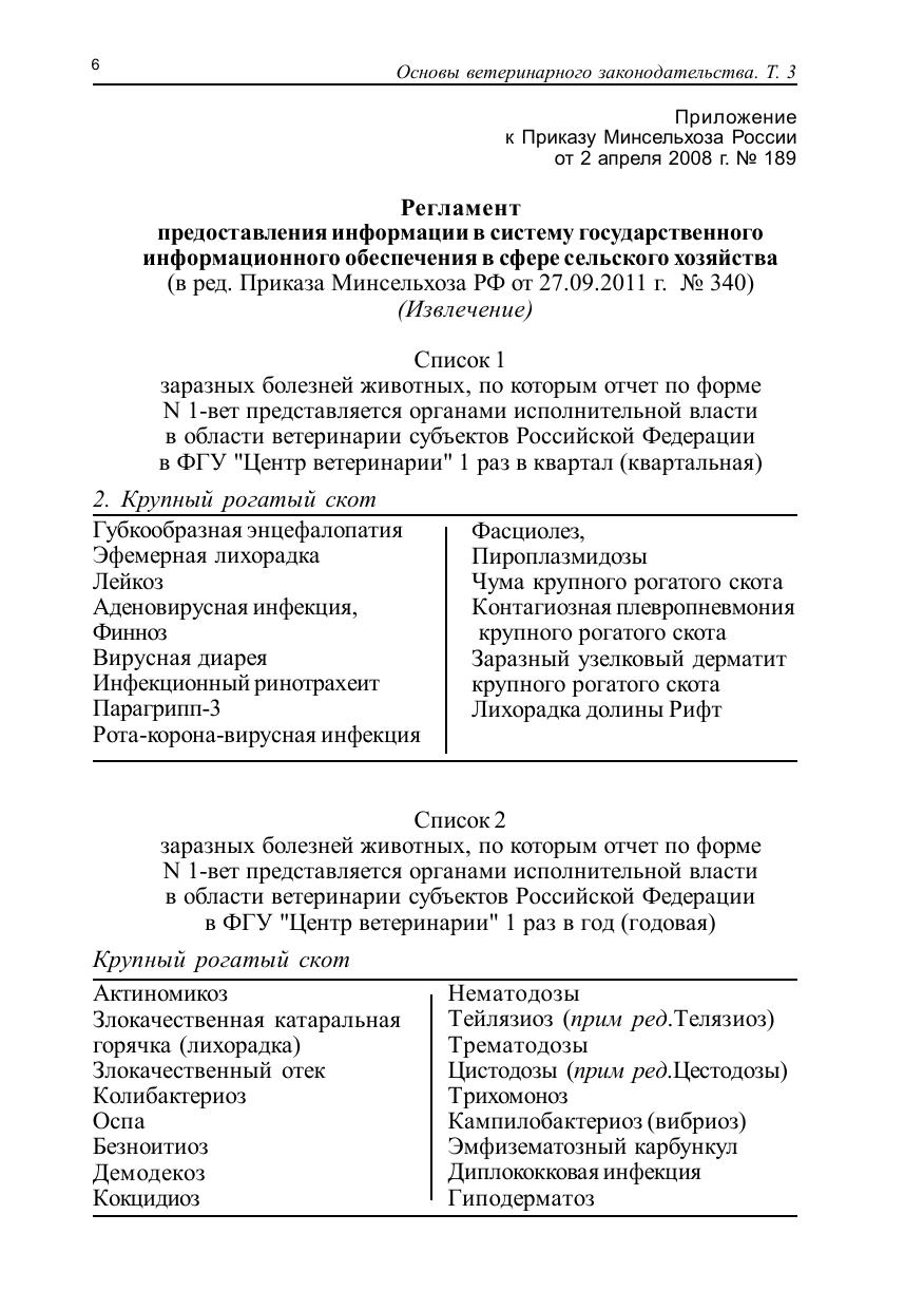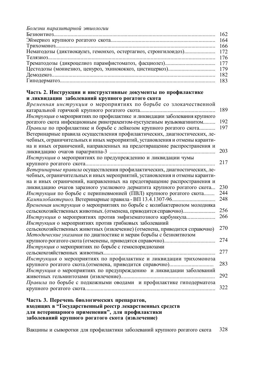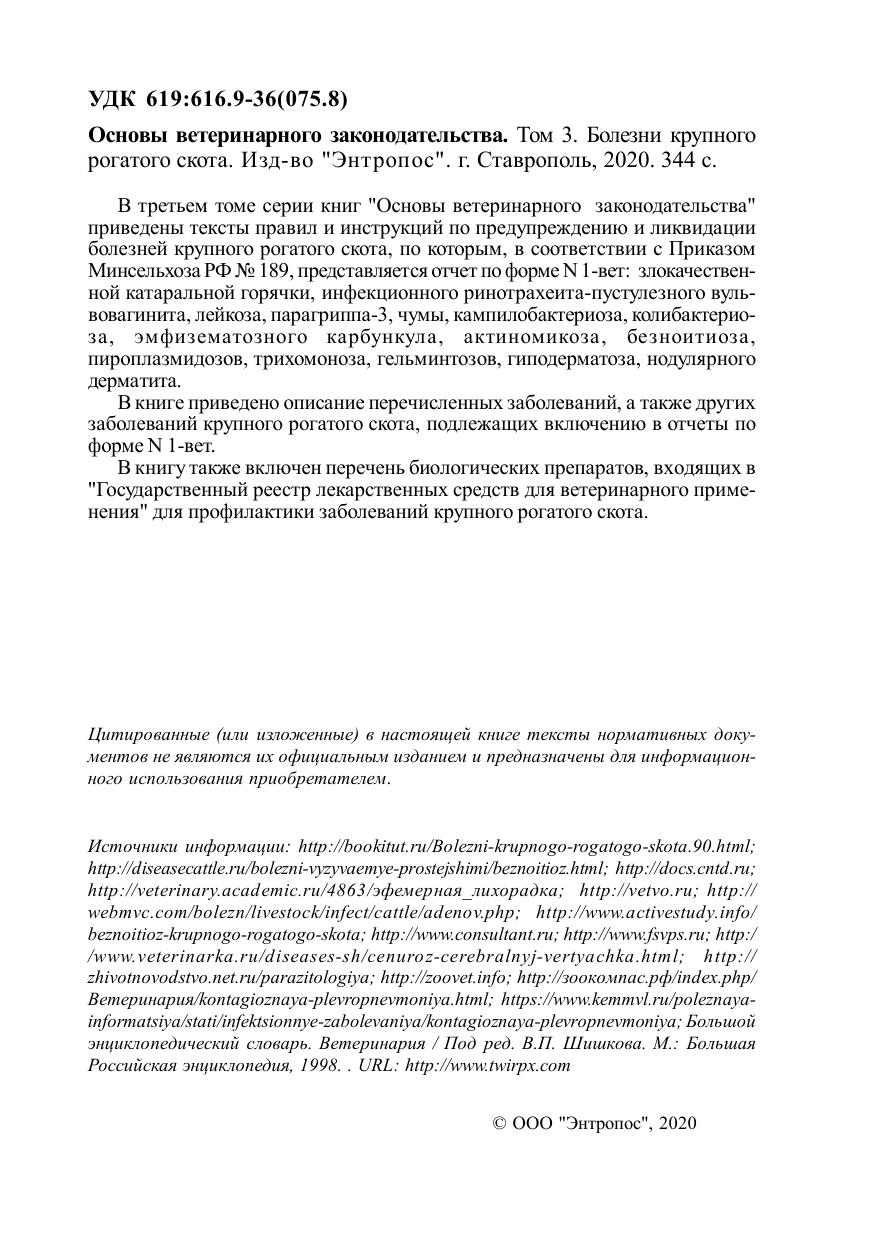 В третьем томе серии книг «Основы ветеринарного законодательства» приведены тексты правил и инструкций по предупреждению и ликвидации болезней крупного рогатого скота (по которым, в соответствии с Приказом Минсельхоза РФ № 189, представляется отчет по форме N 1-вет: злокачественной катаральной горячки, инфекционного ринотрахеита-пустулезноговульвовагинита, лейкоза, парагриппа-3, чумы, кампилобактериоза, колибактериоза, эмфизематозного карбункула, актиномикоза, безноитиоза, пироплазмидозов, трихомоноза, гельминтозов, гиподерматоза).