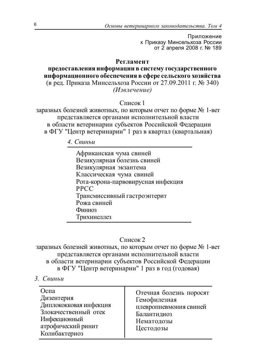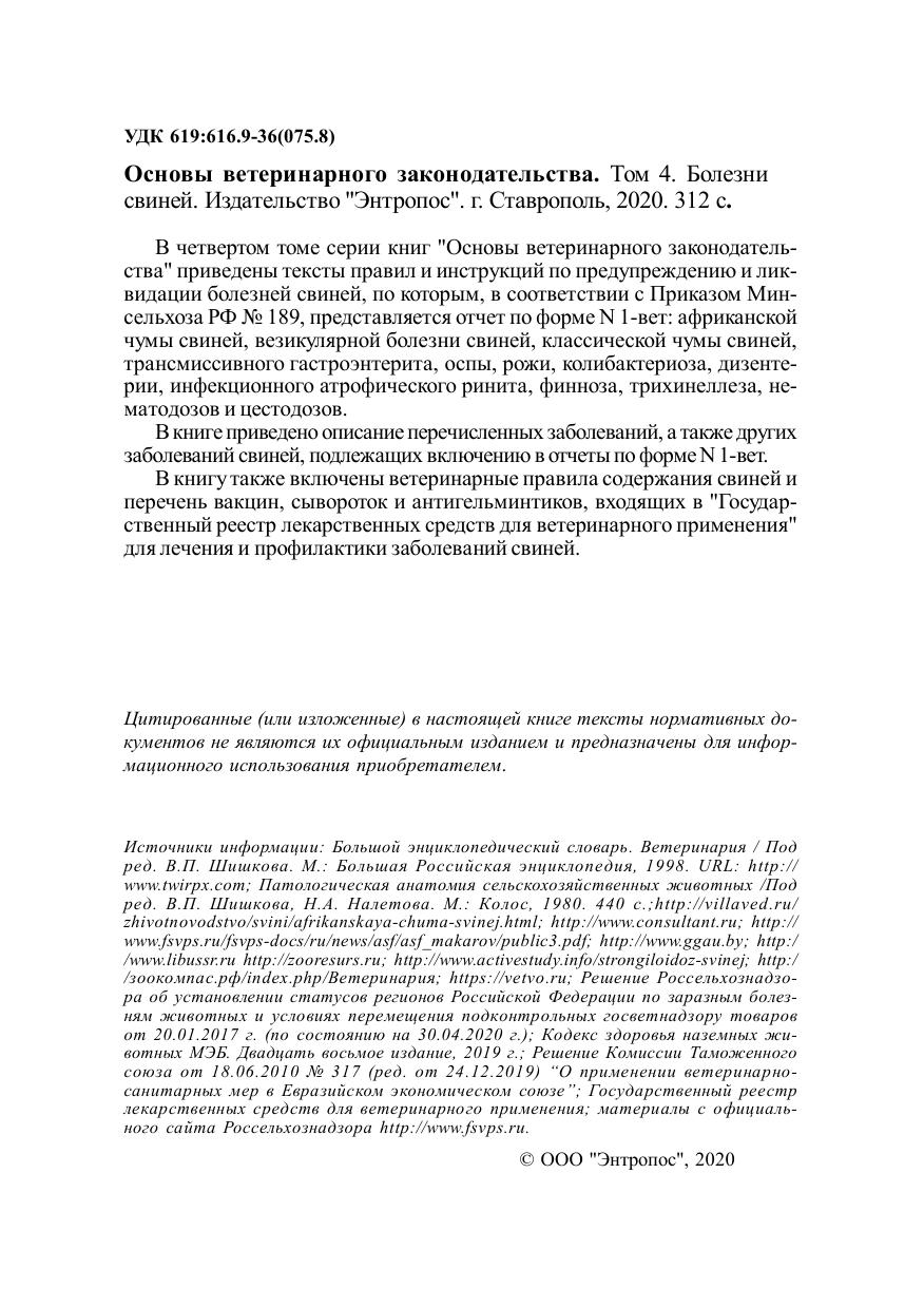 В четвертом томе серии книг "Основы ветеринарного законодательства" приведены тексты правил и инструкций по предупреждению и ликвидации болезней свиней, по которым, в соответствии с Приказом Минсельхоза РФ № 189, представляется отчет по форме N 1-вет: африканской чумы свиней, везикулярной болезни свиней, классической чумы свиней, трансмиссивного гастроэнтерита, оспы, рожи, колибактериоза, дизентерии, инфекционного атрофического ринита, финноза, трихинеллеза, нематодозов и цестодозов.