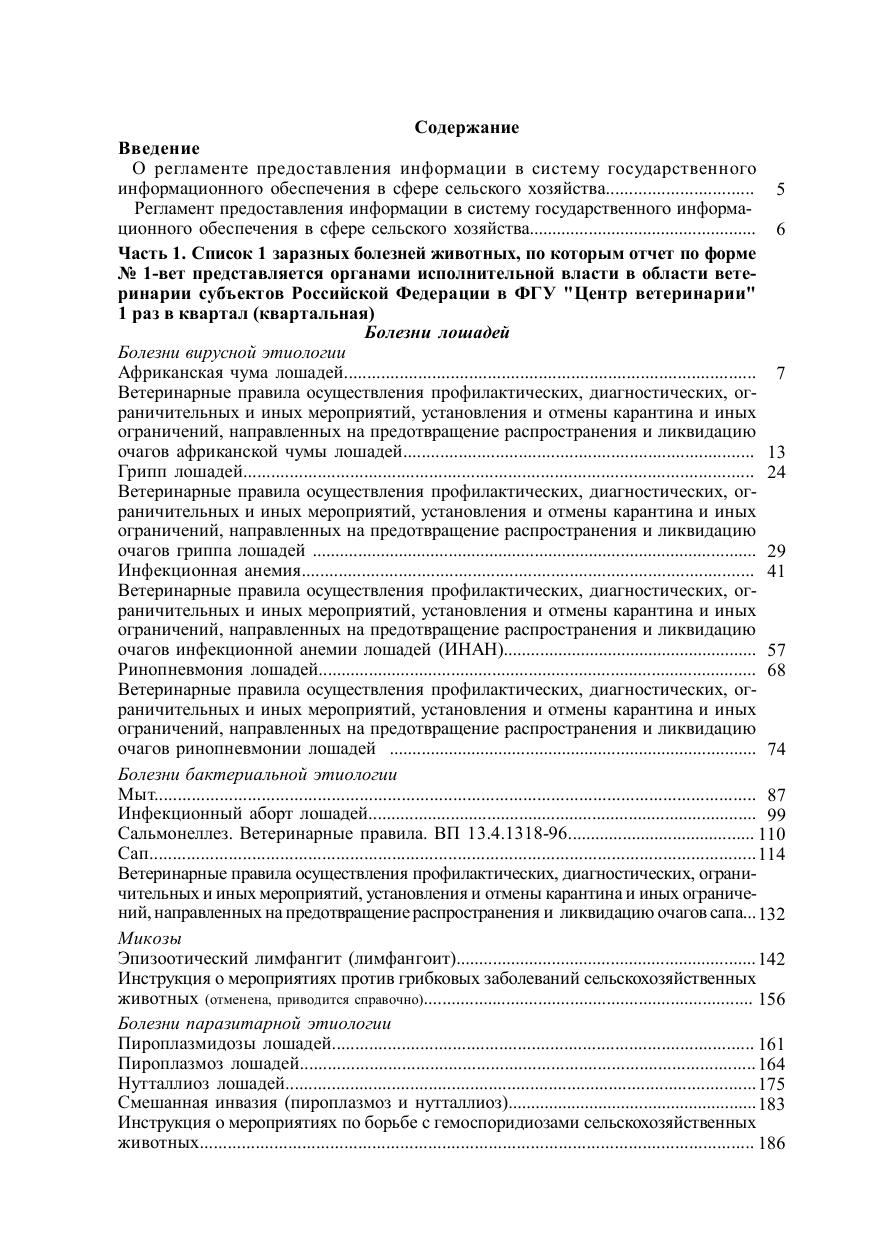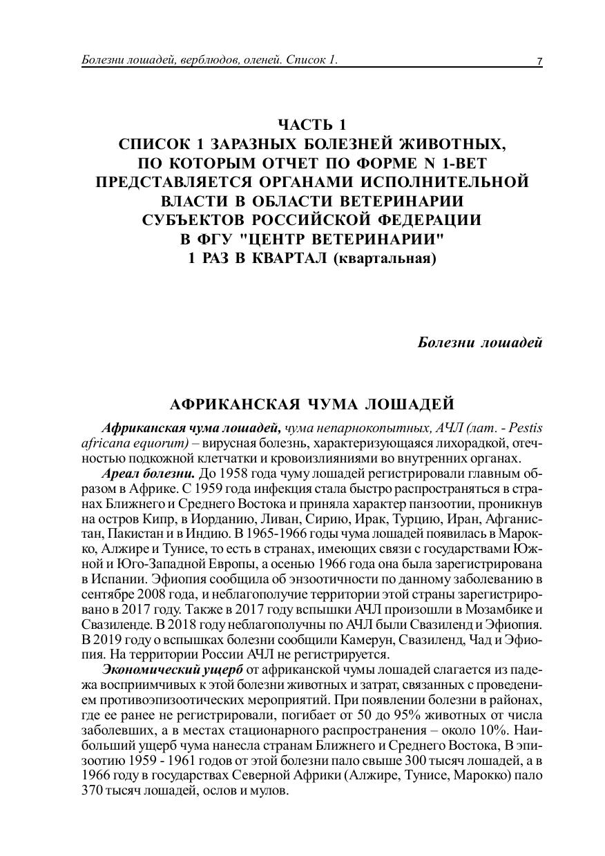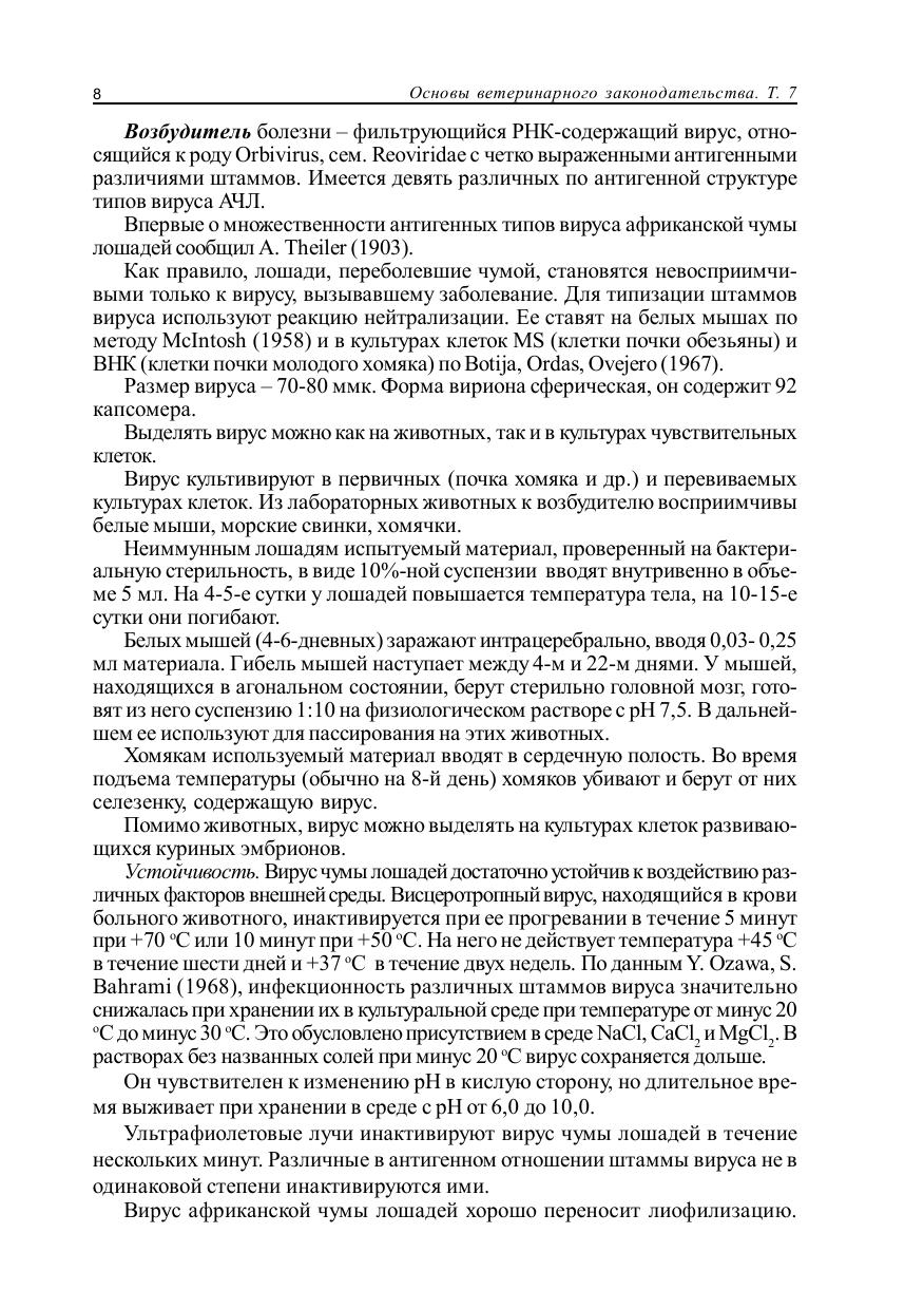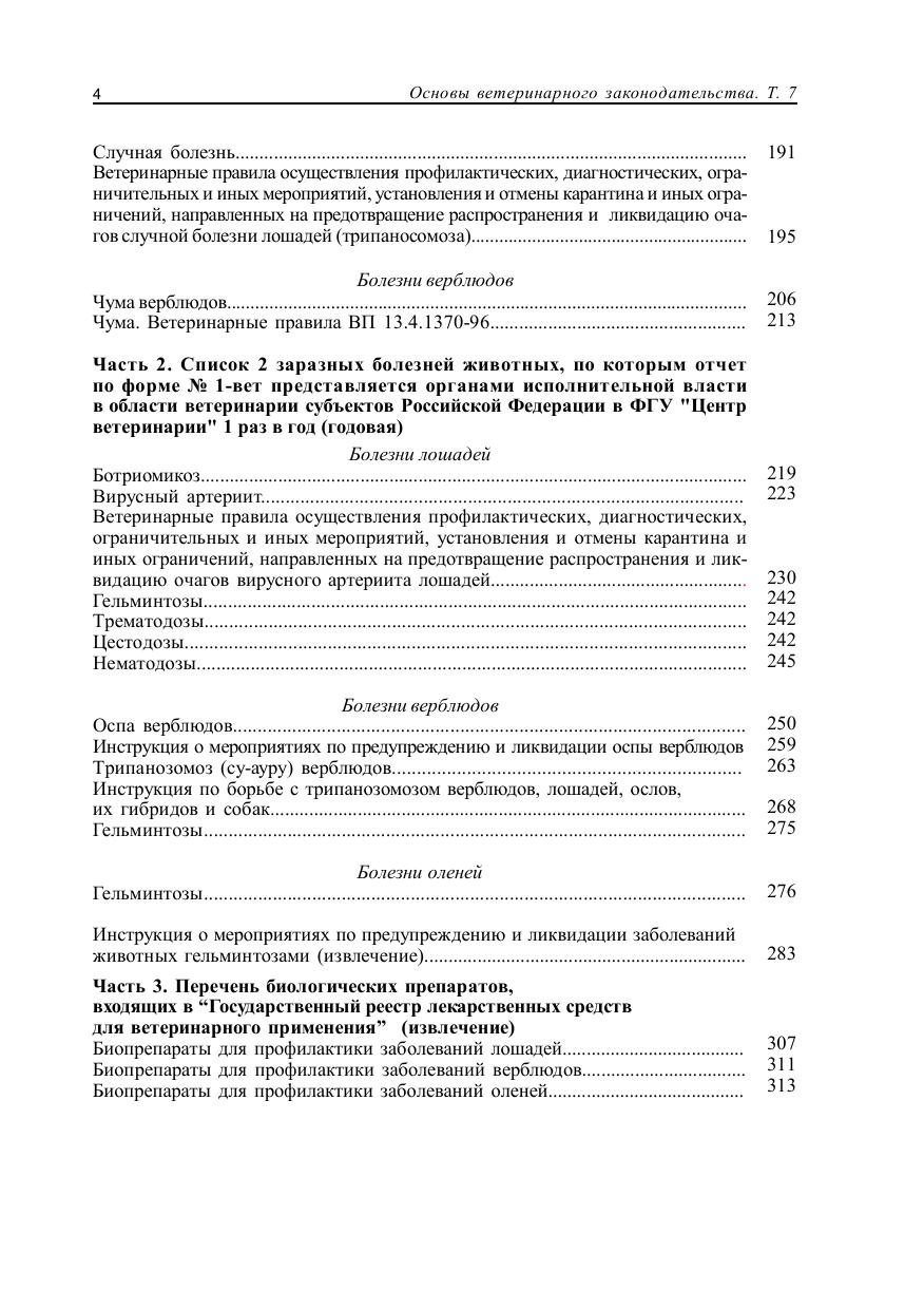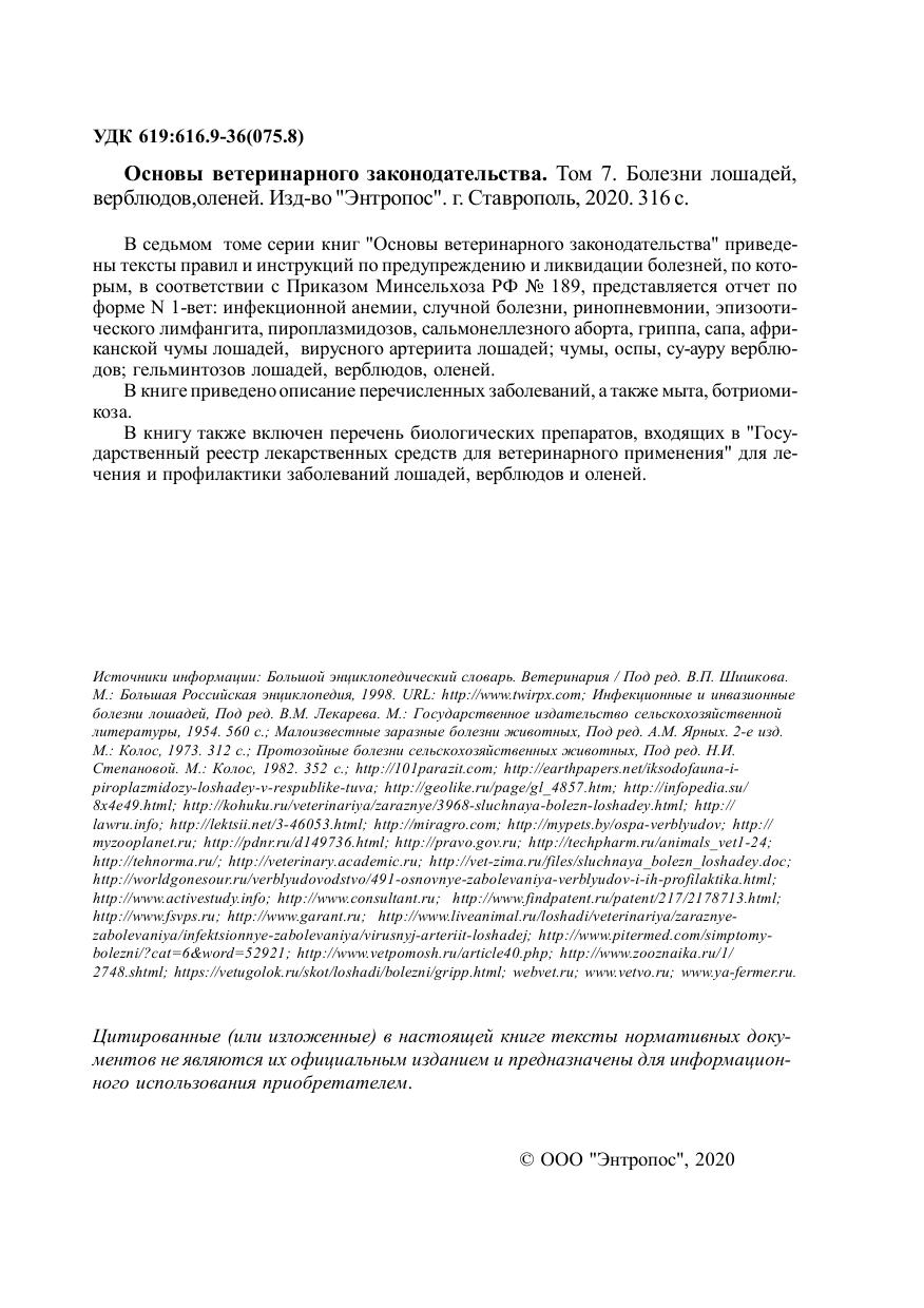 В седьмом томе серии книг "Основы ветеринарного законодательства" приведены тексты правил и инструкций по предупреждению и ликвидации болезней, по которым, в соответствии с Приказом Минсельхоза РФ № 189, представляется отчет по форме N 1-вет: инфекционной анемии, случной болезни, ринопневмонии, эпизоотического лимфангита, пироплазмидозов, сальмонеллезного аборта, гриппа, сапа, африканской чумы лошадей, вирусного артериита лошадей; чумы, оспы, су-ауру верблюдов; гельминтозов лошадей, верблюдов, оленей.