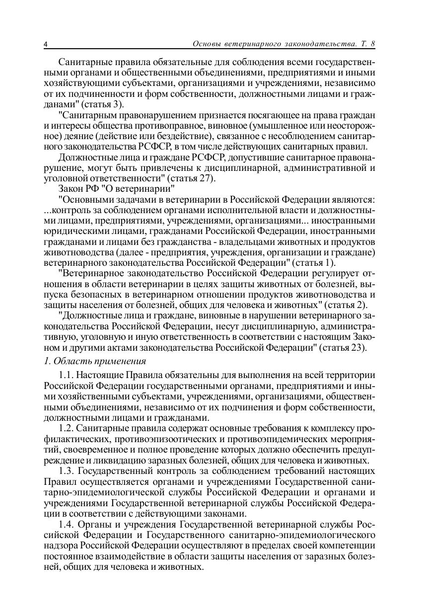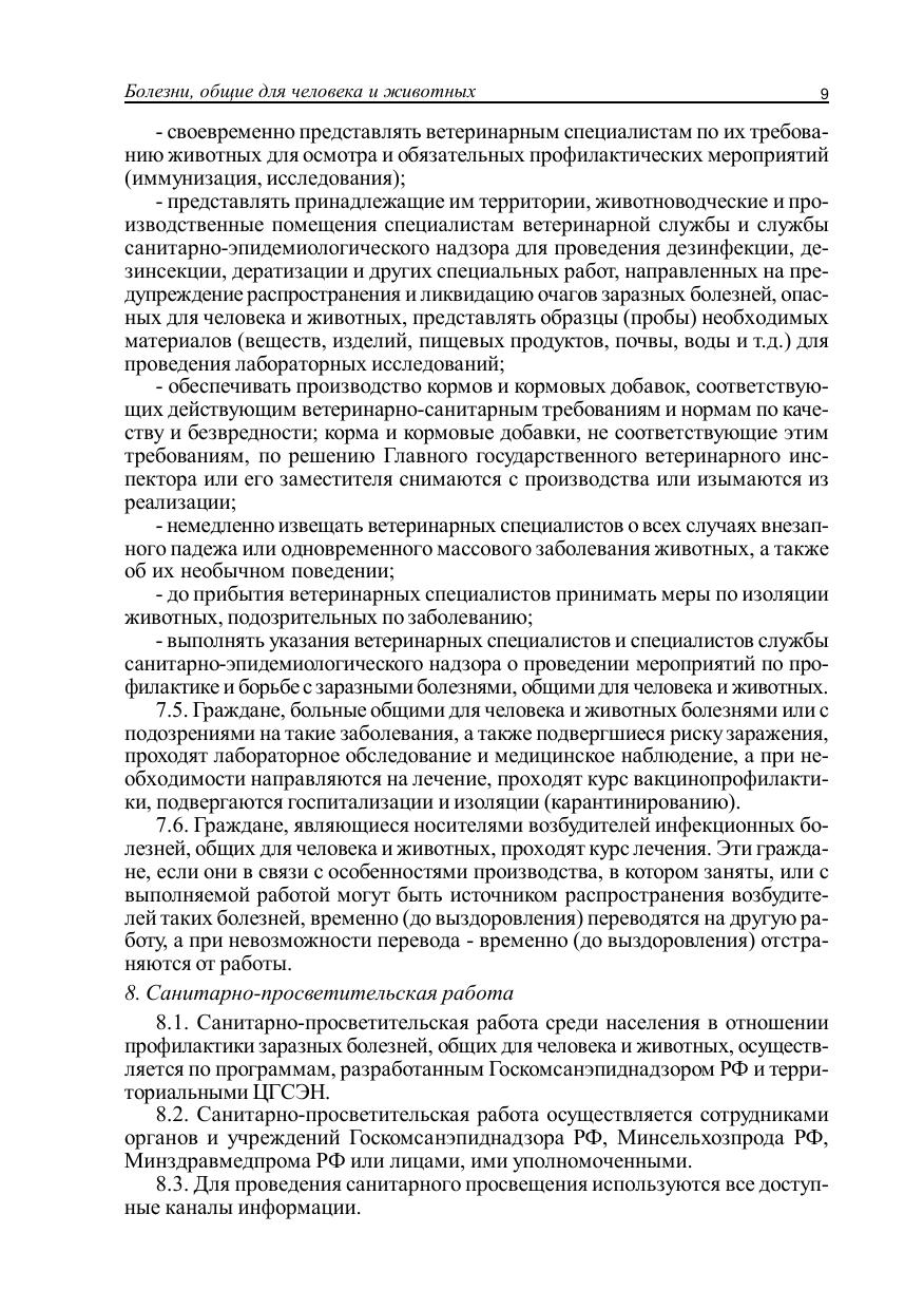 В восьмом томе серии книг "Основы ветеринарного законодательства" приведены тексты действующих ветеринарных и санитарно-эпидемиологических правил по предупреждению и ликвидации болезней, общих для человека и животных: бешенства, бруцеллеза, геморрагической лихорадки с почечным синдромом, иерсиниозов, кампилобактериоза, клещевого вирусного энцефалита, коксиеллеза, лептоспироза, листериоза, орнитоза, сальмонеллеза, сибирской язвы, туберкулеза, чумы.