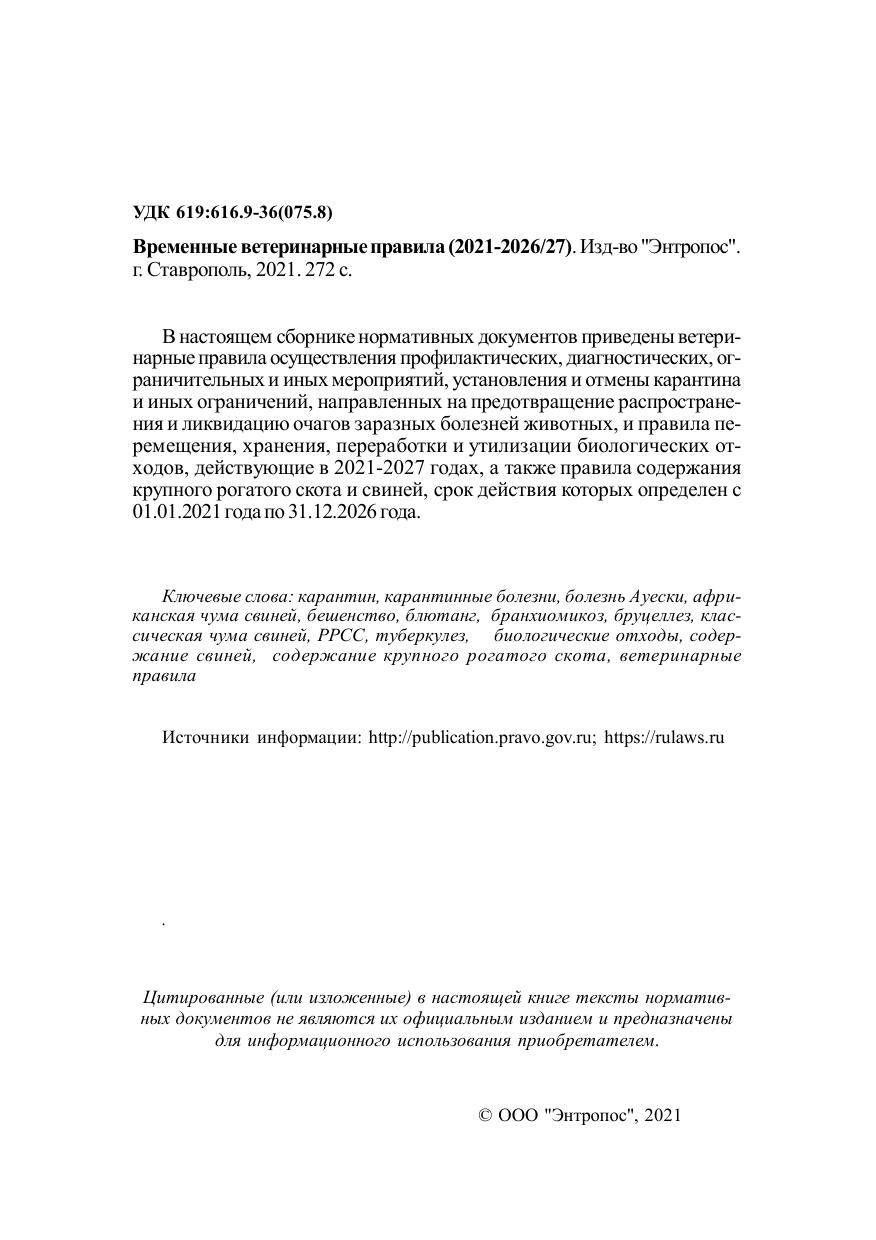 В настоящем сборнике нормативных документов приведены ветеринарные правила осуществления профилактических, диагностических, ограничительных и иных мероприятий, установления и отмены карантина и иных ограничений, направленных на предотвращение распространения и ликвидацию очагов заразных болезней животных, и правила перемещения, хранения, переработки и утилизации биологических отходов, действующие в 2021-2027 годах, а также правила содержания крупного рогатого скота и свиней, срок действия которых определен с 01.01.2021 года по 31.12.2026 года.
