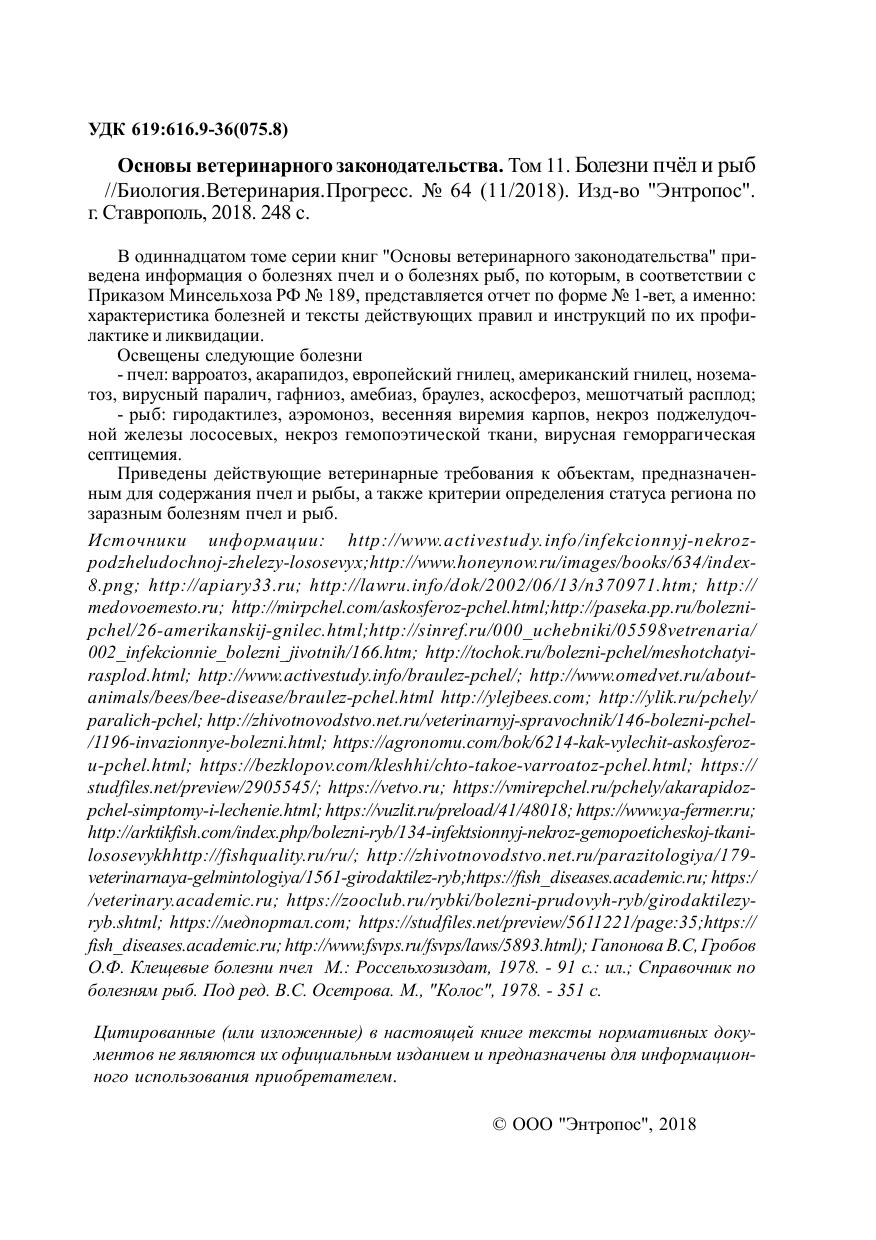 В одиннадцатом томе серии книг "Основы ветеринарного законодательства" приведена информация о болезнях пчел и о болезнях рыб, по которым, в соответствии с Приказом Минсельхоза РФ № 189, представляется отчет по форме № 1-вет, а именно: характеристика болезней и тексты действующих правил и инструкций по их профилактике и ликвидации. Освещены следующие болезни - пчел: варроатоз, акарапидоз, европейский гнилец, американский гнилец, нозематоз, вирусный паралич, гафниоз, амебиаз, браулез, аскосфероз, мешотчатый расплод; рыб: гиродактилез, аэромоноз, весенняя виремия карпов, некроз поджелудочной железы лососевых, некроз гемопоэтической ткани, вирусная геморрагическая септицемия.