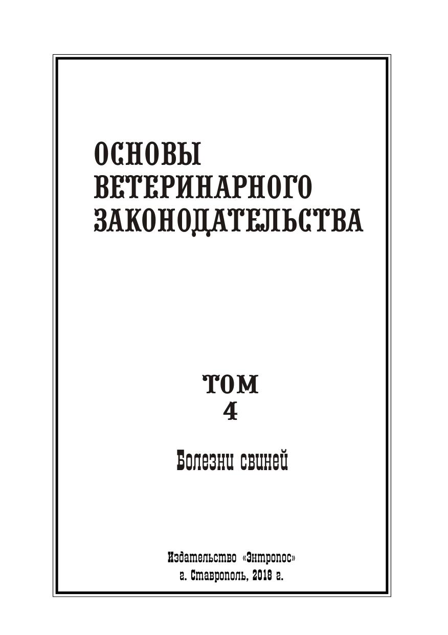 В четвертом томе серии книг "Основы ветеринарного законодательства" приведены тексты действующих правил и инструкций по предупреждению и ликвидации болезней свиней, по которым, в соответствии с Приказом Минсельхоза РФ № 189, представляется отчет по форме N 1-вет: африканской чумы свиней, везикулярной болезни свиней, классической чумы свиней, трансмиссивного гастроэнтерита, оспы, рожи, колибактериоза, дизентерии, инфекционного атрофического ринита, финноза, трихинеллеза, нематодозов и цестодозов.