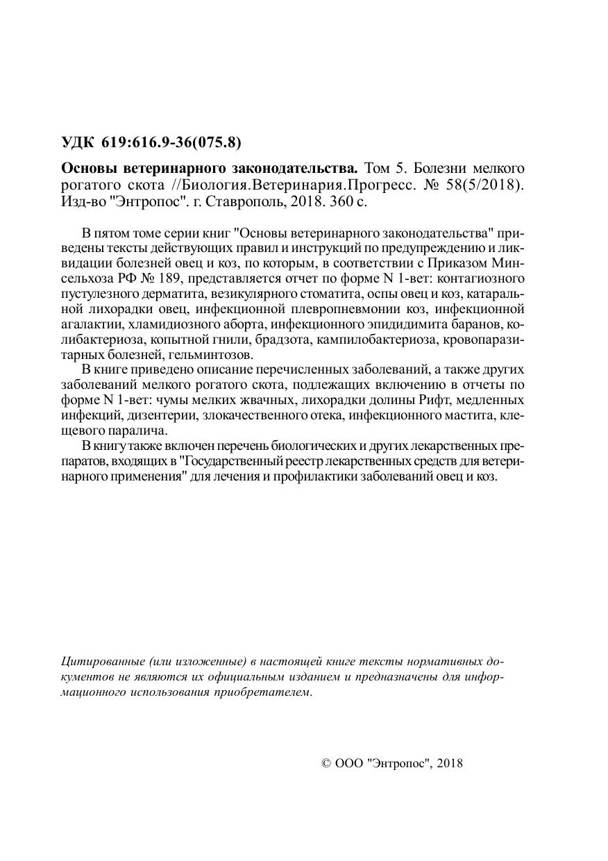 В пятом томе серии книг "Основы ветеринарного законодательства" приведены тексты действующих правил и инструкций по предупреждению и ликвидации болезней овец и коз, по которым, в соответствии с Приказом Минсельхоза РФ № 189, представляется отчет по форме N 1-вет: контагиозного пустулезного дерматита, везикулярного стоматита, оспы овец и коз, катаральной лихорадки овец, инфекционной плевропневмонии коз, инфекционной агалактии, хламидиозного аборта, инфекционного эпидидимита баранов, колибактериоза, копытной гнили, брадзота, кампилобактериоза, кровопаразитарных болезней, гельминтозов.