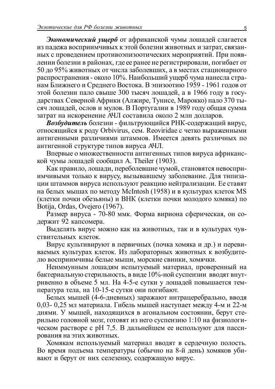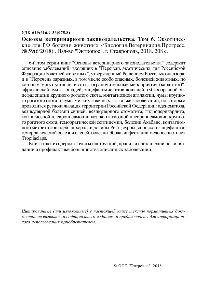 6-й том серии книг "Основы ветеринарного законодательства" содержит описание заболеваний, входящих в "Перечень экзотических для Российской Федерации болезней животных", утвержденный Решением Россельхознадзора, и в "Перечень заразных, в том числе особо опасных, болезней животных, по которым могут устанавливаться ограничительные мероприятия (карантин)": африканской чумы лошадей, энцефаломиелитов лошадей, губкообразной энцефалопатии крупного рогатого скота, контагиозной агалактии, чумы крупного рогатого скота и чумы мелких жвачных, - а также заболеваний, по которым