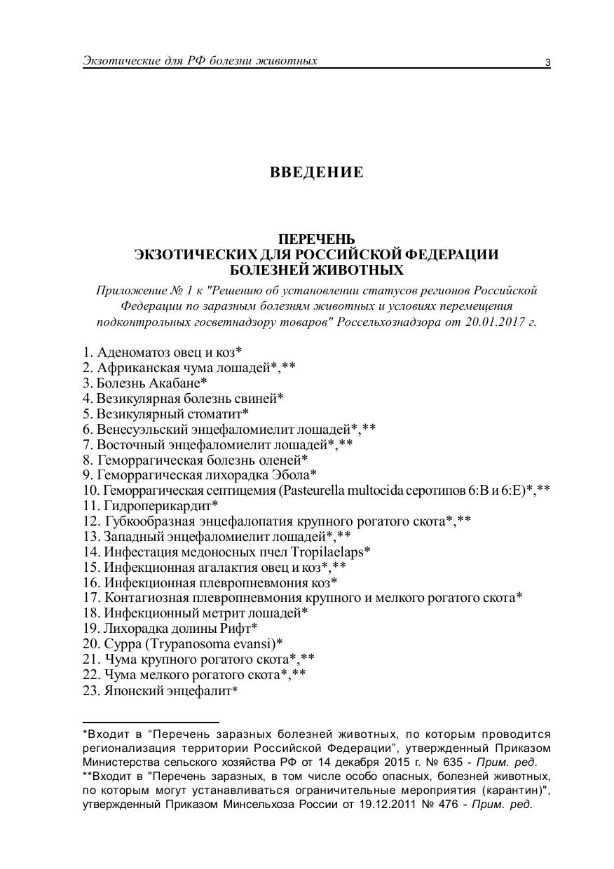 проводится регионализация территории Российской Федерации: аденоматоза, везикулярной болезни свиней, везикулярного стоматита, гидроперикардита, контагиозной плевропневмонии коз, контагиозной плевропневмонии крупного рогатого скота, геморрагической септицемии, болезни Акабане, контагиозного метрита лошадей, лихорадки долины Рифт, сурры, японского энцефалита, геморрагической болезни оленей, болезни Эбола, инфестации медоносных пчел Tropilaelaps.