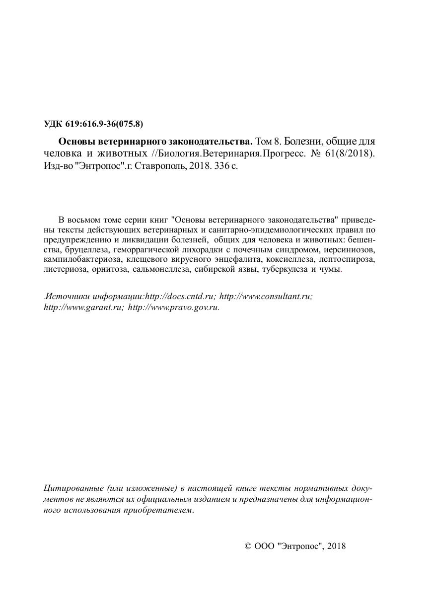 В восьмом томе серии книг "Основы ветеринарного законодательства" приведены тексты действующих ветеринарных и санитарно-эпидемиологических правил по предупреждению и ликвидации болезней, общих для человека и животных: бешенства, бруцеллеза, геморрагической лихорадки с почечным синдромом, иерсиниозов, кампилобактериоза, клещевого вирусного энцефалита, коксиеллеза, лептоспироза, листериоза, орнитоза, сальмонеллеза, сибирской язвы, туберкулеза и чумы.