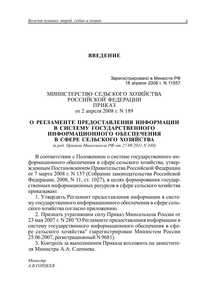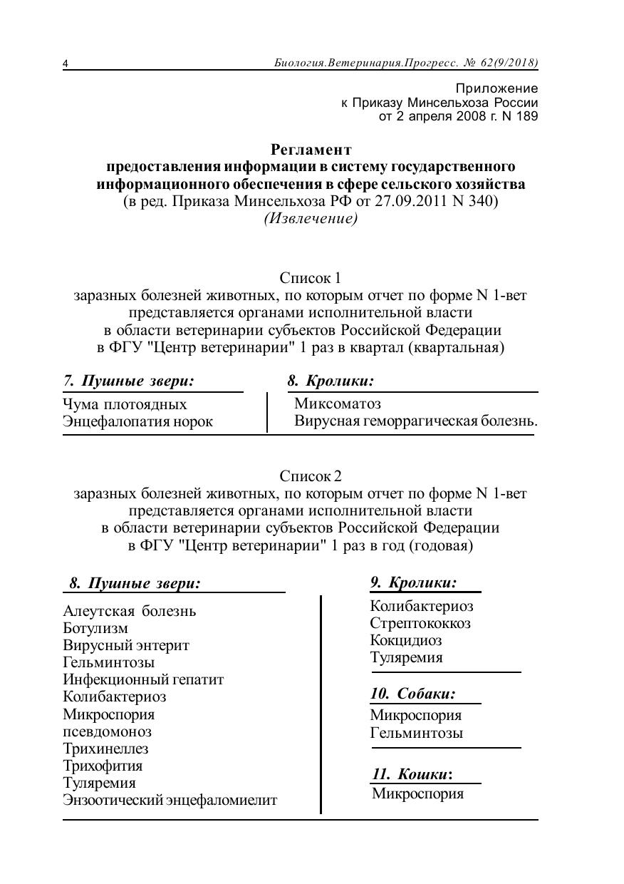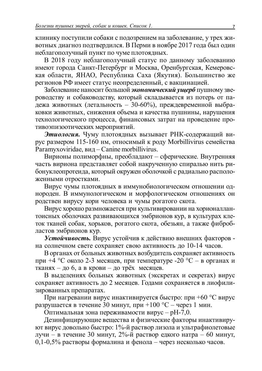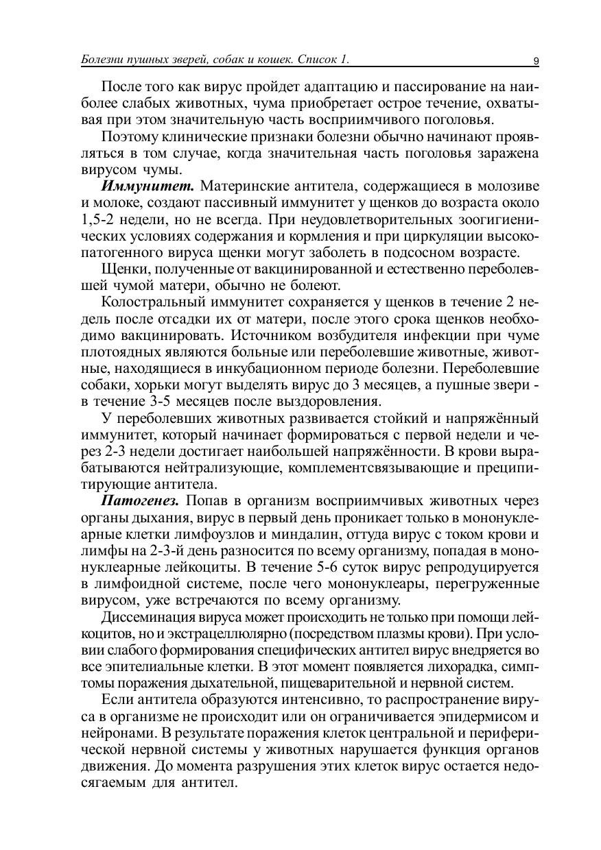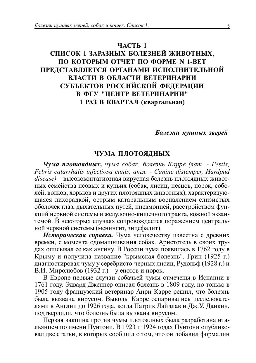 В девятом томе серии книг "Основы ветеринарного законодательства" приведена информация о болезнях пушных зверей, кроликов, собак и кошек: алеутской болезни, ботулизме, вирусном энтерите, гельминтозах, инфекционном гепатите, колибактериозе, микроспории, псевдомонозе, трихинеллезе, трихофитии, чуме плотоядных, энзоотическом энцефаломиелите, энцефалопатии норок, вирусной геморрагической болезни, кокцидиозе, миксоматозе, стрептококкозе и туляремии, - по которым, в соответствии с Приказом Минсельхоза РФ № 189, представляется отчет по форме N 1-вет, а именно: характеристика болезней и тексты действующих правил и инструкций по их профилактике и ликвидации.