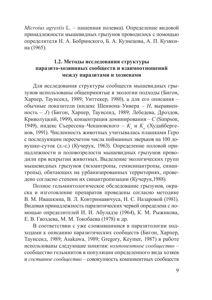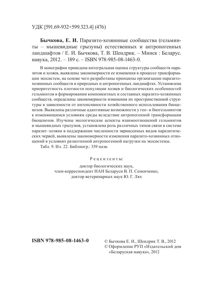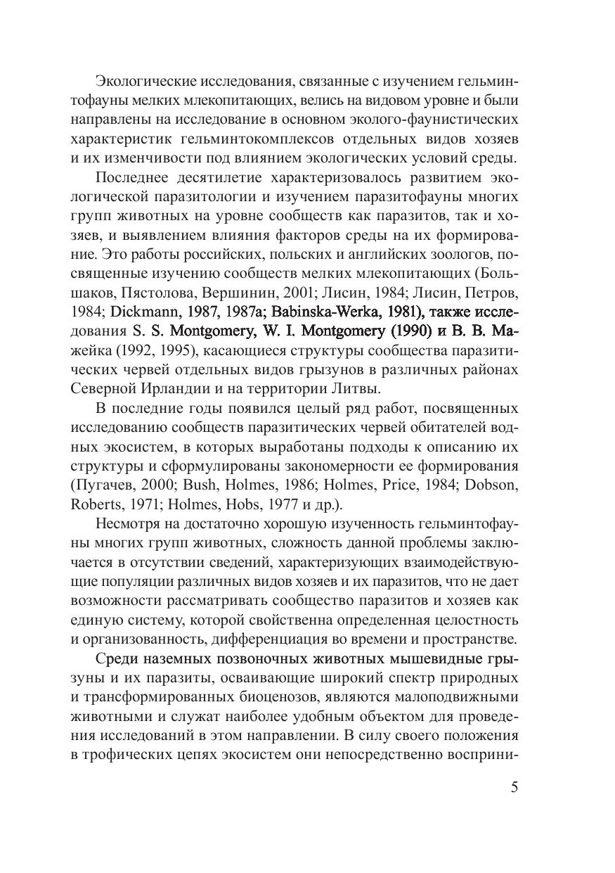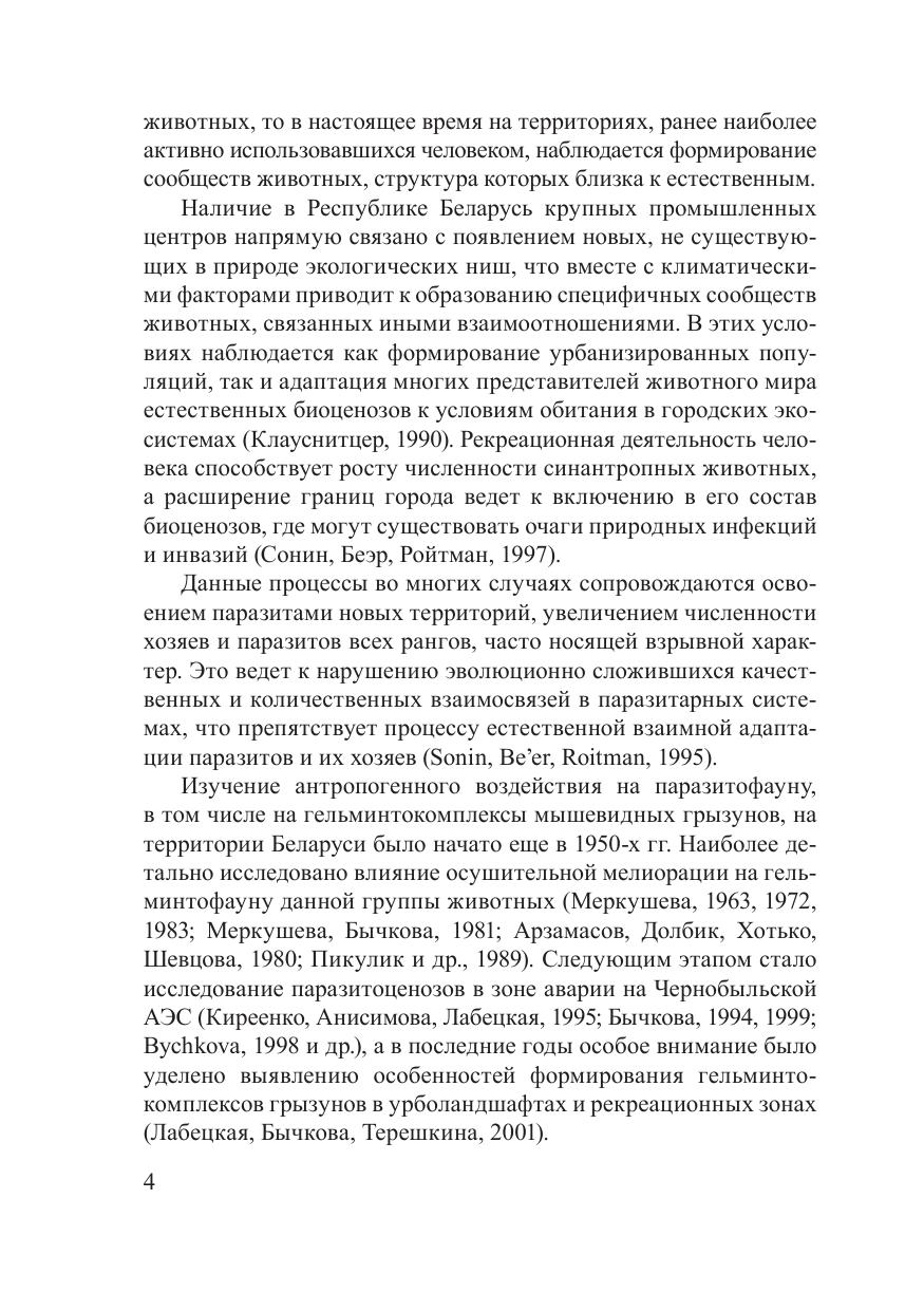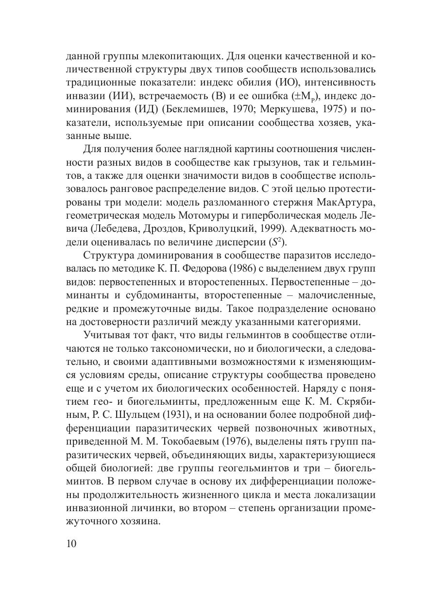 В монографии приведена интегральная оценка структуры сообществ паразитов и хозяев, выявлены закономерности ее изменения в процессе трансформации экосистем, на основе чего разработаны принципы организации паразитохозяинных сообществ в природных и антропогенных ландшафтах. Установлена приоритетность плотности популяции хозяев и биологических особенностей гельминтов в формировании компонентных и составных паразито-хозяинных сообществ, определены закономерности изменения их пространственной структуры в зависимости от интенсивности хозяйственного использования биоценозов. Выявлены различные адаптивные возможности у гео- и биогельминтов к изменяющимся условиям среды вследствие антропогенной трансформации биоценозов. Изучены экологические аспекты взаимоотношений гельминтов и мышевидных грызунов, установлена роль различных типов связи в системе паразит–хозяин в поддержании численности эвриксенных видов паразитических червей, выявлены закономерности изменения паразито-хозяинных отношений в условиях разнотипной антропогенной нагрузки на экосистемы.