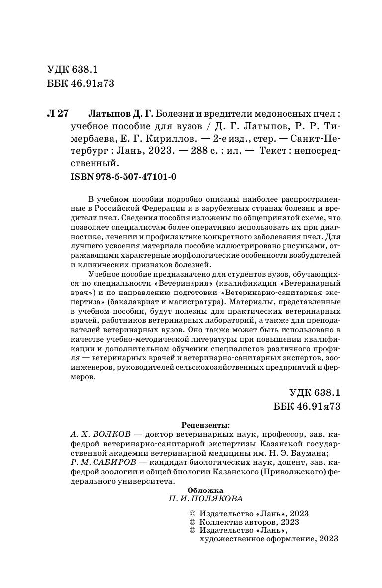 В учебном пособии подробно описаны наиболее распространенные в Российской Федерации и в зарубежных странах болезни и вредители пчел. Сведения пособия изложены по общепринятой схеме, что позволяет специалистам более оперативно использовать их при диагностике, лечении и профилактике конкретного заболевания пчел. Для лучшего усвоения материала пособие иллюстрировано рисунками, отражающими характерные морфологические особенности возбудителей, и клинических признаков болезней. Учебное пособие предназначено для студентов вузов, обучающихся по специальности «Ветеринария» (квалификация «Ветеринарный врач») и по направлению подготовки «Ветеринарно-санитарная экспертиза» (бакалавриат и магистратура). Материалы, представленные в учебном пособии, будут полезны для практических ветеринарных врачей, работников ветеринарных лабораторий, а также для преподавателей ветеринарных вузов. Оно также может быть использовано в качестве учебно-методической литературы при повышении квалификации и дополнительного обучения специалистов различного профиля – ветеринарных врачей и ветеринарно-санитарных экспертов, зооинженеров, руководителей сельскохозяйственных предприятий и фермеров.
