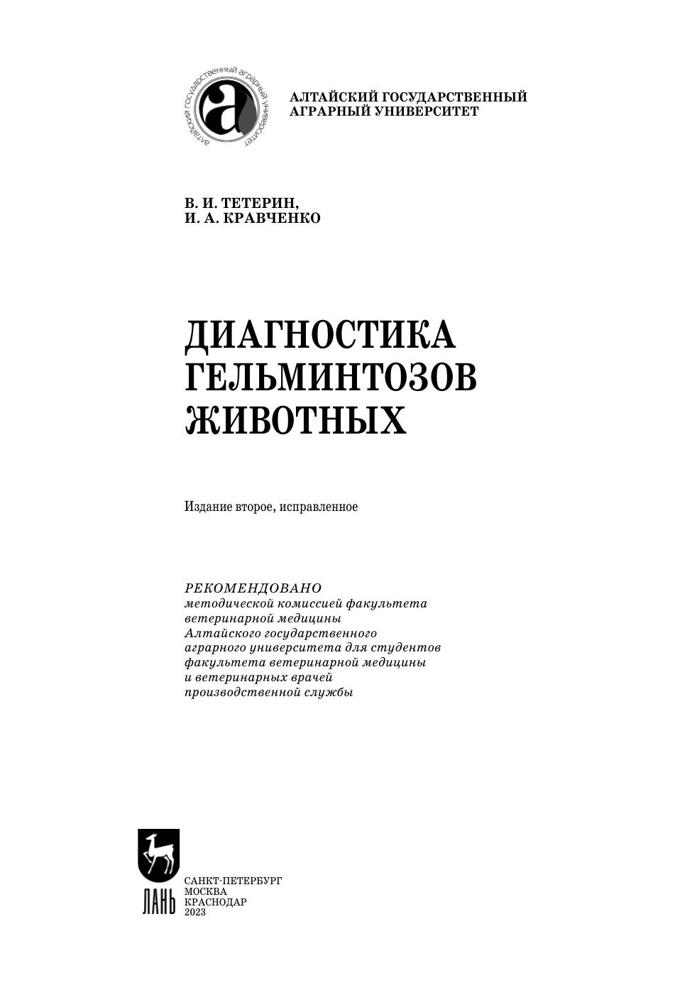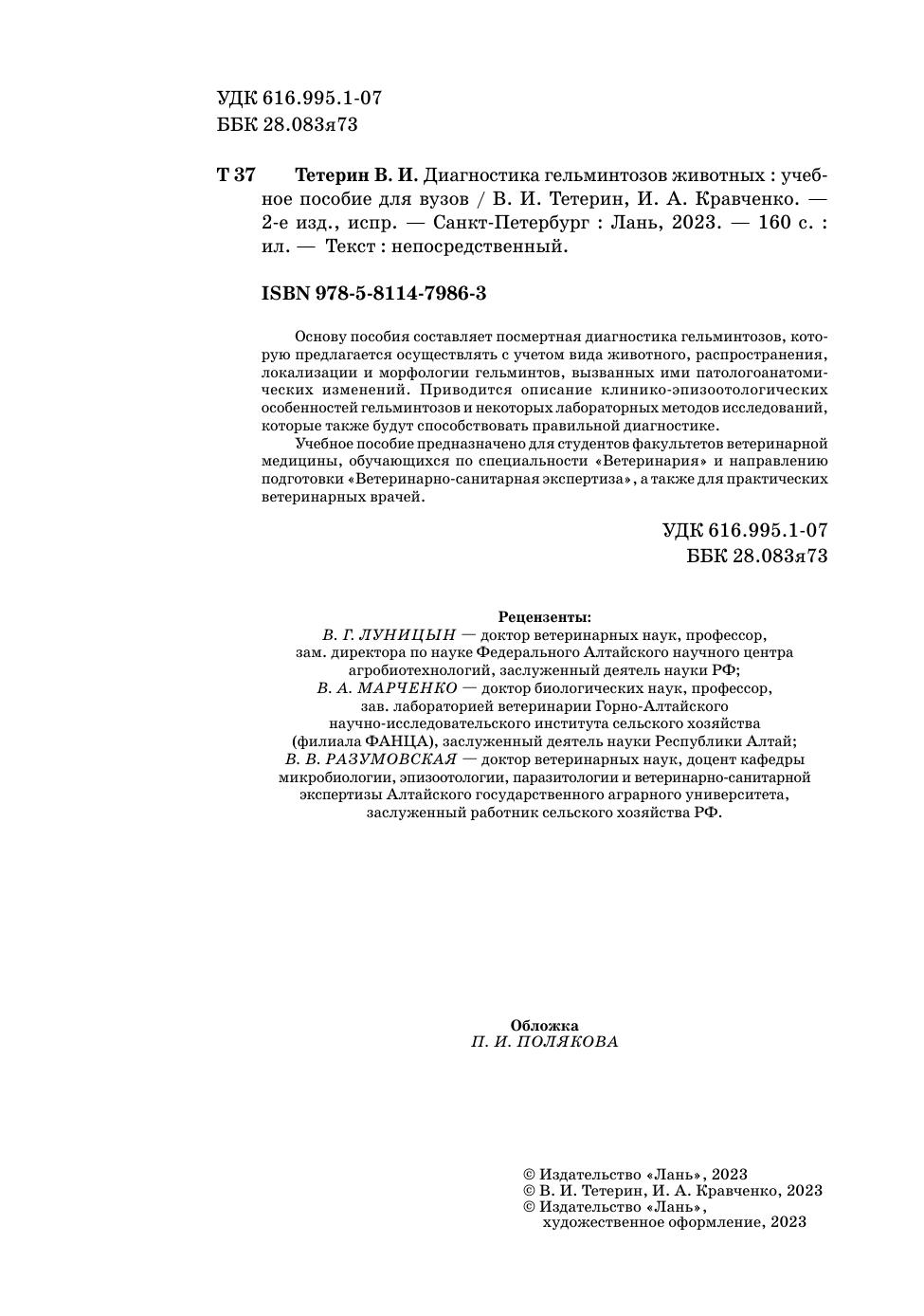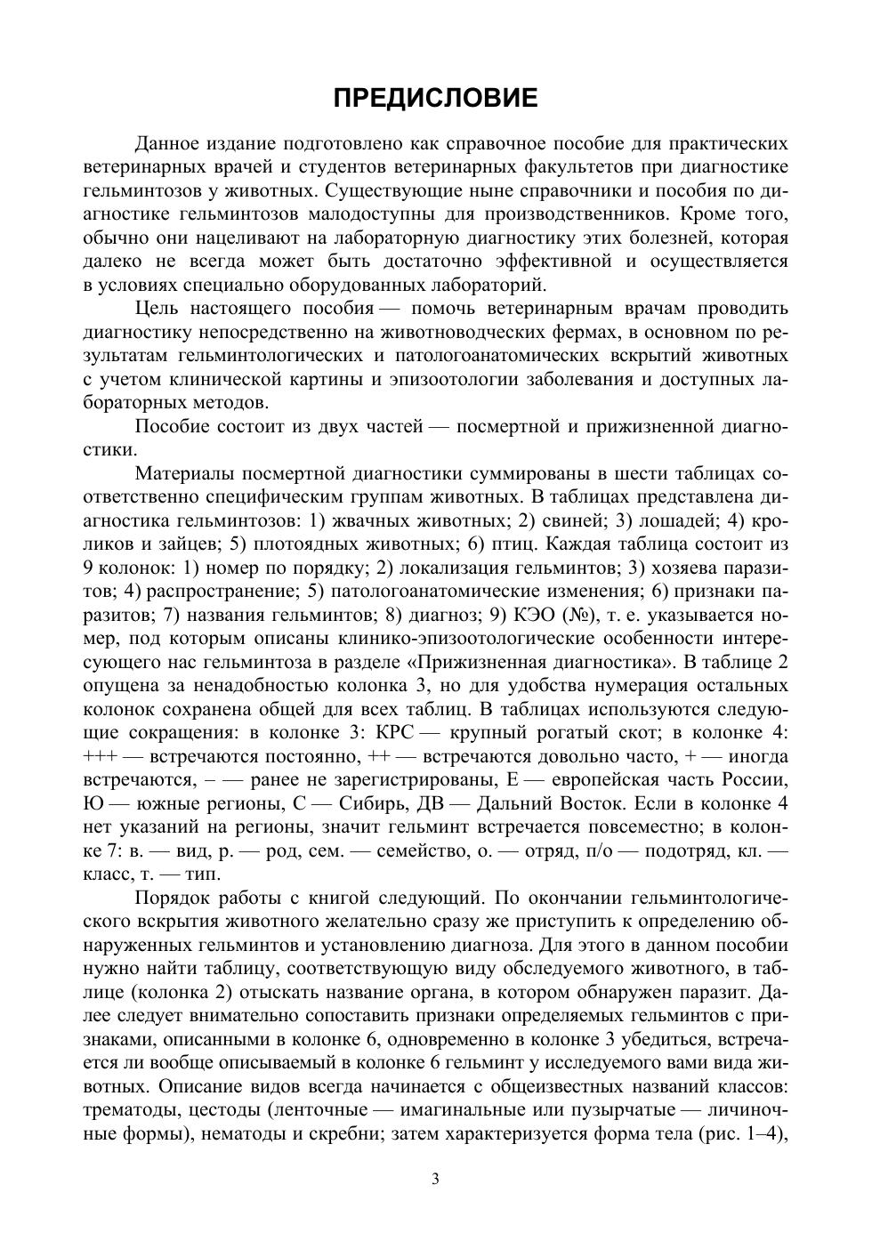 Основу пособия составляет посмертная диагностика гельминтозов, которую предлагается осуществлять с учетом вида животного, распространения, локализации и морфологии гельминтов, вызванных ими патологоанатомических изменений. Приводится описание клинико-эпизоотологических особенностей гельминтозов и некоторых лабораторных методов исследований, которые также будут способствовать правильной диагностике. Учебное пособие предназначено для студентов факультетов ветеринарной медицины по специальности «Ветеринария» и направлению подготовки «Ветеринарно-санитарная экспертиза», а также для практических ветеринарных врачей.