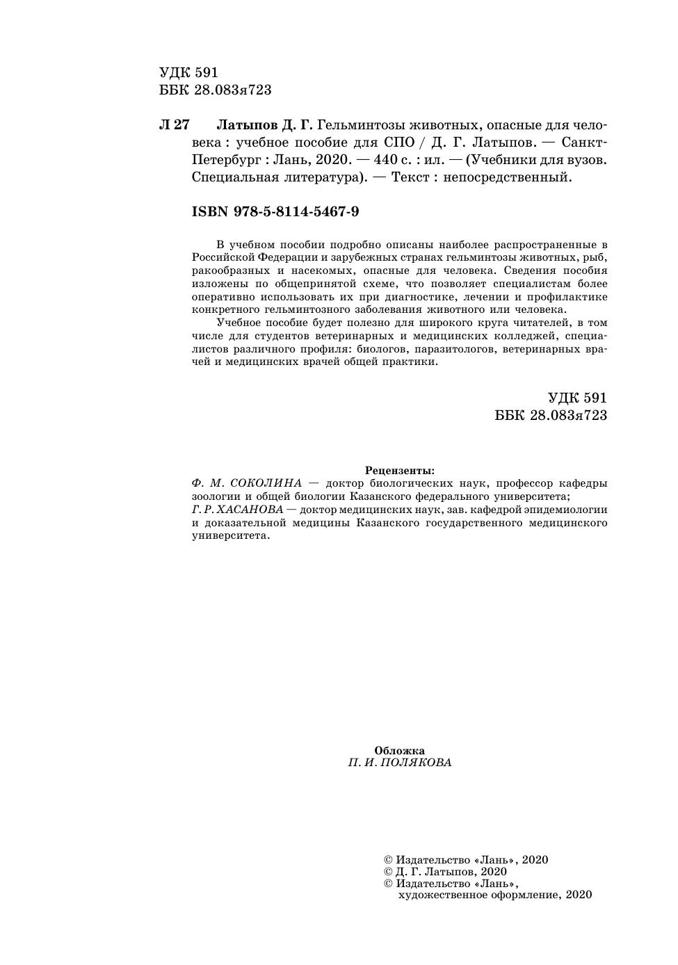 Учебное пособие будет полезно для широкого круга читателей, в том числе для студентов ветеринарных и медицинских колледжей, специалистам различного профиля: биологам, паразитологам, ветеринарным врачам и медицинским врачам общей практики.