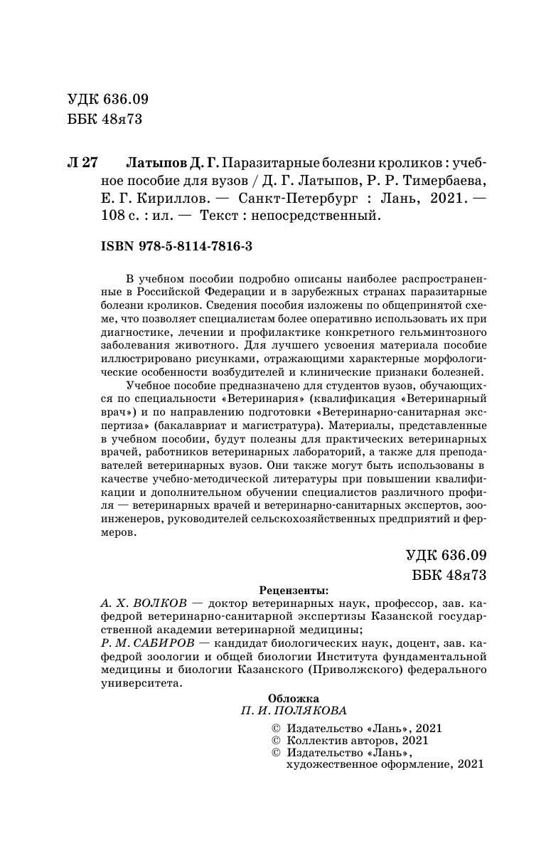 В учебном пособии подробно описаны наиболее распространенные в Российской Федерации и в зарубежных странах паразитарные болезни кроликов. Сведения пособия изложены по общепринятой схеме, что позволяет специалистам более оперативно использовать их при диагностике, лечении и профилактике конкретного гельминтозного заболевания животного. Для лучшего усвоения материала пособие иллюстрировано рисунками, отражающими характерные морфологические особенности возбудителей, и клинических признаков болезней.