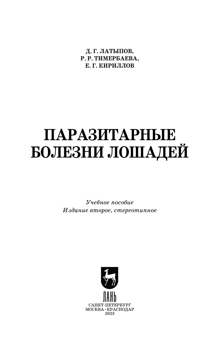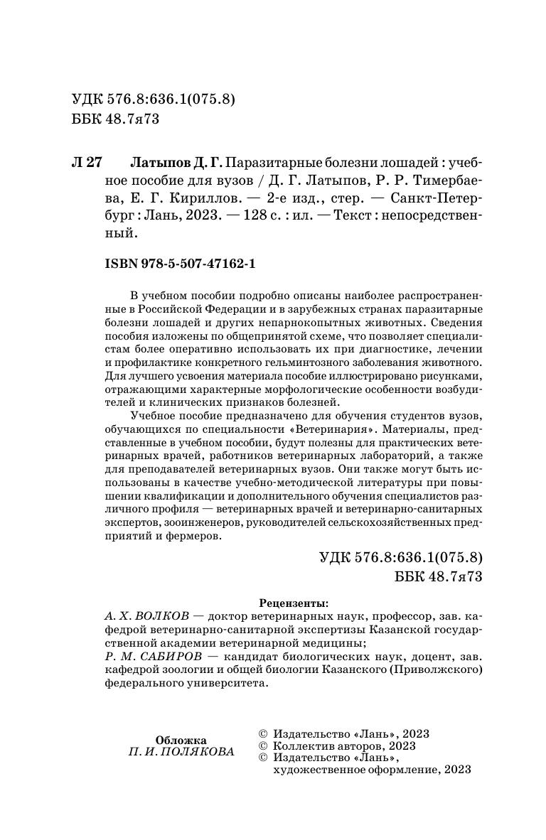 В учебном пособии подробно описаны наиболее распространенные в Российской Федерации и в зарубежных странах паразитарные болезни лошадей и других непарнокопытных животных. Сведения пособия изложены по общепринятой схеме, что позволяет специалистам более оперативно использовать их при диагностике, лечении и профилактике конкретного гельминтозного заболевания животного. Для лучшего усвоения материала пособие иллюстрировано рисунками, отражающими характерные морфологические особенности возбудителей и клинических признаков болезней. Учебное пособие предназначено для обучения студентов вузов, обучающихся по специальности «Ветеринария». Материалы, представленные в учебном пособии, будут полезны для практических ветеринарных врачей, работников ветеринарных лабораторий, а также для преподавателей ветеринарных вузов. Они также могут быть использованы в качестве учебно-методической литературы при повышении квалификации и дополнительного обучения специалистов различного профиля — ветеринарных врачей и ветеринарно-санитарных экспертов, зооинженеров, руководителей сельскохозяйственных предприятий и фермеров.