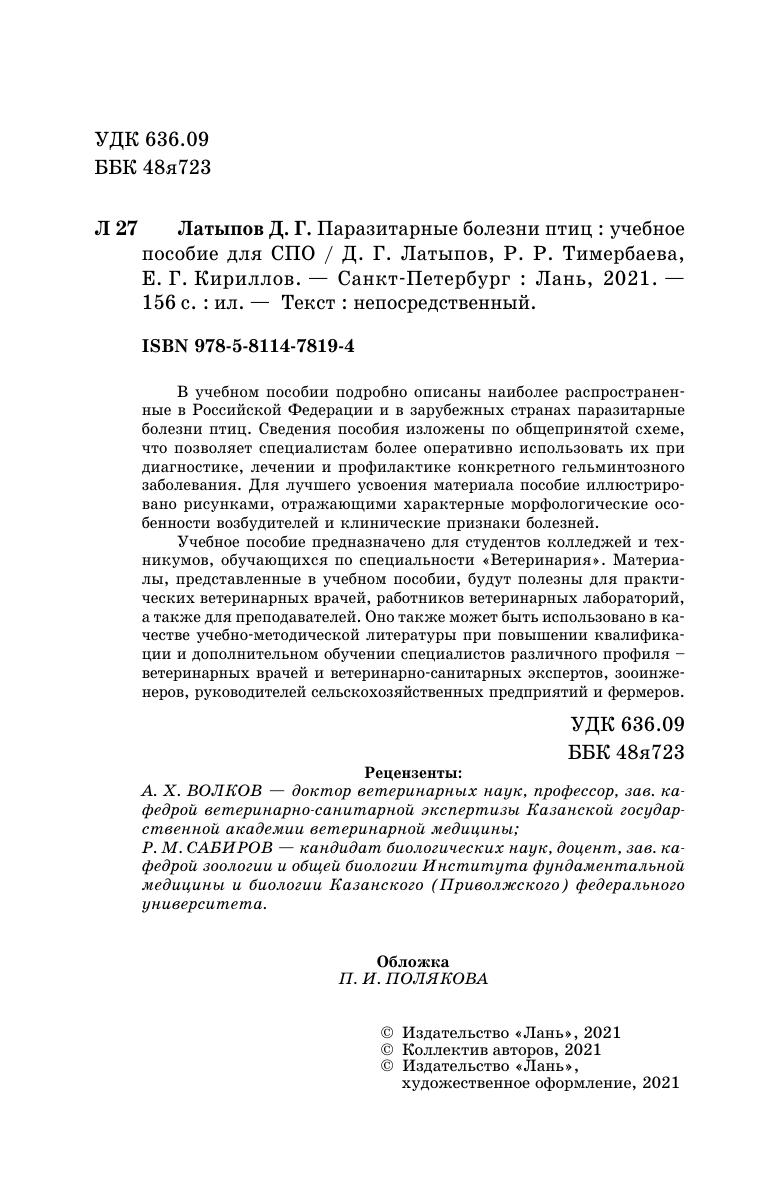В учебном пособии подробно описаны наиболее распространенные в Российской Федерации и в зарубежных странах паразитарные болезни птиц. Сведения пособия изложены по общепринятой схеме, что позволяет специалистам более оперативно использовать их при диагностике, лечении и профилактике конкретного гельминтозного заболевания. Для лучшего усвоения материала пособие иллюстрировано рисунками, отражающими характерные морфологические особенности возбудителей, и клинических признаков болезней.