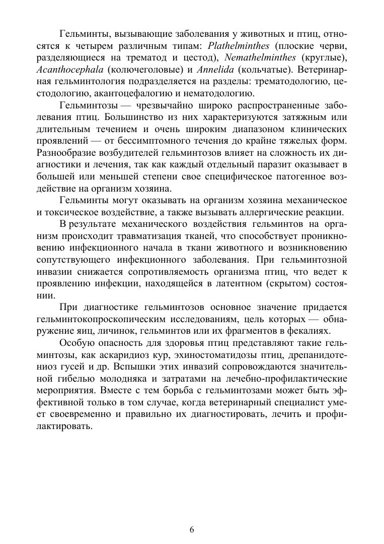 В учебном пособии подробно описаны наиболее распространенные в Российской Федерации и в зарубежных странах паразитарные болезни птиц. Сведения пособия изложены по общепринятой схеме, что позволяет специалистам более оперативно использовать их при диагностике, лечении и профилактике конкретного гельминтозного заболевания. Для лучшего усвоения материала пособие иллюстрировано рисунками, отражающими характерные морфологические особенности возбудителей, и клинических признаков болезней.
