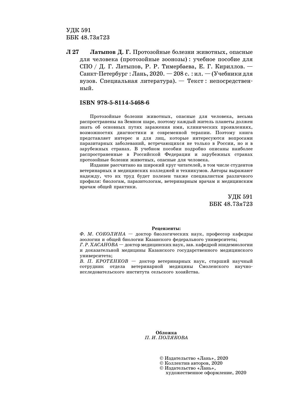 Издание рассчитано на широкий круг читателей, в том числе студентов ветеринарных и медицинских колледжей и техникумов. Авторы выражают надежду, что их труд будет полезен также специалистам различного профиля: биологам, паразитологам, ветеринарным врачам и медицинским врачам общей практики.