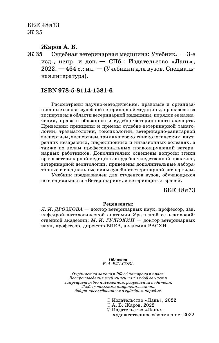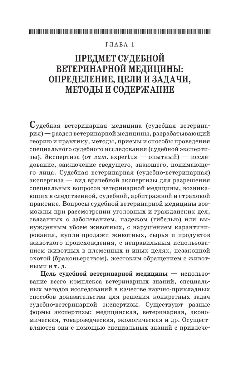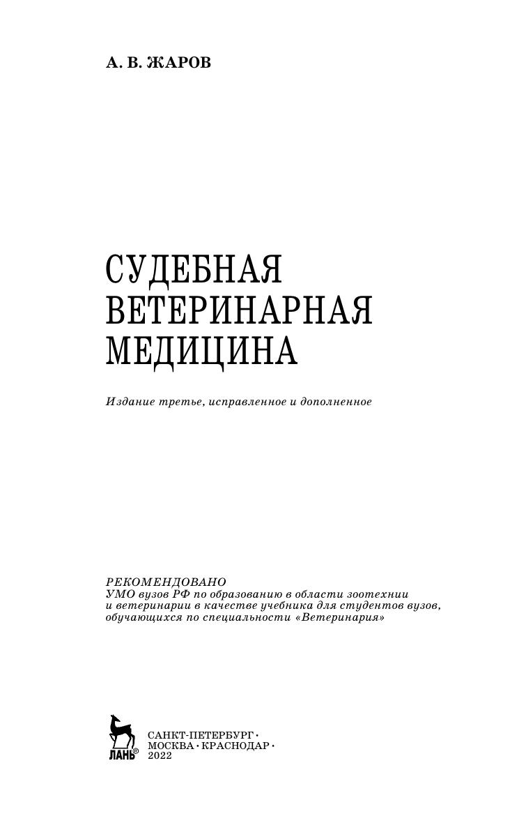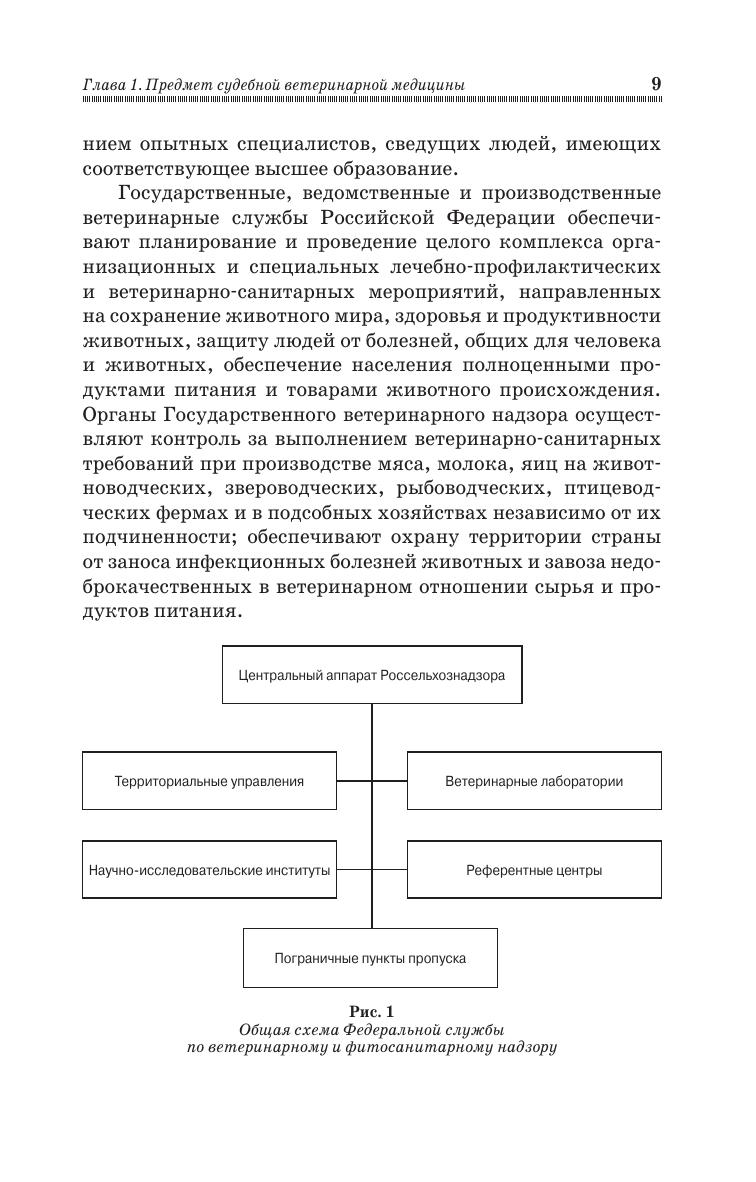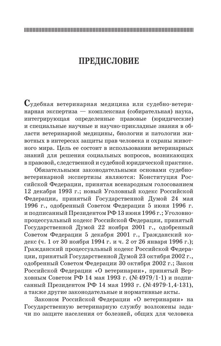 Рассмотрены научно-методические, правовые и организационные основы судебной ветеринарной медицины, производства экспертизы в области ветеринарной медицины, порядок ее назначения, права и обязанности судебно-ветеринарного эксперта. Приведены принципы и приемы судебно-ветеринарной танатологии, травматологии, токсикологии, ветеринарно-санитарной экспертизы, экспертизы при акушерско-гинекологических, внутренних незаразных, инфекционных и инвазионных болезнях, а также по делам профессиональных правонарушений ветеринарных работников. Дополнительно освещены вопросы этики врача ветеринарной медицины в судебно-следственной практике, ветеринарной деонтологии, приведены дополнительные лабораторные и специальные виды судебно-ветеринарной экспертизы. Учебник предназначен для студентов вузов, обучающихся по специальности «Ветеринария», и ветеринарных врачей.
