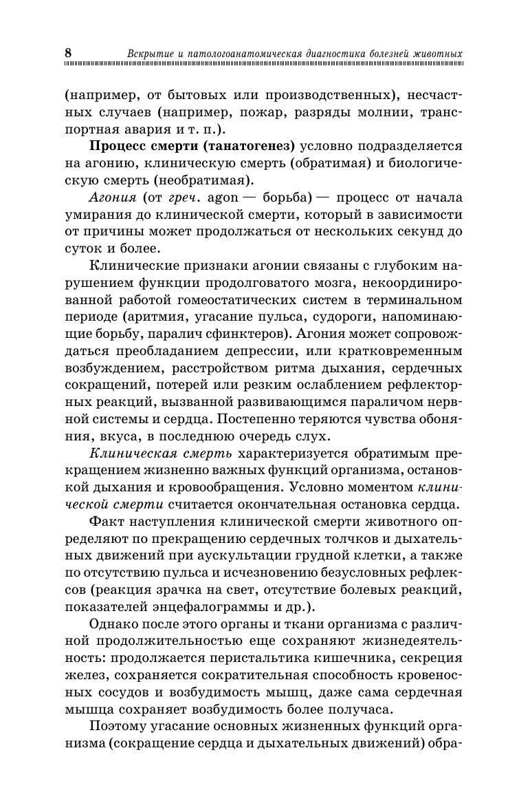 В учебном пособии подробно описаны техника и способы патологоанатомического вскрытия разных видов сельскохозяйственных животных, методы утилизации трупов, меры общественной и личной безопасности при вскрытии и уничтожении трупов, правила протоколирования результатов вскрытия, взятия и пересылки патологического материала для лабораторных исследований. В конце пособия приведены наиболее часто встречающиеся патологоанатомические диагнозы при незаразных и инфекционных болезнях животных. Учебное пособие составлено в соответствии с программой курса «Патологическая анатомия, секционный курс и судебно-ветеринарная экспертиза», с учетом рекомендаций Министерством образования РФ. Его структура и содержание соответствуют требованиям Федерального государственного образовательного стандарта 3-го поколения по специальности «Ветеринария» по квалификации специалиста — ветеринарный врач. Данное пособие предназначено для преподавателей, студентов факультета ветеринарной медицины, а также специалистов, работающих в области ветеринарии.