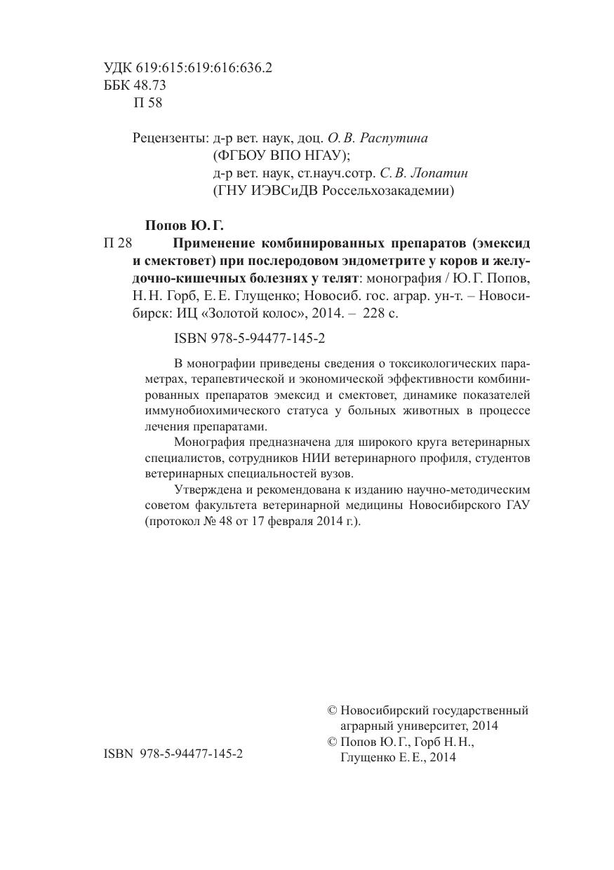 В монографии приведены сведения о токсикологических параметрах, терапевтической и экономической эффективности комбинированных препаратов эмексид и смектовет, динамике показателей иммунобиохимического статуса у больных животных в процессе лечения препаратами. Монография предназначена для широкого круга ветеринарных специалистов, сотрудников НИИ ветеринарного профиля, студентов ветеринарных специальностей вузов.