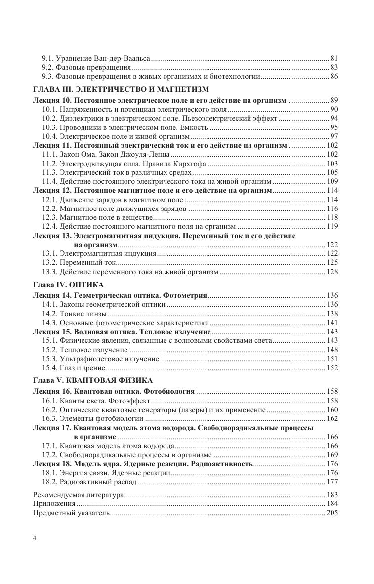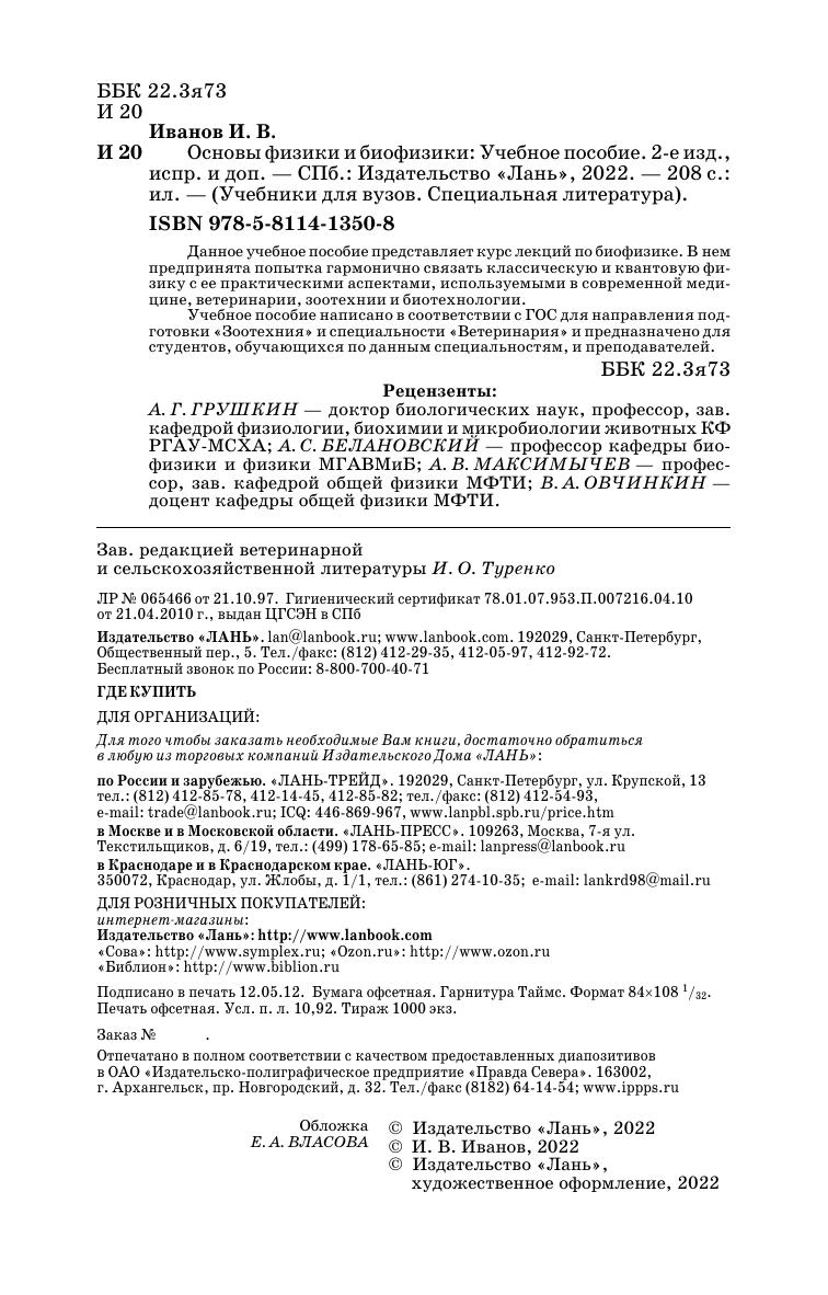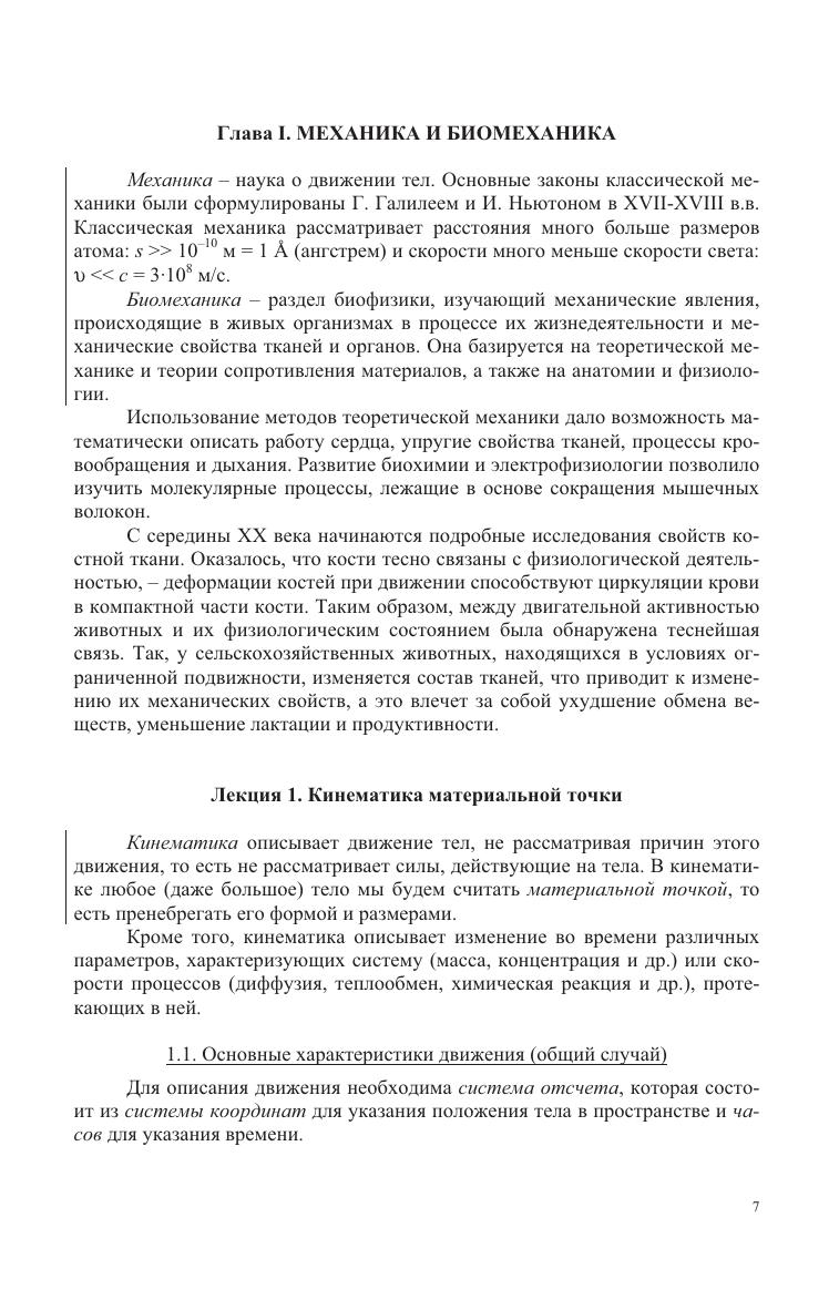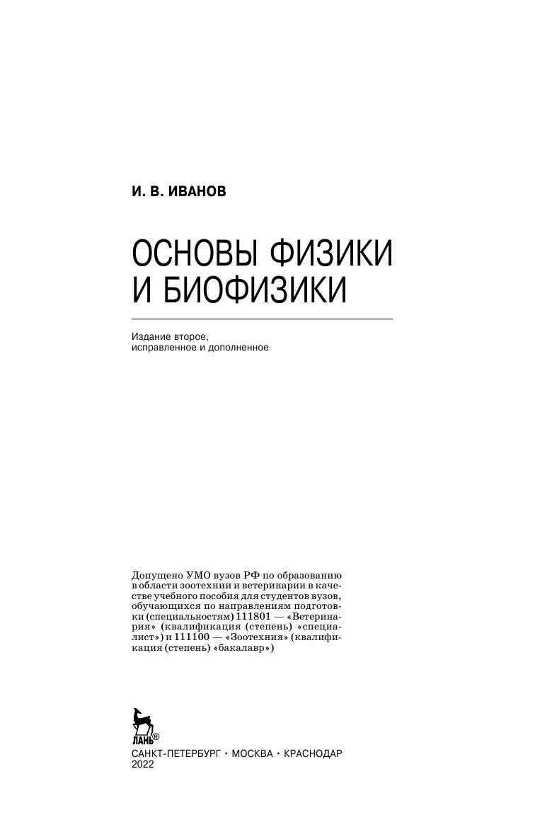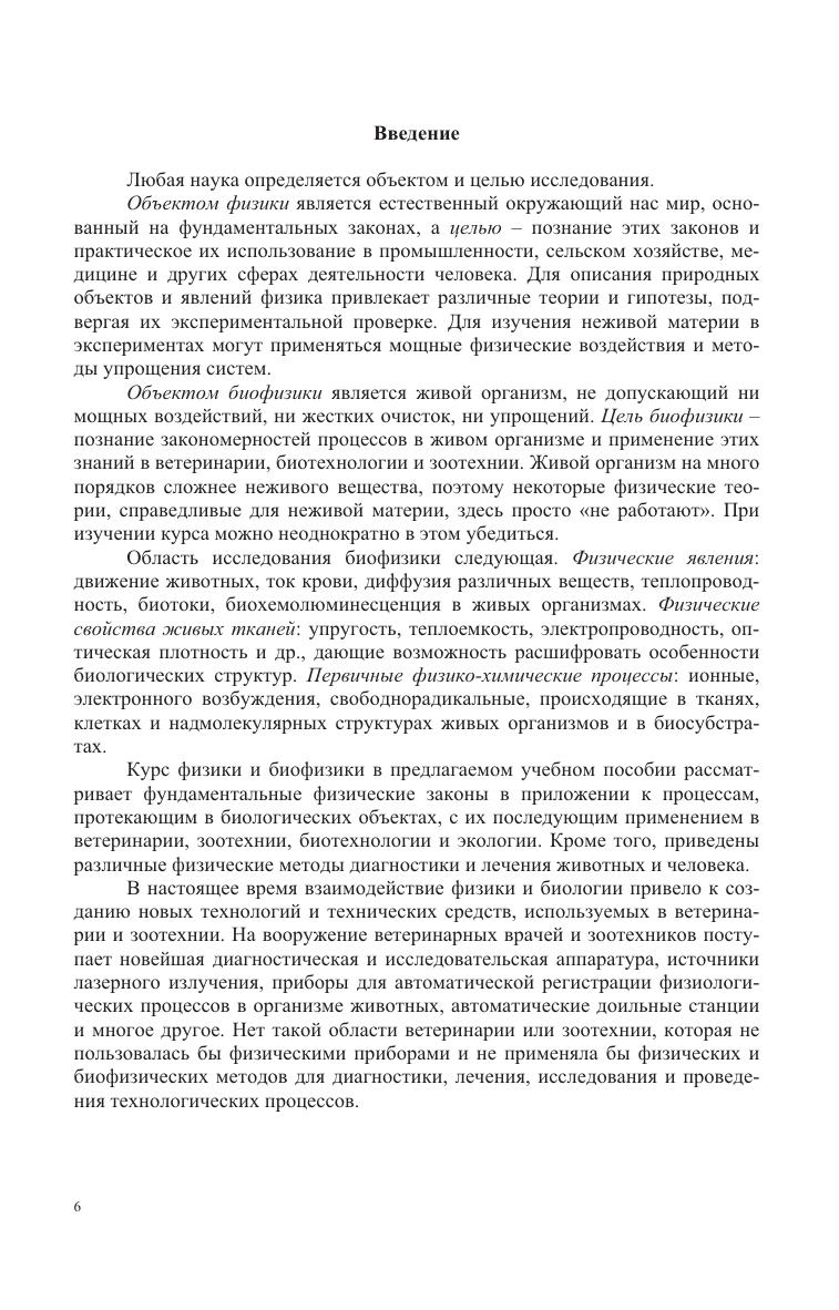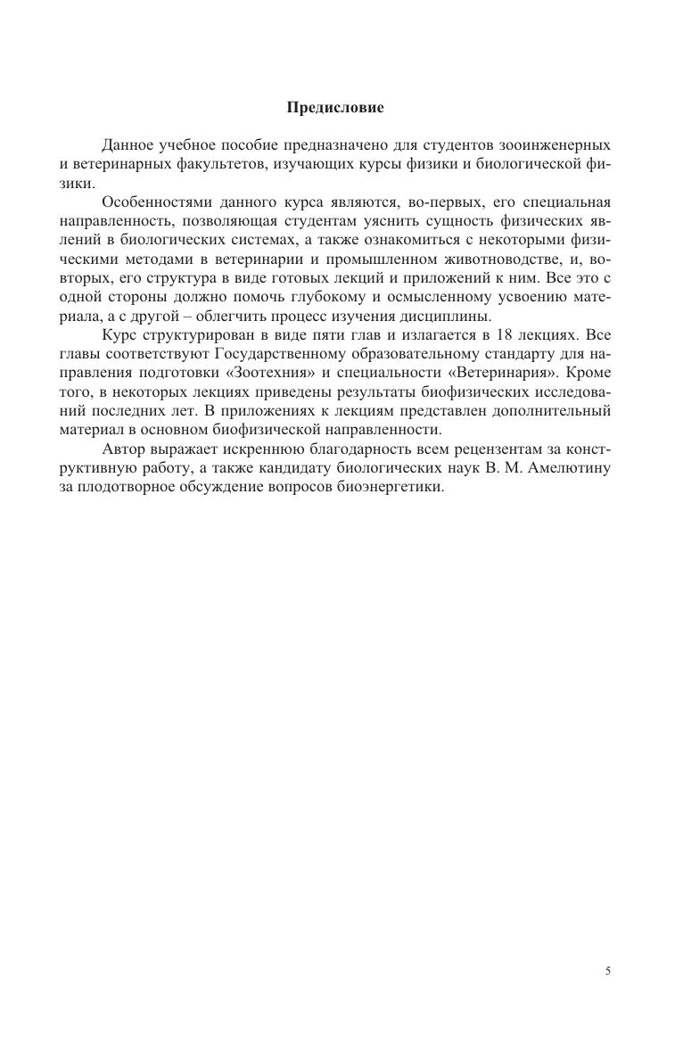 Данное учебное пособие представляет курс лекций по биофизике. В нем предпринята попытка гармонично связать классическую и квантовую физику с ее практическими аспектами, используемыми в современной медицине, ветеринарии, зоотехнии и биотехнологии. Рассмотрены основные законы движения твердого тела и его механические свойства, должное внимание уделено биореологии, механическим колебаниям и акустике. Приведены основные уравнения гидродинамики, при этом особо выделен вопрос движения крови в сосудах – гемодинамика. Рассмотрены законы термодинамики и яв-ления переноса в живом организме. Даны необходимые сведения из теории электричества и магнетизма, оптики и квантовой физики, относящиеся к процессам, протекающим в живом организме. В рамках квантовой физики рассмотрены свойства свободных радикалов и электронных возбужденных состояний и их значение для биологии и медицины. Учебное пособие написано в соответствии с ГОС для направления подготовки «зоотехния» и специальности «ветеринария» и предназначено для студентов, обучающихся по данным специальностям, и преподавателей.