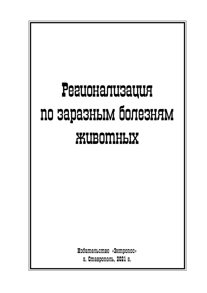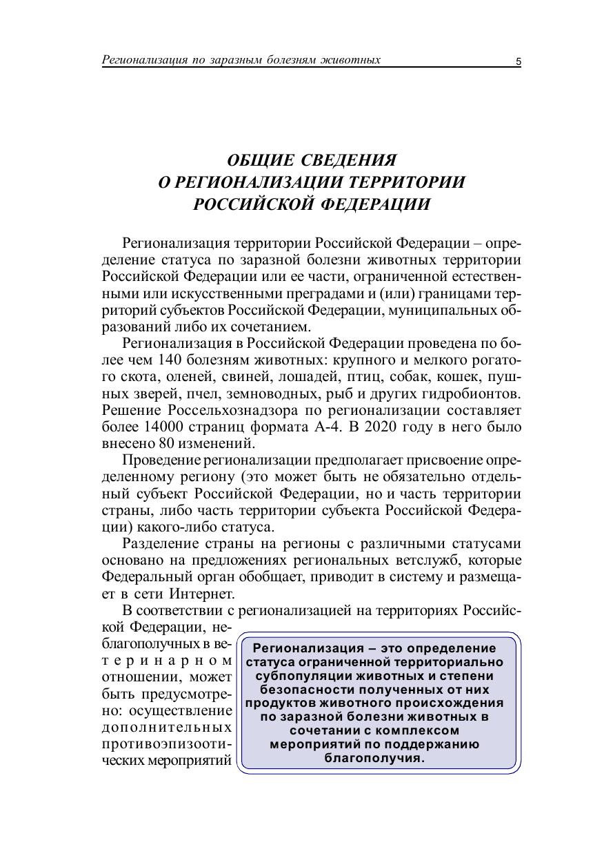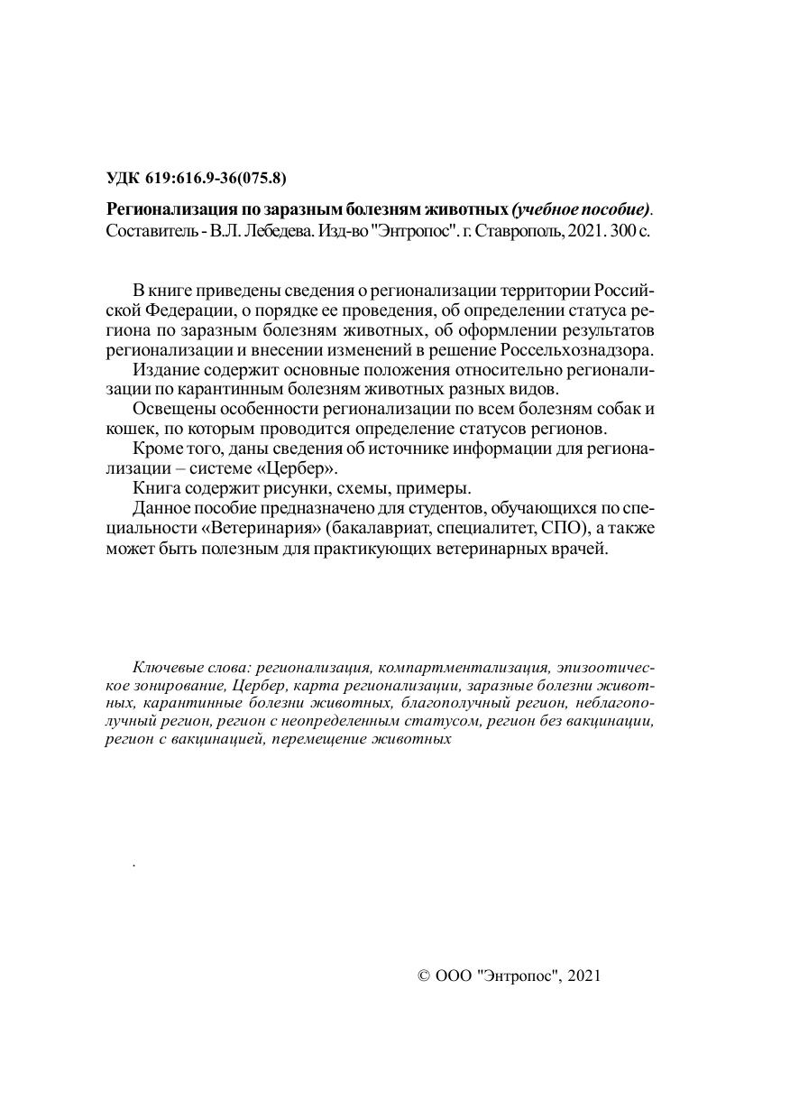 В книге приведены сведения о регионализации территории Российской Федерации, о порядке ее проведения, об определении статуса региона по заразным болезням животных, об оформлении результатов регионализации и внесении изменений в решение Россельхознадзора. Издание содержит основные положения относительно регионализации по карантинным болезням животных разных видов. Освещены особенности регионализации по всем болезням собак и кошек, по которым проводится определение статусов регионов. Кроме того, даны сведения об источнике информации для регионализации – системе «Цербер». Книга содержит рисунки, схемы, примеры. Данное пособие предназначено для студентов, обучающихся по специальности «Ветеринария» (бакалавриат, специалитет, СПО), а также может быть полезным для практикующих ветеринарных врачей.