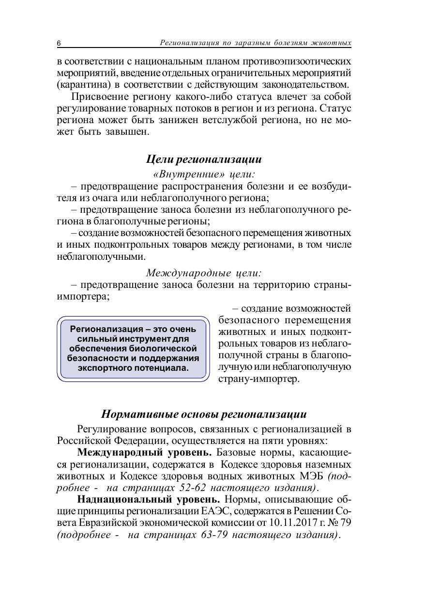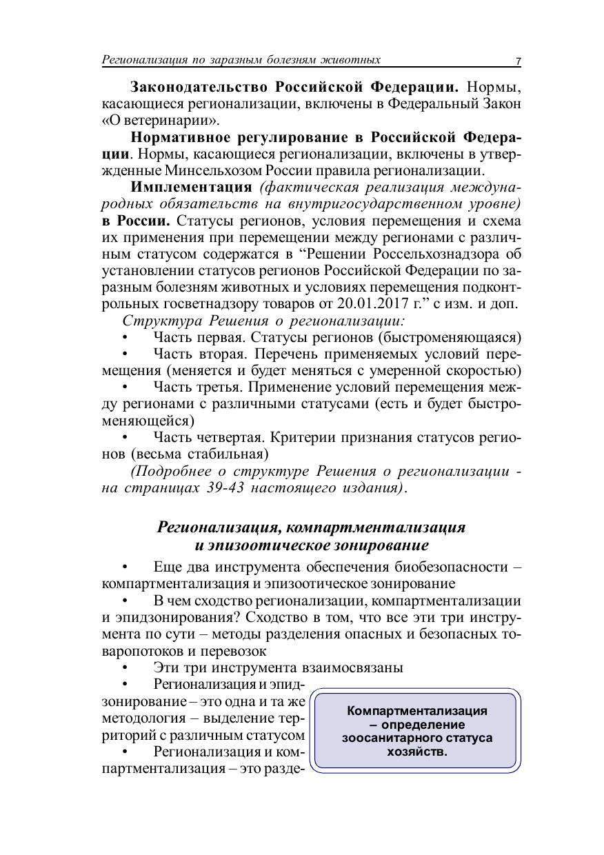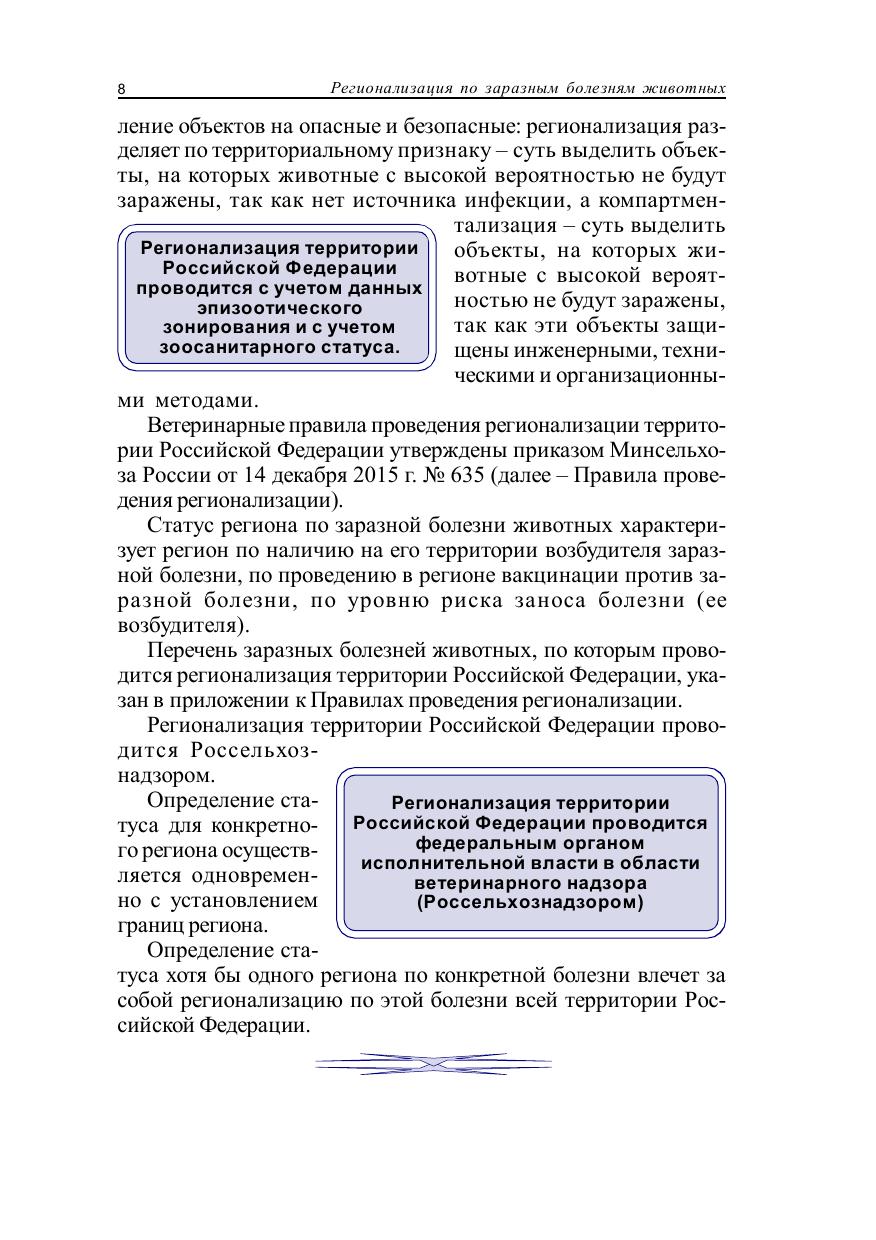В книге приведены сведения о регионализации территории Российской Федерации, о порядке ее проведения, об определении статуса региона по заразным болезням животных, об оформлении результатов регионализации и внесении изменений в решение Россельхознадзора. Издание содержит основные положения относительно регионализации по карантинным болезням животных разных видов. Освещены особенности регионализации по всем болезням собак и кошек, по которым проводится определение статусов регионов. Кроме того, даны сведения об источнике информации для регионализации – системе «Цербер». Книга содержит рисунки, схемы, примеры. Данное пособие предназначено для студентов, обучающихся по специальности «Ветеринария» (бакалавриат, специалитет, СПО), а также может быть полезным для практикующих ветеринарных врачей.