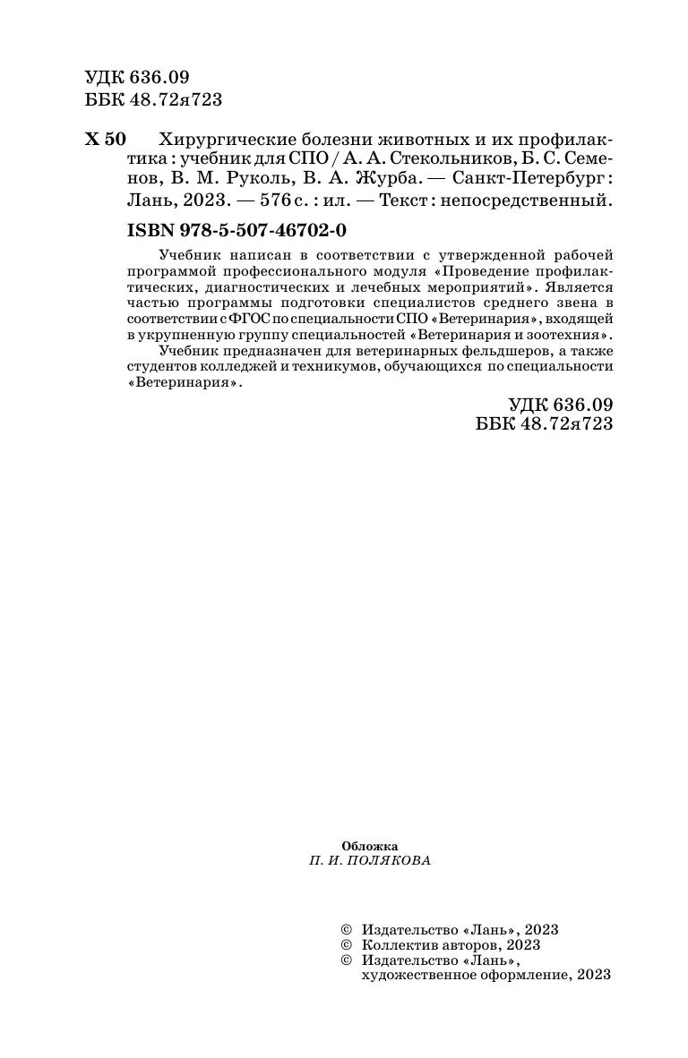 Учебник написан в соответствии с утвержденной рабочей программой профессионального модуля «Проведение профилактических, диагностических и лечебных мероприятий». Является частью программы подготовки специалистов среднего звена в соответствии с ФГОС по специальности СПО «Ветеринария», входящей в укрупненную группу специальностей «Ветеринария и зоотехния». Учебник предназначен для ветеринарных фельдшеров, а также студентов колледжей и техникумов, обучающихся по специальности «Ветеринария».