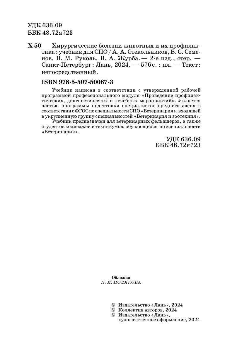 Учебник написан в соответствии с утвержденной рабочей программой профессионального модуля «Проведение профилактических, диагностических и лечебных мероприятий». Является частью программы подготовки специалистов среднего звена в соответствии с ФГОС по специальности СПО «Ветеринария», входящей в укрупненную группу специальностей «Ветеринария и зоотехния». Учебник предназначен для ветеринарных фельдшеров, а также студентов колледжей и техникумов, обучающихся по специальности «Ветеринария».