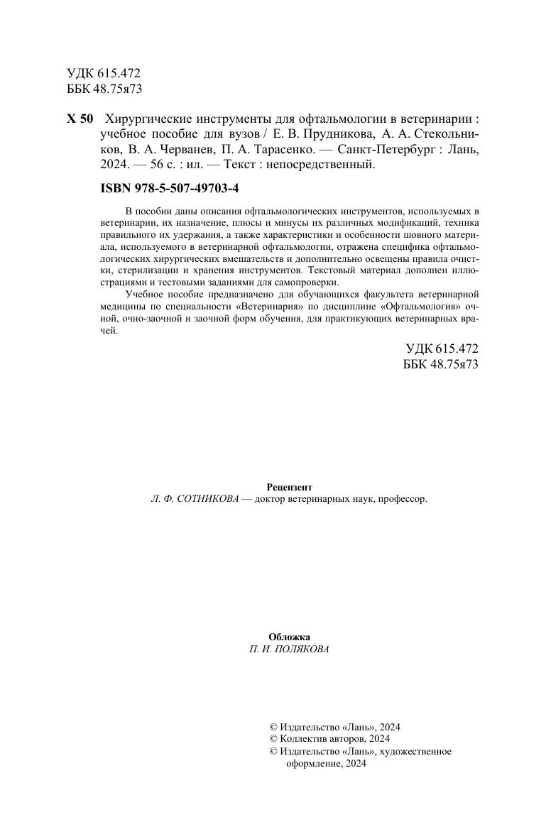 В пособии даны описания офтальмологических инструментов, используемых в ветеринарии, их назначение, плюсы и минусы их различных модификаций, техника правильного их удержания, а также характеристики и особенности шовного материала, используемого в ветеринарной офтальмологии, отражена специфика офтальмологических хирургических вмешательств и дополнительно освещены правила очистки, стерилизации и хранения инструментов. Текстовый материал дополнен иллюстрациями и тестовыми заданиями для самопроверки. Учебное пособие предназначено для обучающихся факультета ветеринарной медицины по специальности «Ветеринария» по дисциплине «Офтальмология» очной, очно-заочной и заочной форм обучения, для практикующих ветеринарных врачей.