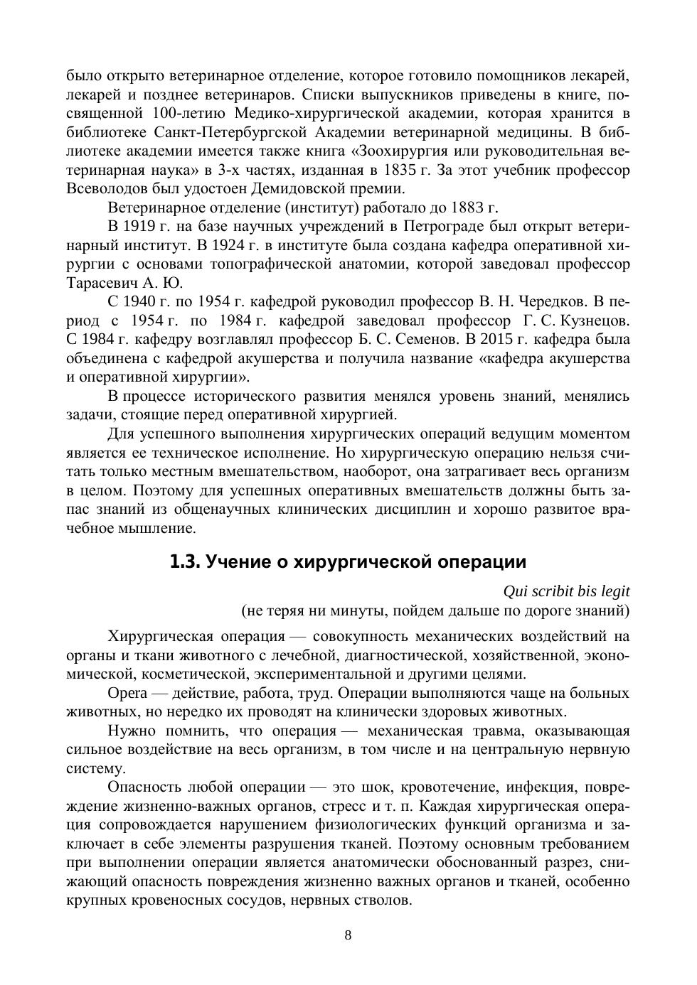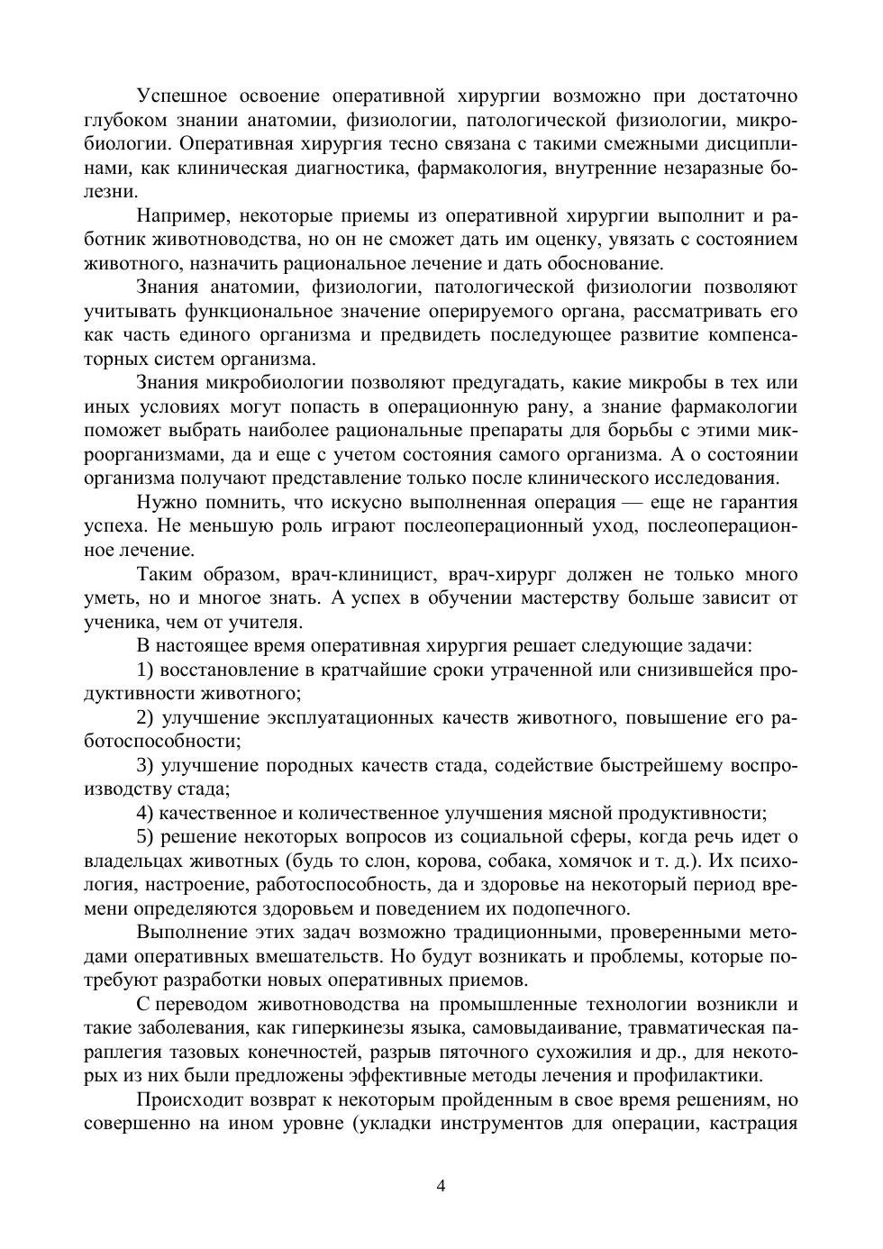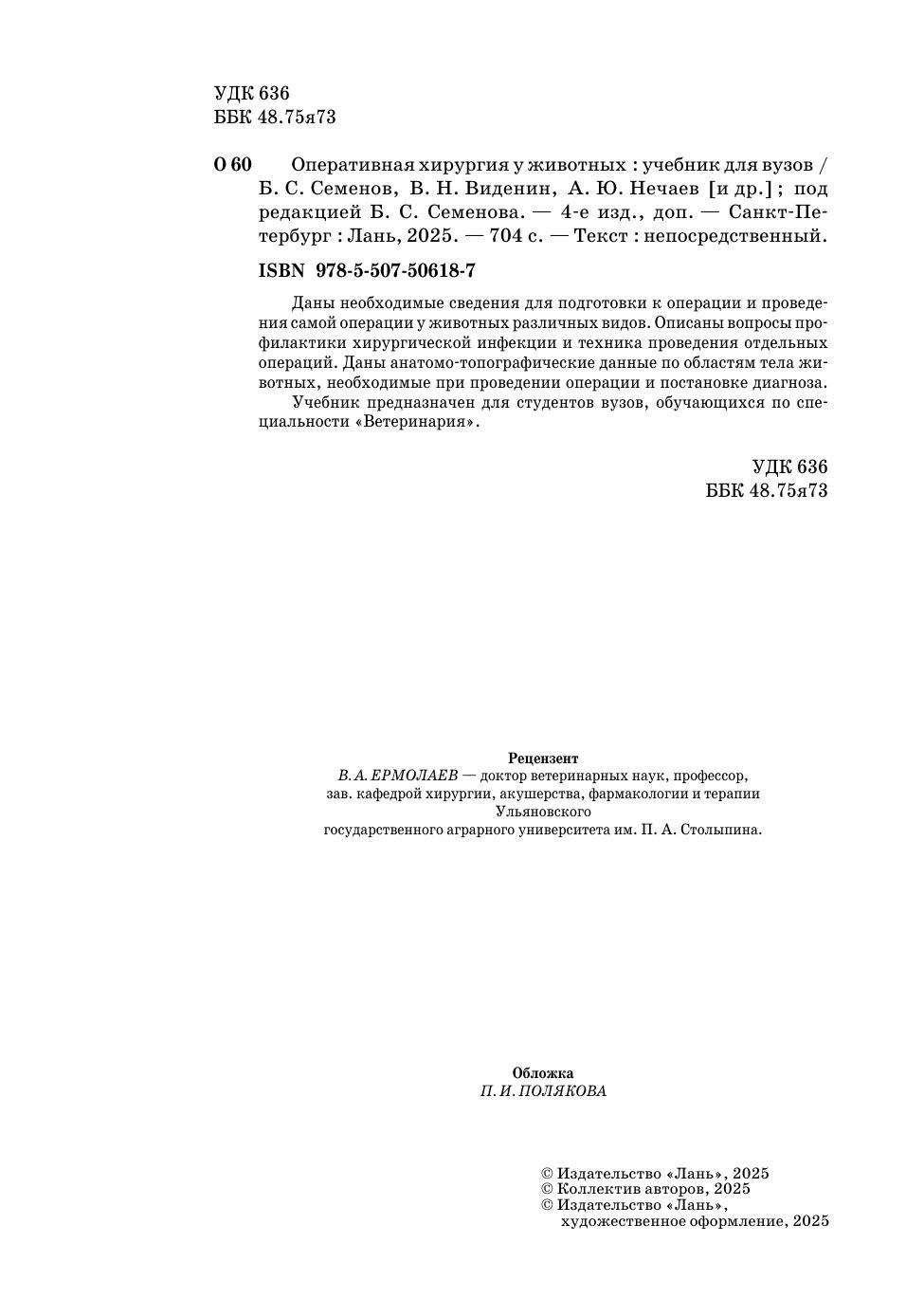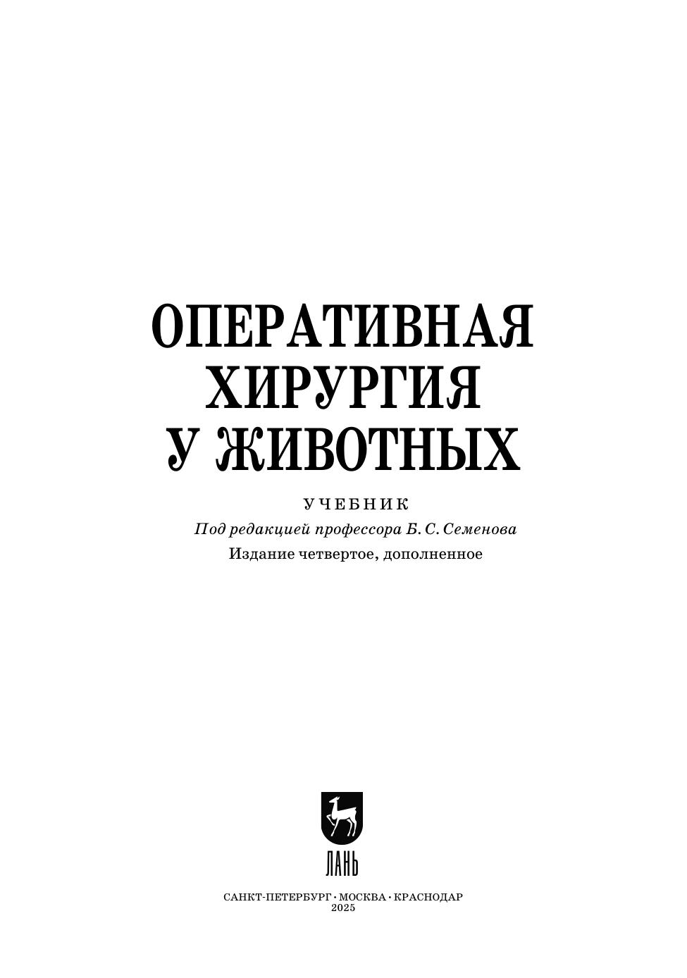 Даны необходимые сведения для подготовки к операции и проведения самой операции у животных различных видов. Описаны вопросы про-филактики хирургической инфекции и техника проведения отдельных операций. Даны анатомо-топографические данные по областям тела жи-вотных, необходимые при проведении операции и постановке диагноза. Учебник предназначен для студентов вузов, обучающихся по спе-циальности «Ветеринария».