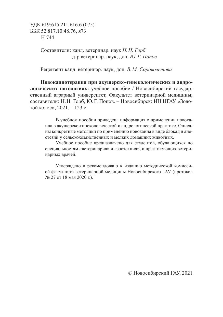 В учебном пособии приведена информация о применении новокаина в акушерско-гинекологической и андрологической практике. Описаны конкретные методики по применению новокаина в виде блокад и анестезий у сельскохозяйственных и мелких домашних животных. Учебное пособие предназначено для студентов, обучающихся по специальностям «ветеринария» и «зоотехния», и практикующих ветеринарных врачей.