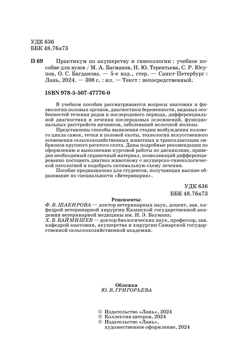 В учебном пособии рассматриваются вопросы анатомии и физиологии половых органов, диагностики беременности, видовых особенностей течения родов и послеродового периода, дифференциальной диагностики и лечения послеродовых осложнений, функциональных расстройств яичников, заболеваний молочной железы. Представлены способы выявления стадии возбуждения полового цикла самок, течки и половой охоты, технологии искусственного осеменения сельскохозяйственных животных и трансплантации эмбрионов крупного рогатого скота. Даны подробные рекомендации по оформлению и выполнению курсовой работы по дисциплине, приведен необходимый справочный материал, позволяющий дифференцированно поставить диагноз животному с акушерско-гинекологической патологией и подобрать оптимальную схему лечения.Пособие предназначено для студентов, получающих высшее образование по специальности «Ветеринария».