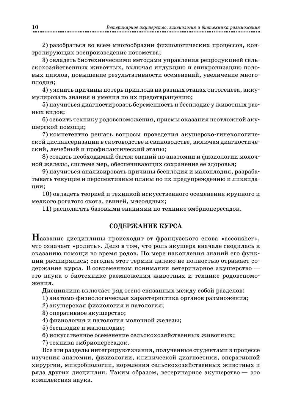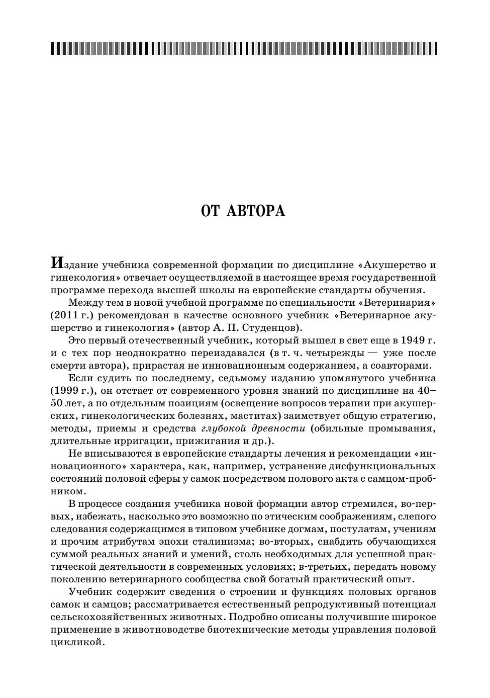 Учебник соответствует Государственному образовательному стандарту, утвержденному Министерством образования и науки РФ, и примерной программе по дисциплине "Акушерство и гинекология". Предназначен для студентов высших учебных заведений, обучающихся по направлению подготовки (специальности) "Ветеринария", квалификация (степень) выпускника "специалист". Помимо основного назначения, он может быть использован в качестве практического пособия ветеринарными специалистами государственной ветеринарной службы, сельхозпредприятий, ветеринарных клиник.